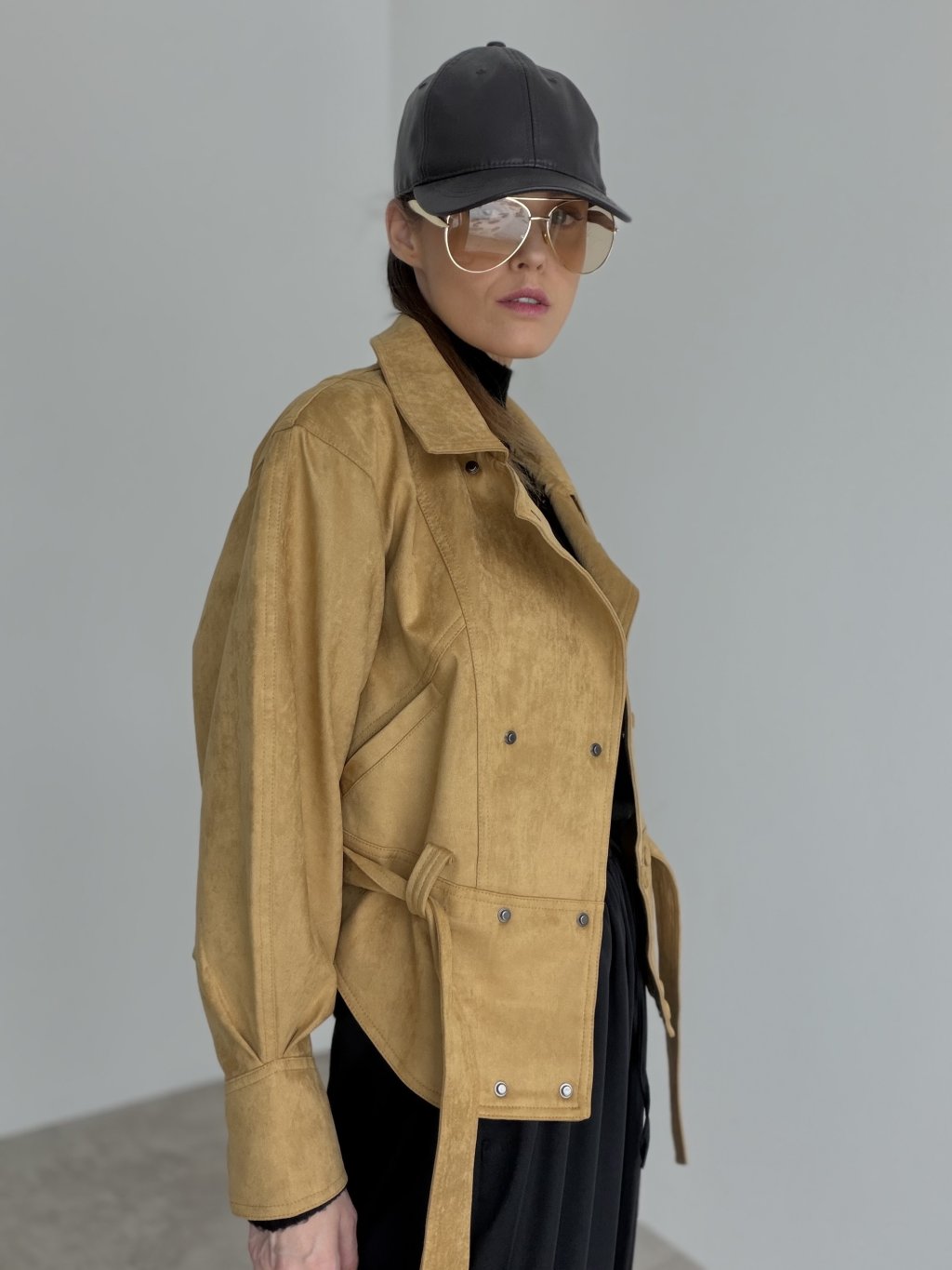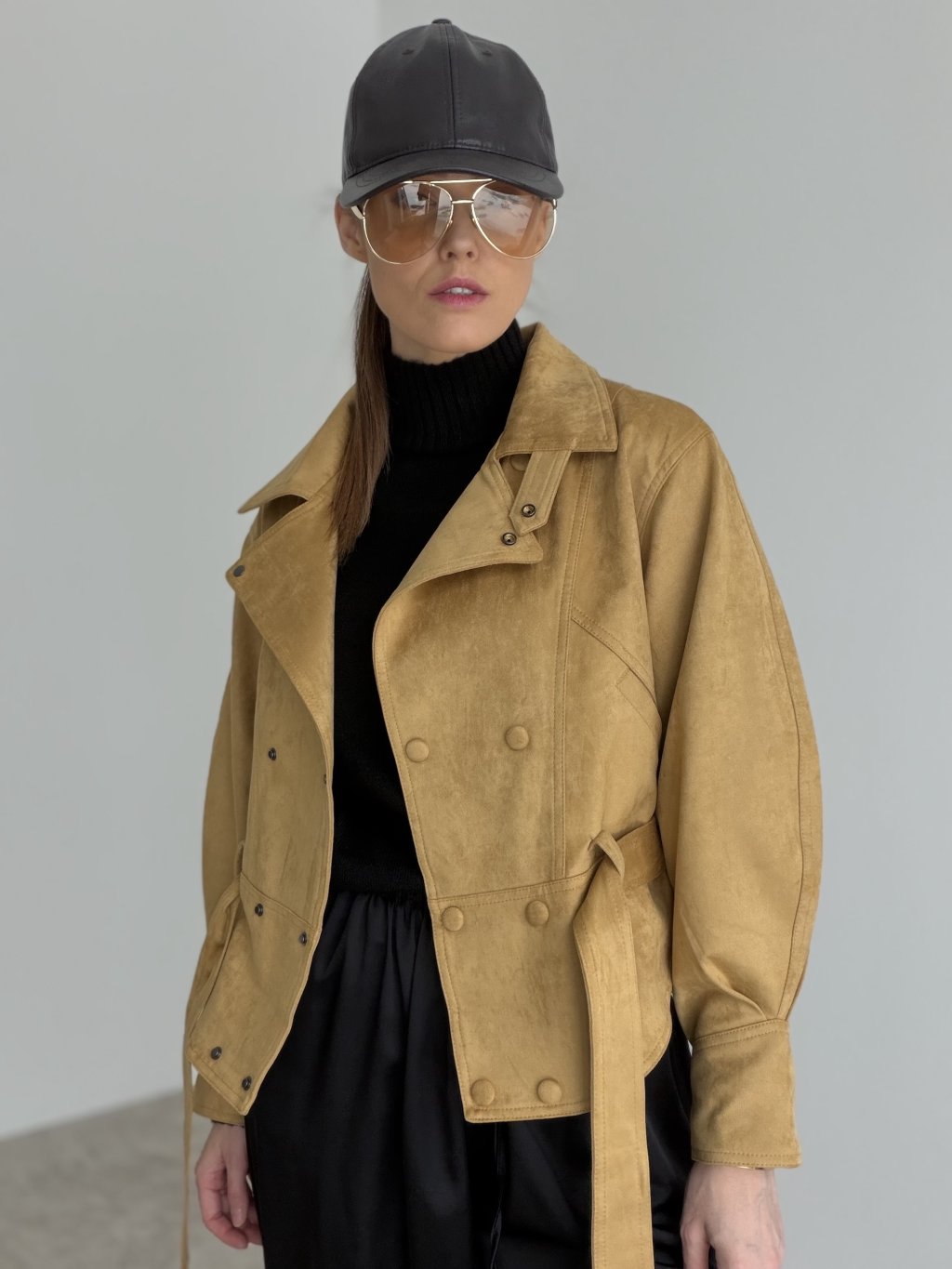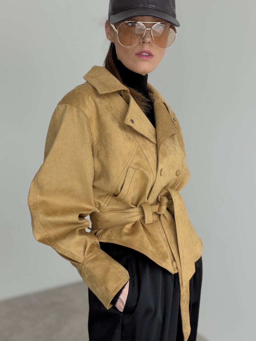 Krótka kurtka z paskiem i dwurzędowym zapięciem, która podkreśla talię i dodaje stylizacji eleganckiego charakteru.