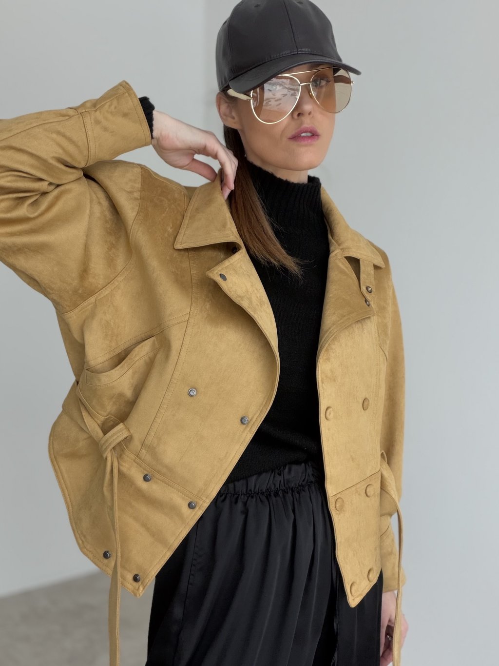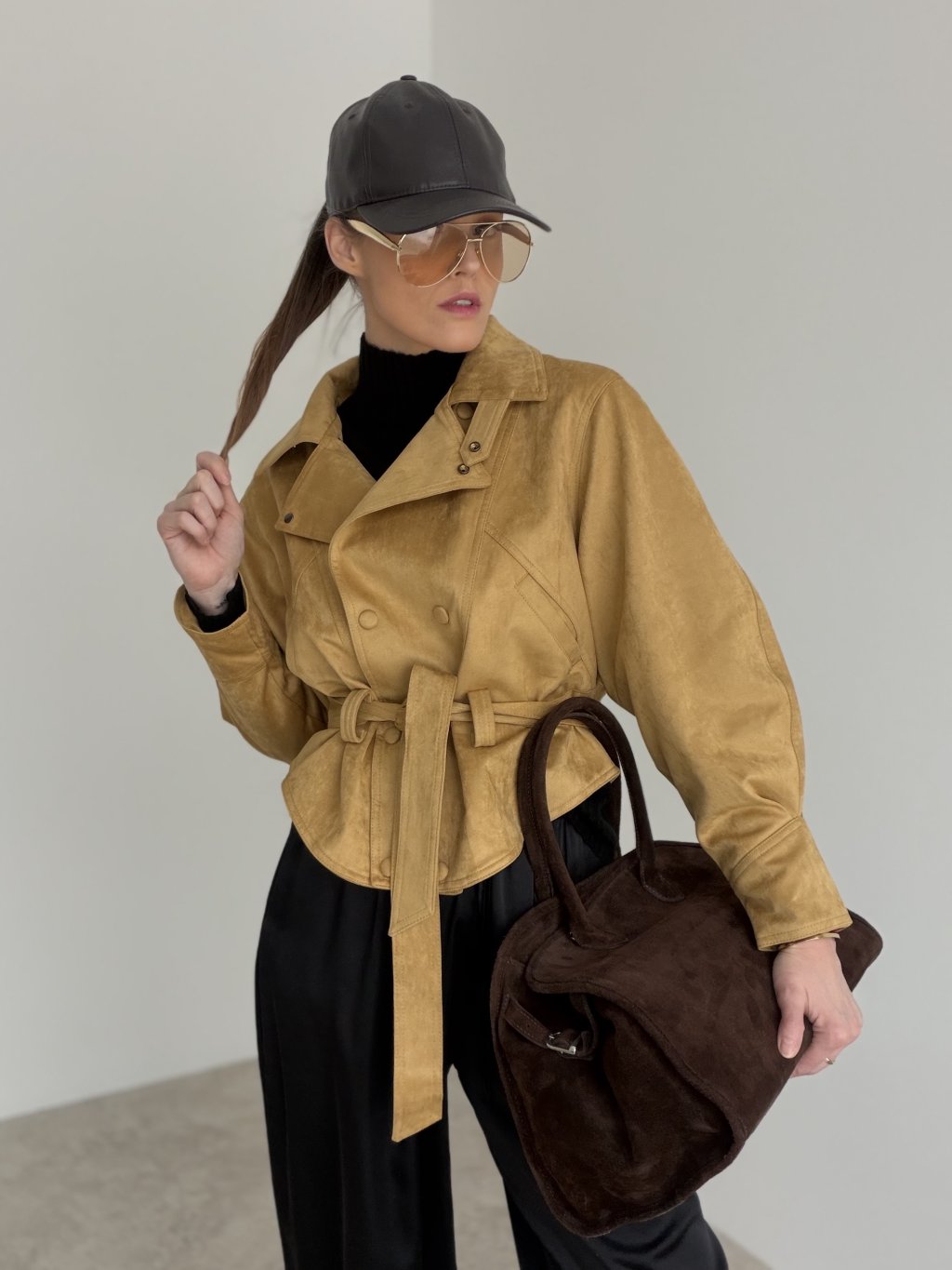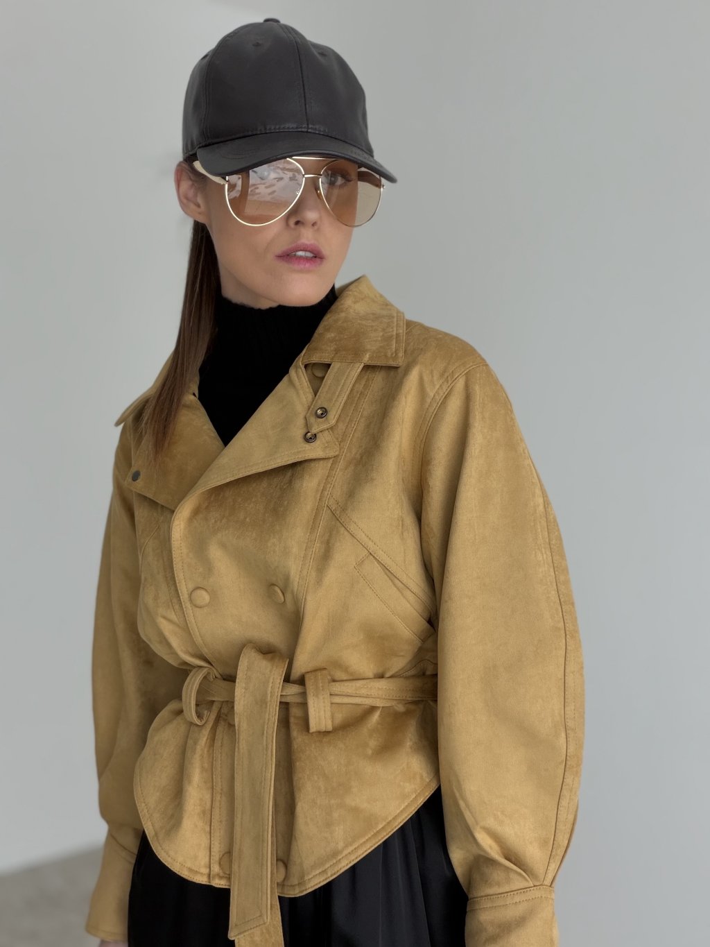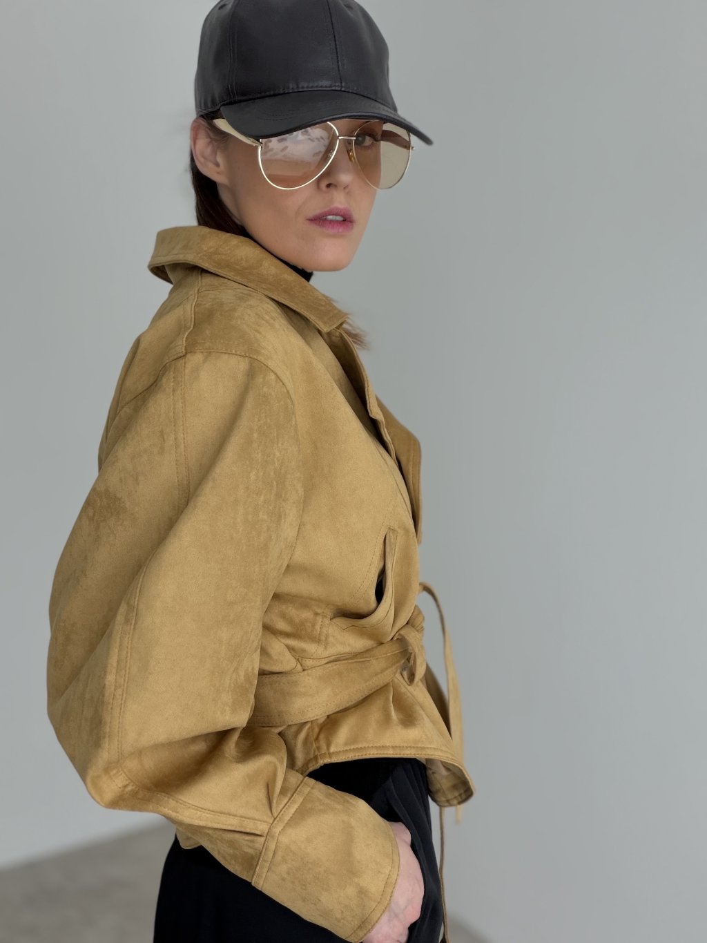 Krótka kurtka z paskiem i dwurzędowym zapięciem, która podkreśla talię i dodaje stylizacji eleganckiego charakteru.