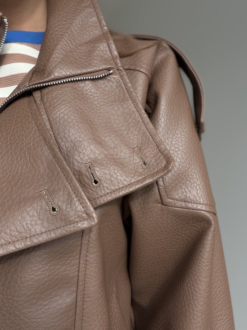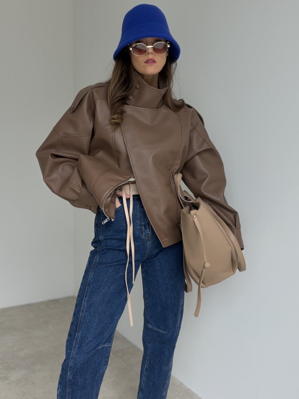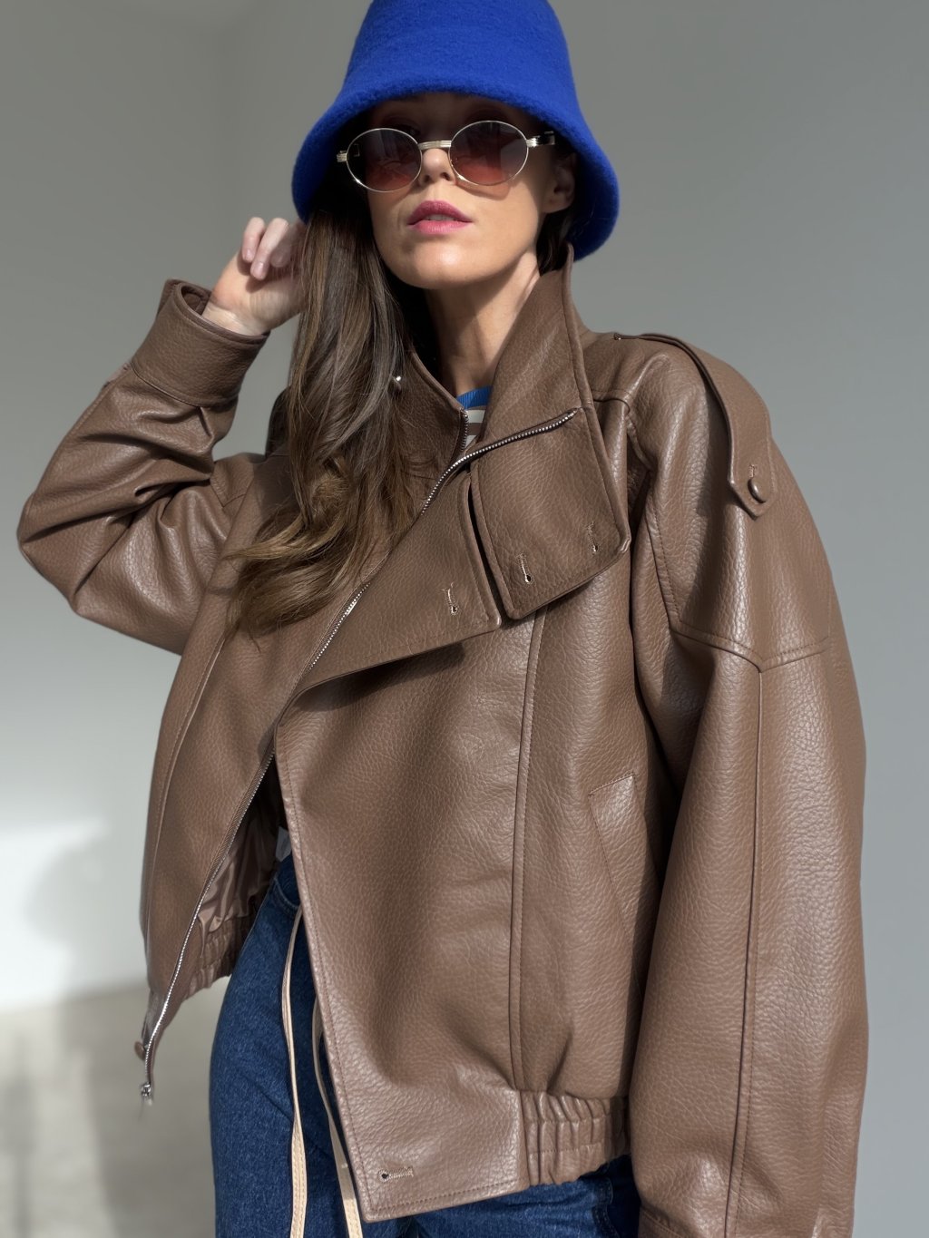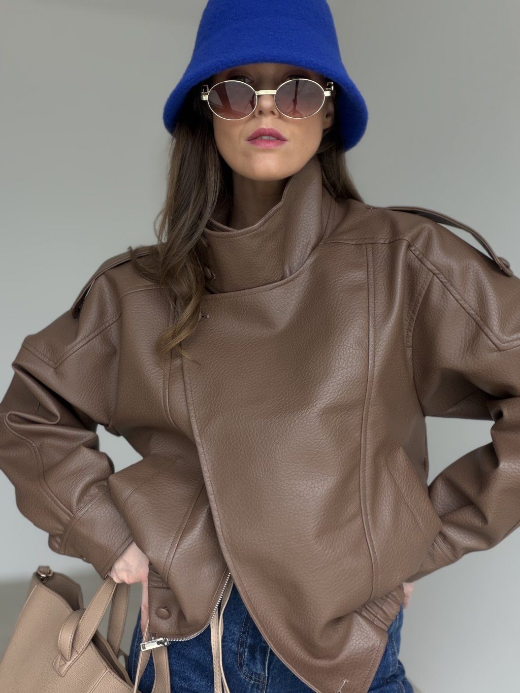 Kurtka ze skóry ekologicznej o kroju oversize z wysokim kołnierzem i zapięciem na zamek. Opuszczone ramiona, wyraziste przeszycia i elastyczne wykończenie na dole tworzą nowoczesną sylwetkę.