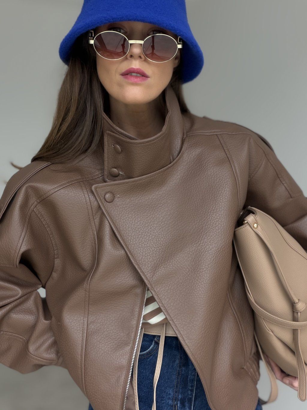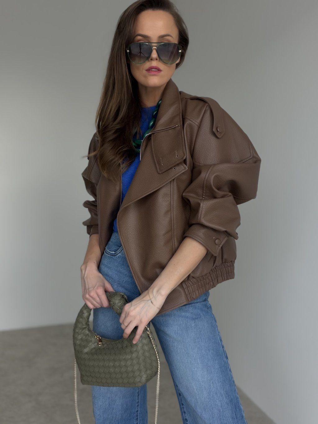 Jeśli chcesz bardziej elegancki look, delikatnie wyłóż kołnierz i dodaj torebkę.