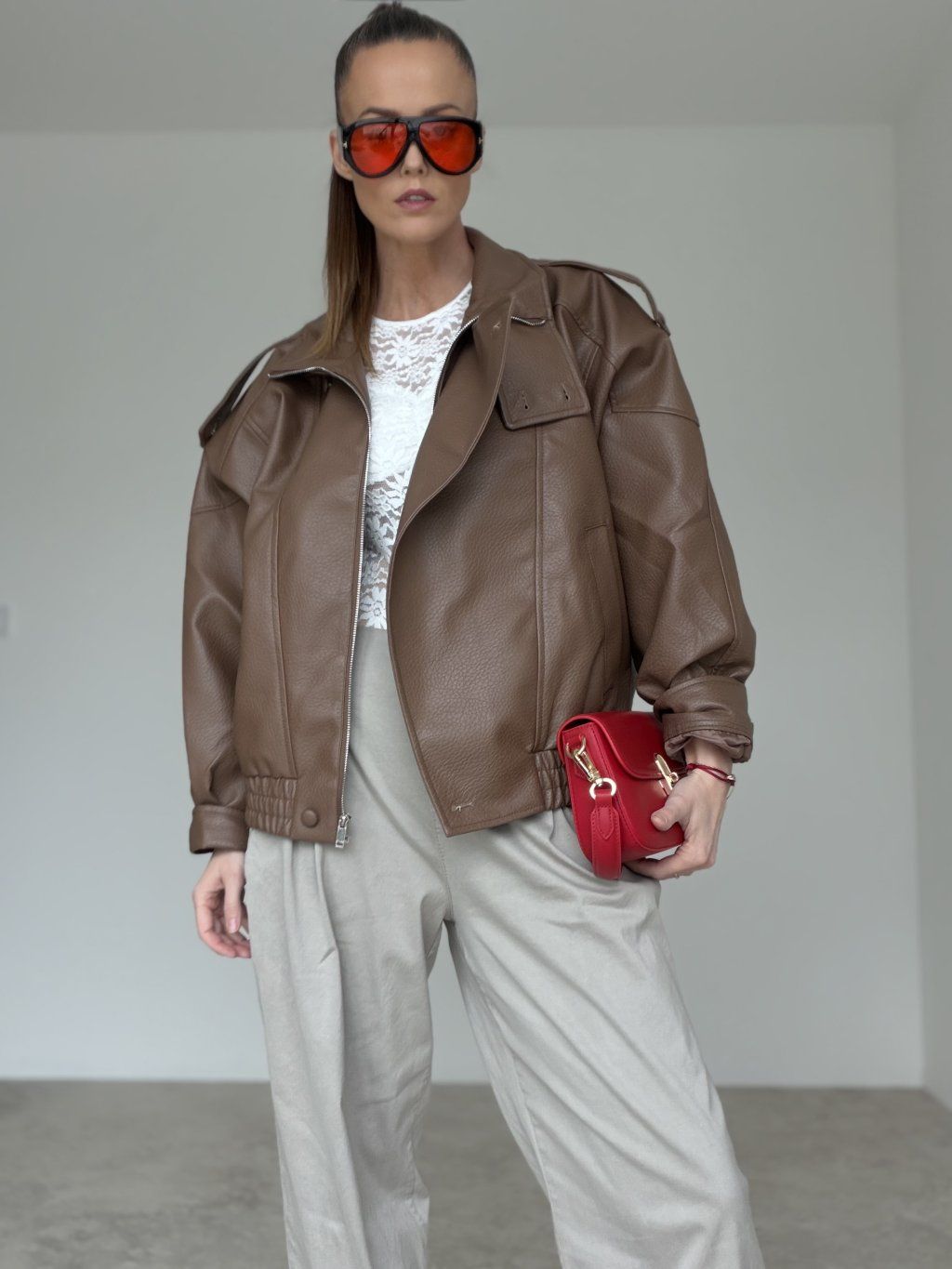 Kurtka ze skóry ekologicznej o nowoczesnym, oversize’owym kroju to mocny element stylizacji, który robi efekt bez wysiłku. Ma wysoki kołnierz, który dobrze trzyma formę i wygląda bardzo „fashion”, a przy okazji chroni przed wiatrem. Luźniejszy fason z lekko opuszczoną linią ramion jest bardzo na czasie i pozwala wygodnie nosić ją warstwowo, również na grubszy top lub bluzę. Zapięcie na zamek, kieszenie oraz elastyczne wykończenie na dole pomagają utrzymać ładny kształt i komfort noszenia. Ozdobne przeszycia i struktura materiału nadają całości bardziej eleganckiego charakteru. To świetna kurtka na sezon przejściowy – od jesieni do wiosny, do miasta, w podróży i na co dzień.