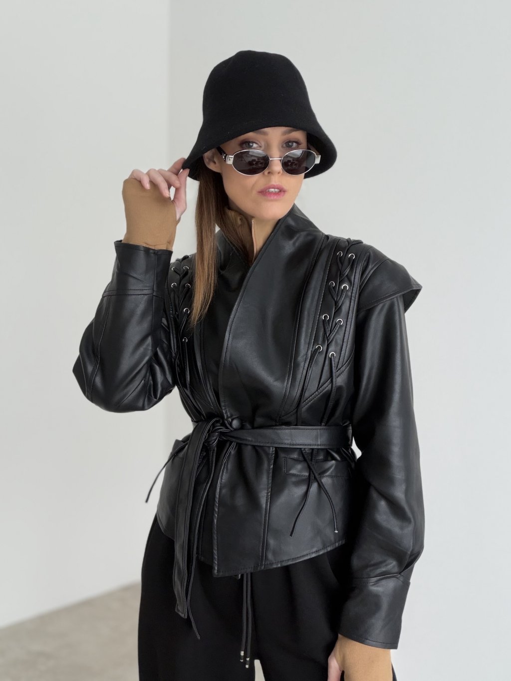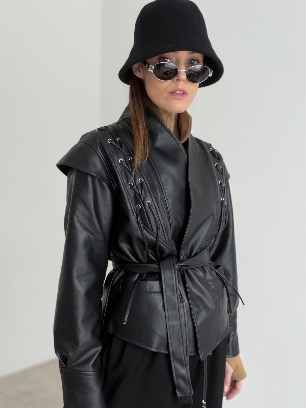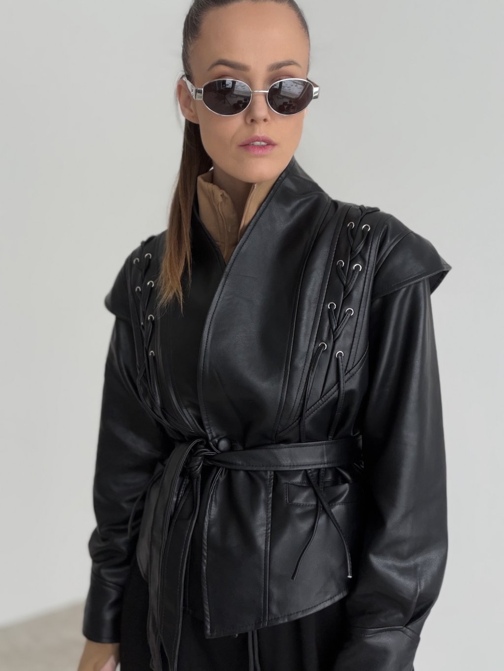 Kurtka ze skóry ekologicznej z paskiem, która podkreśla talię i nadaje stylizacji nowoczesny, dopracowany wygląd. Dekoracyjne sznurowanie na ramionach dodaje charakteru.