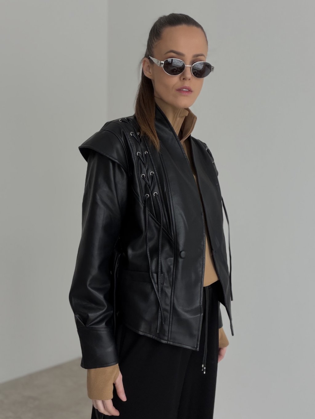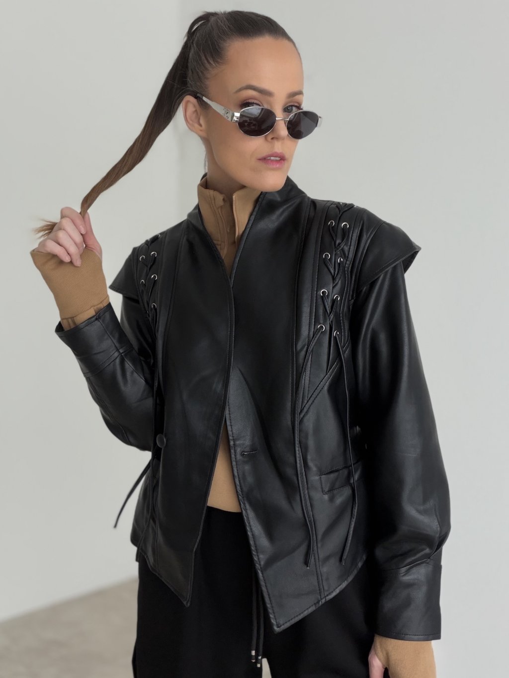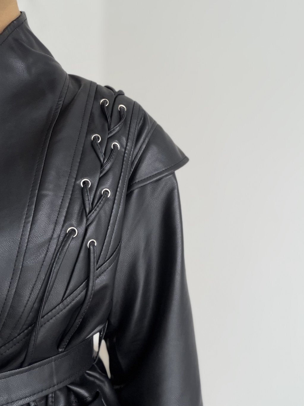 Kurtka ze skóry ekologicznej z paskiem, która podkreśla talię i nadaje stylizacji nowoczesny, dopracowany wygląd. Dekoracyjne sznurowanie na ramionach dodaje charakteru.