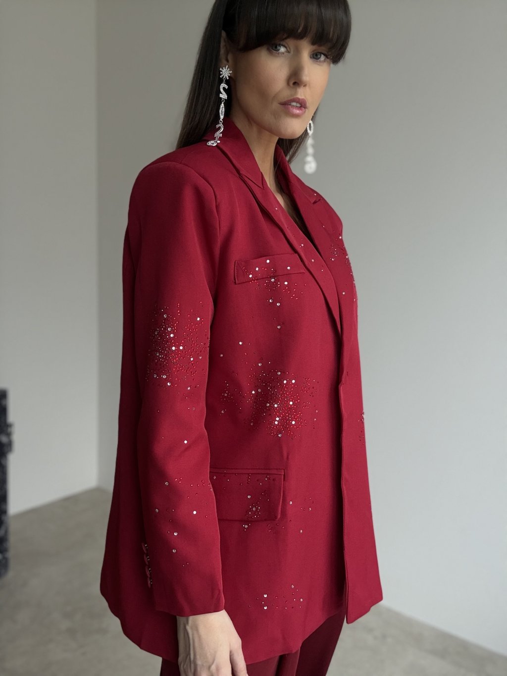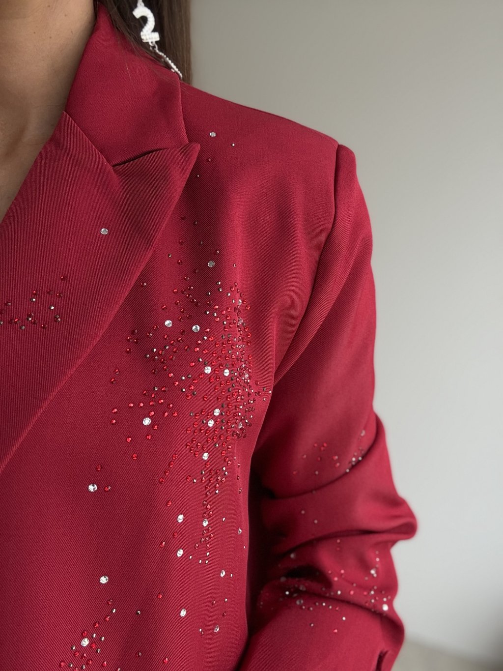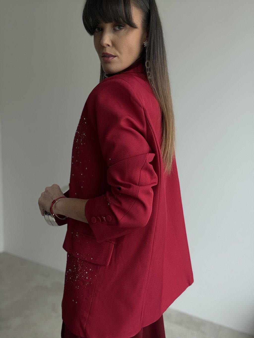 Elegancka marynarka oversize nadaje stylizacji nowoczesnego, a jednocześnie bardzo kobiecego charakteru. Luźniejszy krój miękko układa się na sylwetce, podkreśla linię ramion i tworzy efektowną, wyrazistą formę. Przód i rękawy ozdobione są drobnymi aplikacjami, które tworzą efekt delikatnego, błyszczącego „posypu” i nadają marynarce odświętny wygląd – idealny na imprezy, przyjęcia i wyjątkowe okazje. Klasyczne zapięcie na guzik, klapowy kołnierz oraz praktyczne kieszenie podkreślają ponadczasowy charakter fasonu. Podszewka zapewnia wygodę i komfort noszenia przez cały dzień i wieczór.