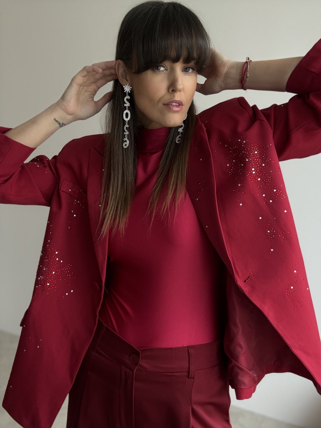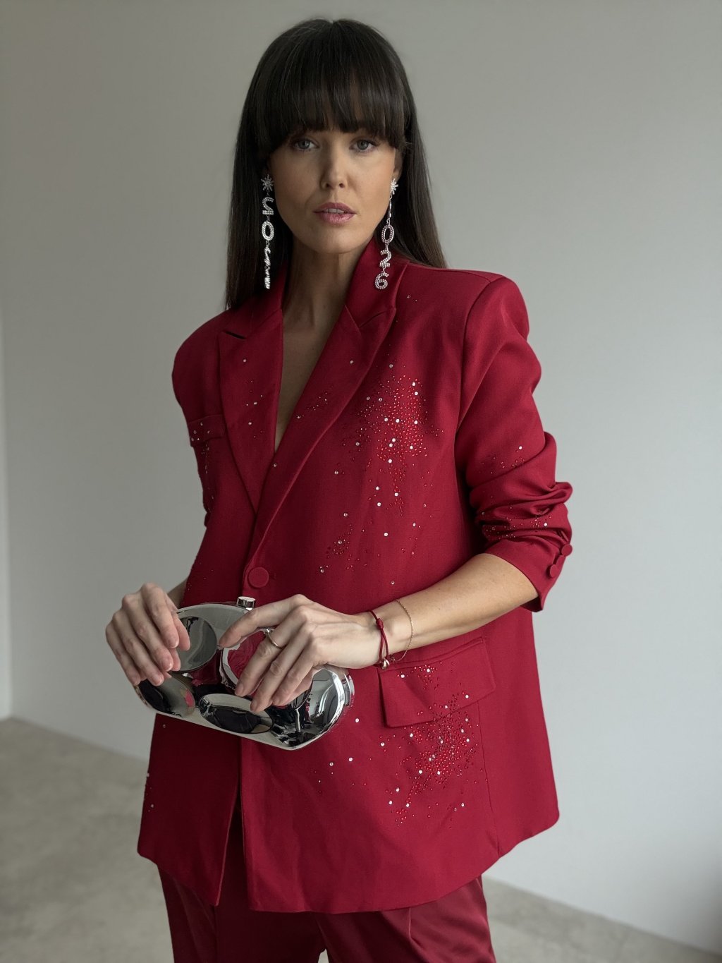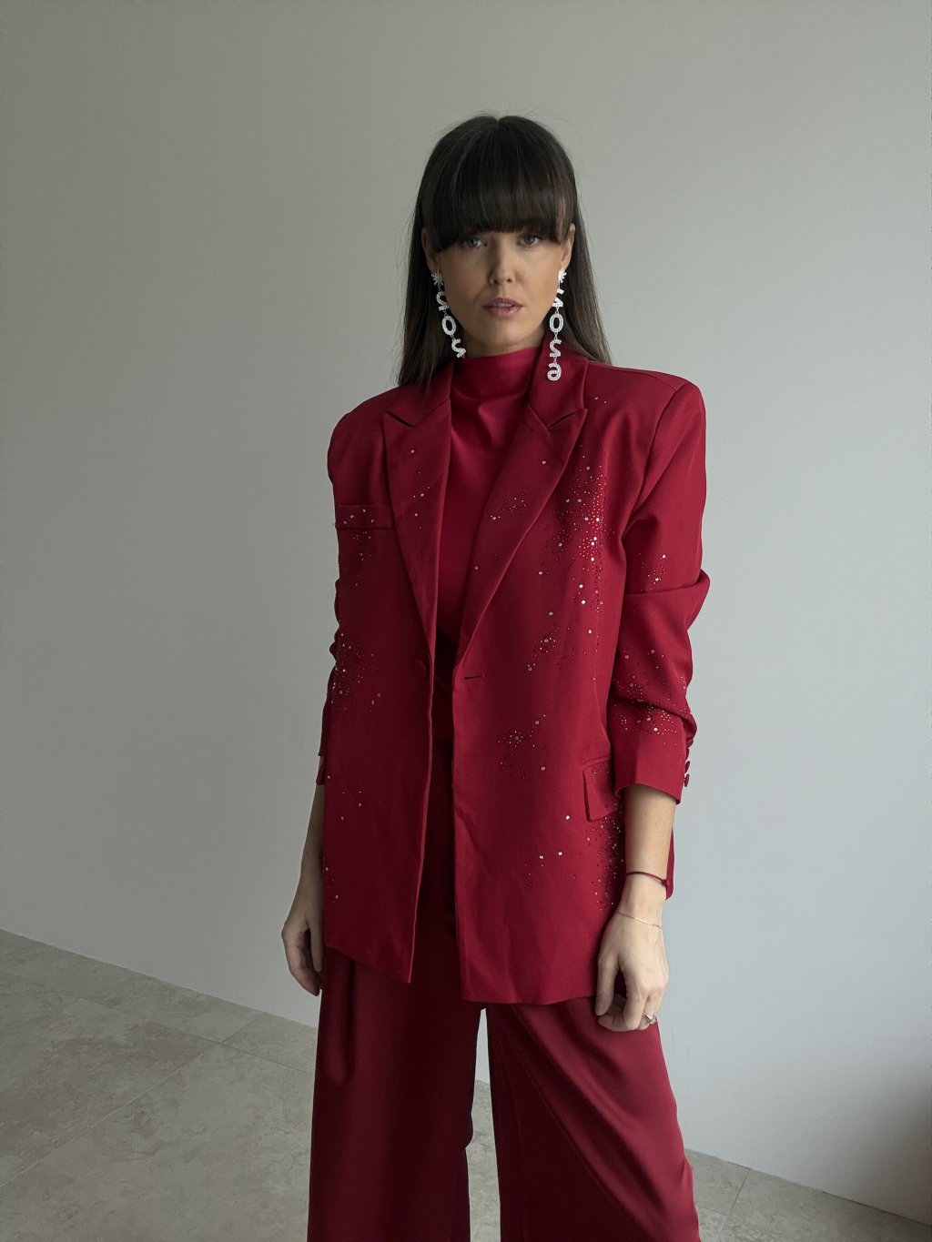 Elegancka marynarka oversize nadaje stylizacji nowoczesnego, a jednocześnie bardzo kobiecego charakteru. Luźniejszy krój miękko układa się na sylwetce, podkreśla linię ramion i tworzy efektowną, wyrazistą formę. Przód i rękawy ozdobione są drobnymi aplikacjami, które tworzą efekt delikatnego, błyszczącego „posypu” i nadają marynarce odświętny wygląd – idealny na imprezy, przyjęcia i wyjątkowe okazje. Klasyczne zapięcie na guzik, klapowy kołnierz oraz praktyczne kieszenie podkreślają ponadczasowy charakter fasonu. Podszewka zapewnia wygodę i komfort noszenia przez cały dzień i wieczór.