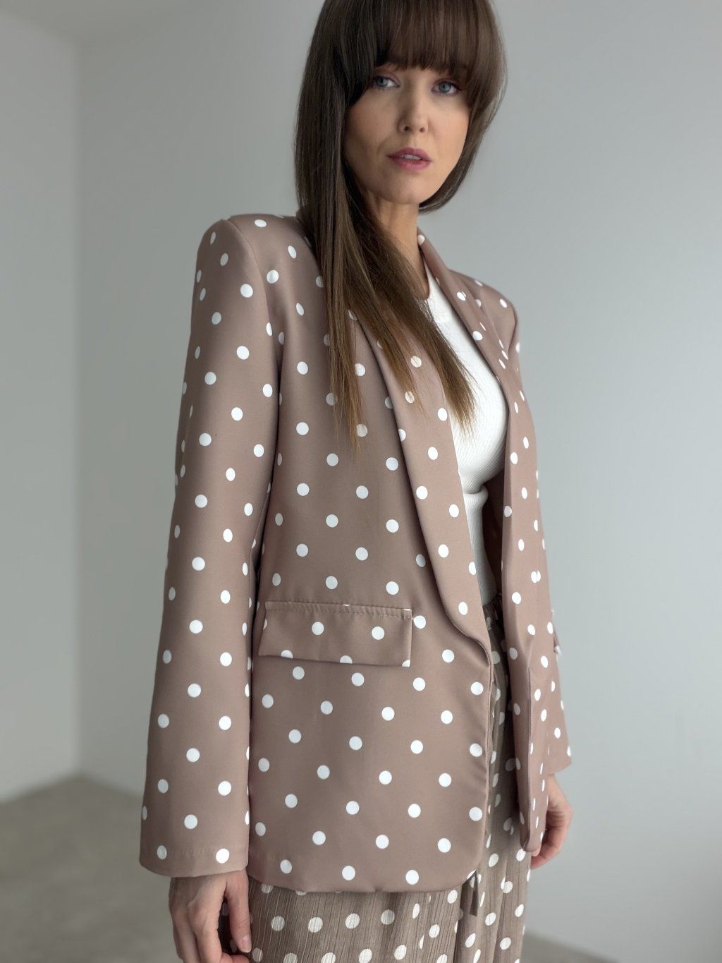 Elegancka marynarka w kropki o klasycznym fasonie i stylowym wzorze. Wyrazisty model, który dodaje stylizacji kobiecego i wyrafinowanego charakteru.