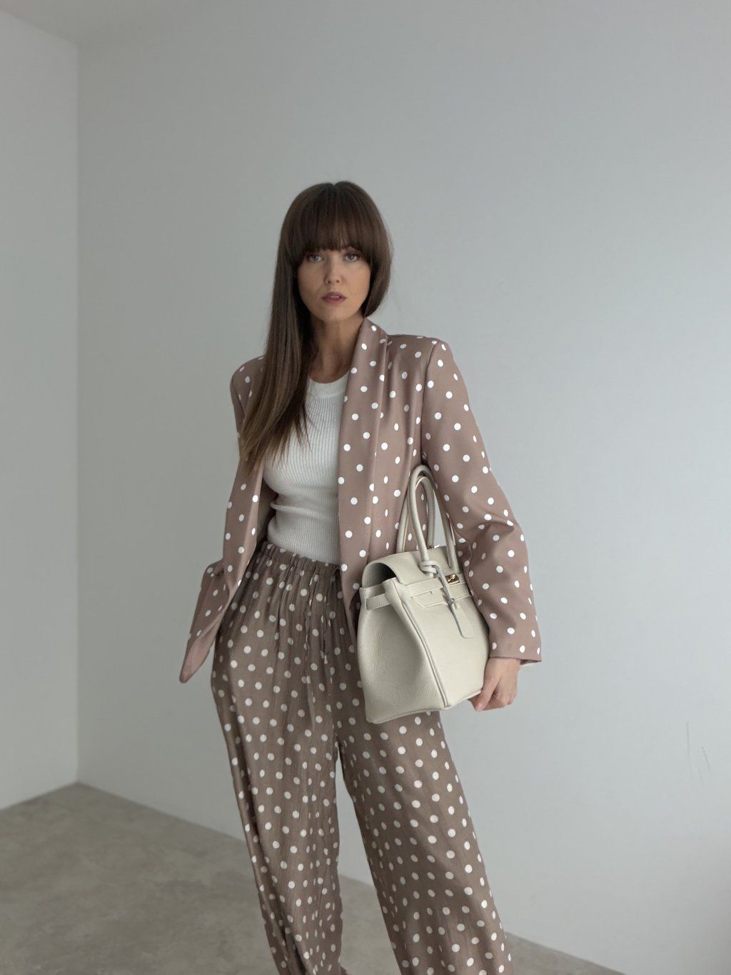 Ta marynarka w kropki to wyrazisty, a jednocześnie elegancki model, który dodaje stylizacji kobiecego i wyrafinowanego charakteru. Klasyczny fason w połączeniu z delikatnym wzorem kropek prezentuje się ponadczasowo, stylowo i bardzo gustownie. Marynarka pięknie podkreśla sylwetkę, a jednocześnie zachowuje lekkość, dzięki czemu świetnie sprawdza się przy różnych okazjach.