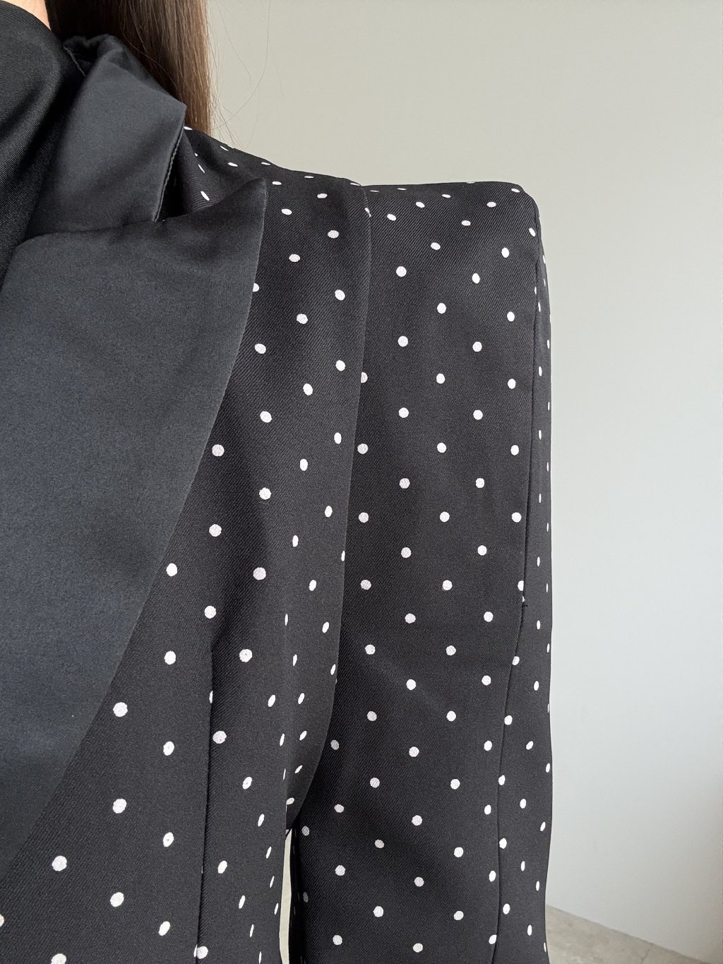 Elegancka marynarka z poduszkami na ramionach, kropkowanym wzorem i satynowymi klapami, która podkreśla sylwetkę i nadaje stylizacjom wyrazistego, wieczorowego charakteru.