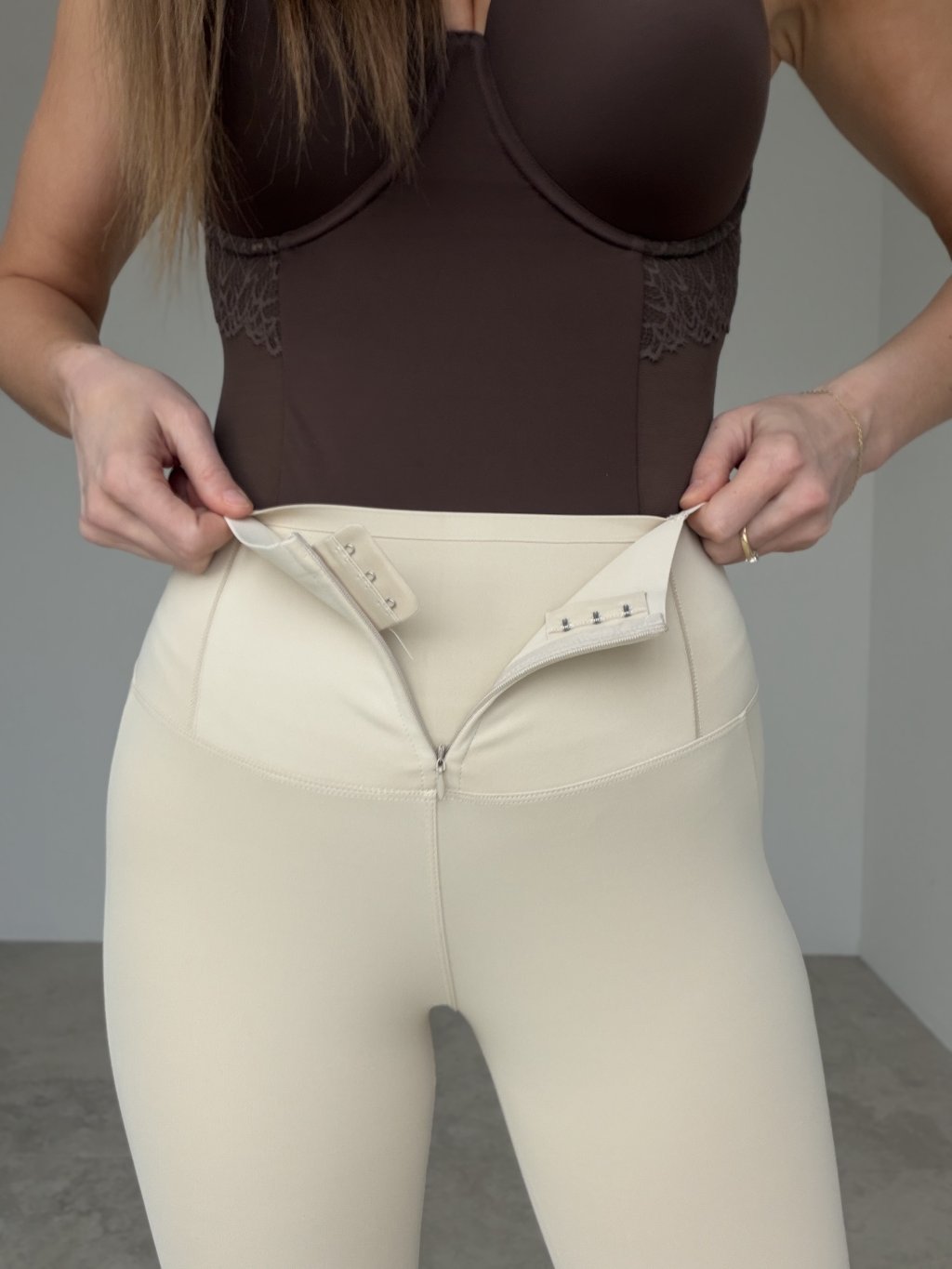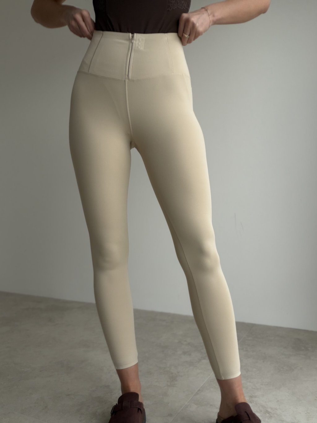 Modelujące legginsy z wysokim stanem i zamkiem z przodu. Gładki elastyczny materiał i przeszycia podkreślające sylwetkę.