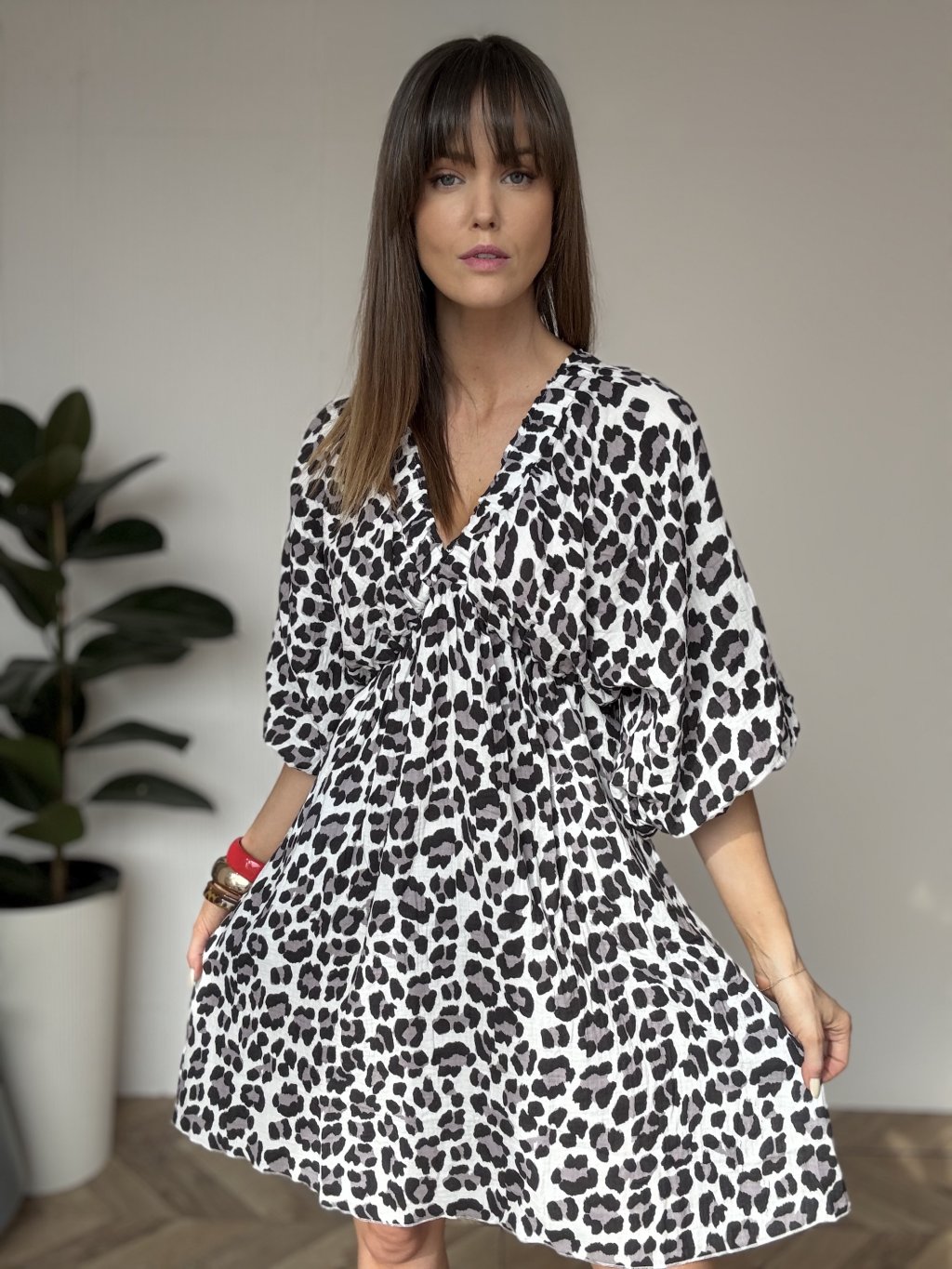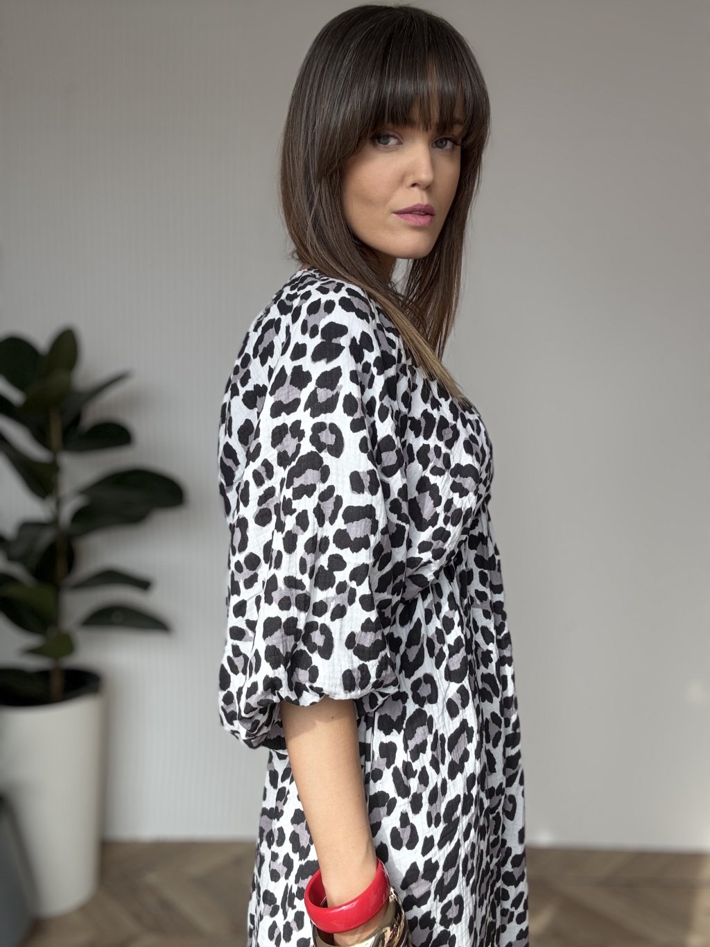 Ľahučké a vzdušné mušelínové šaty s voľným strihom, ktoré zaručia maximálne pohodlie počas horúcich dní. Mäkký a priedušný materiál je ideálny na celodenné nosenie. Výrazné široké rukávy a zavinovací výstrih dodávajú šatám elegantný a štýlový vzhľad. Perfektné na letné dni, dovolenky alebo neformálne stretnutia.