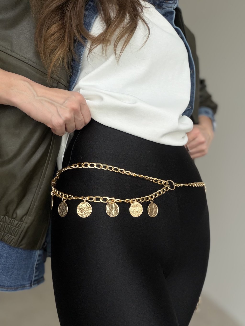 Regulowany pasek łańcuszkowy z dekoracyjnymi zawieszkami. Idealny do podkreślenia talii i ożywienia stylizacji.