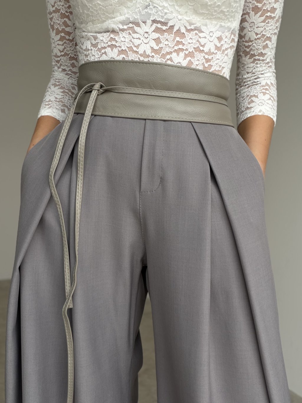 Pasek kopertowy o szerokim kroju z regulowanym wiązaniem podkreślającym talię.