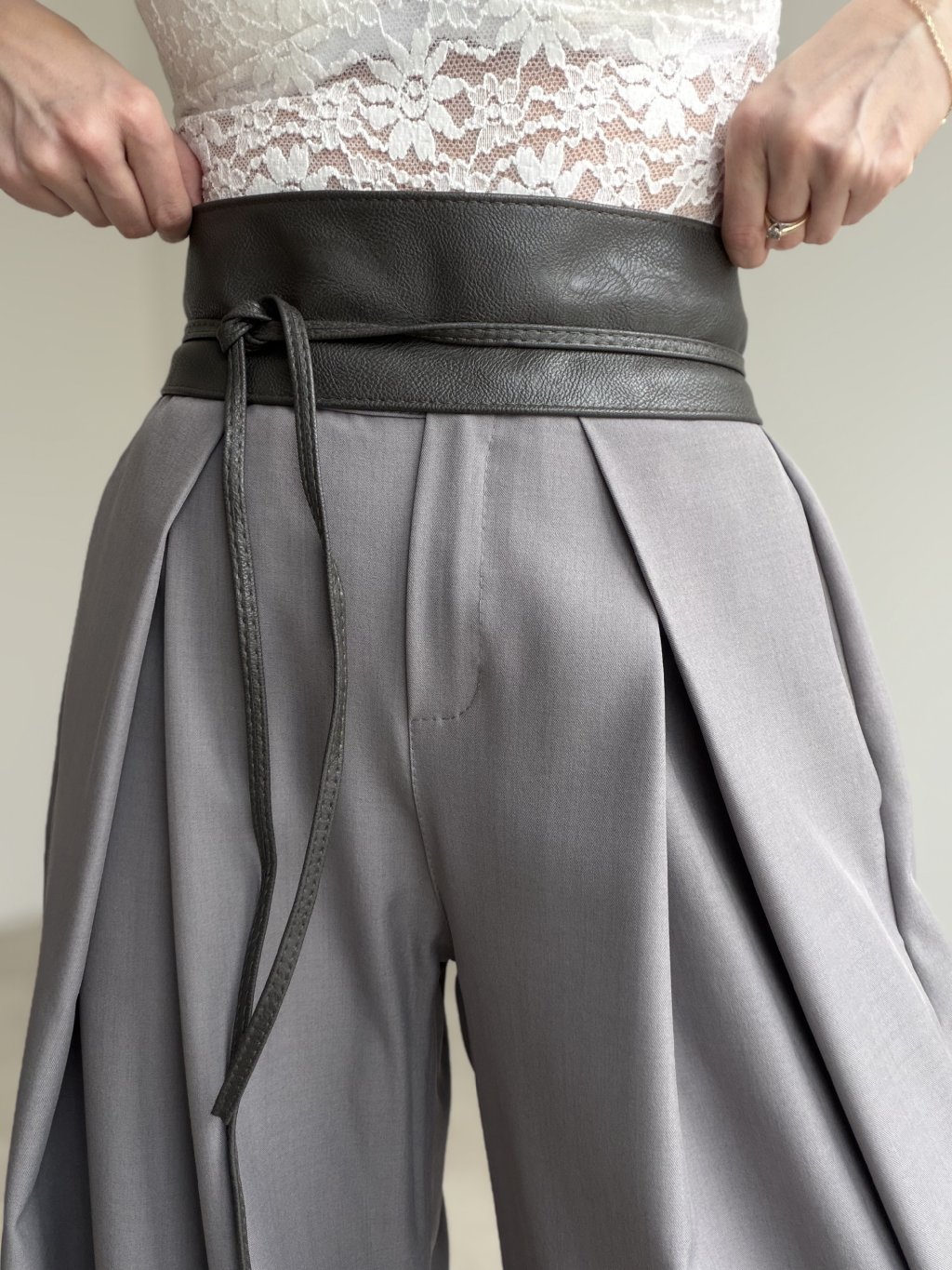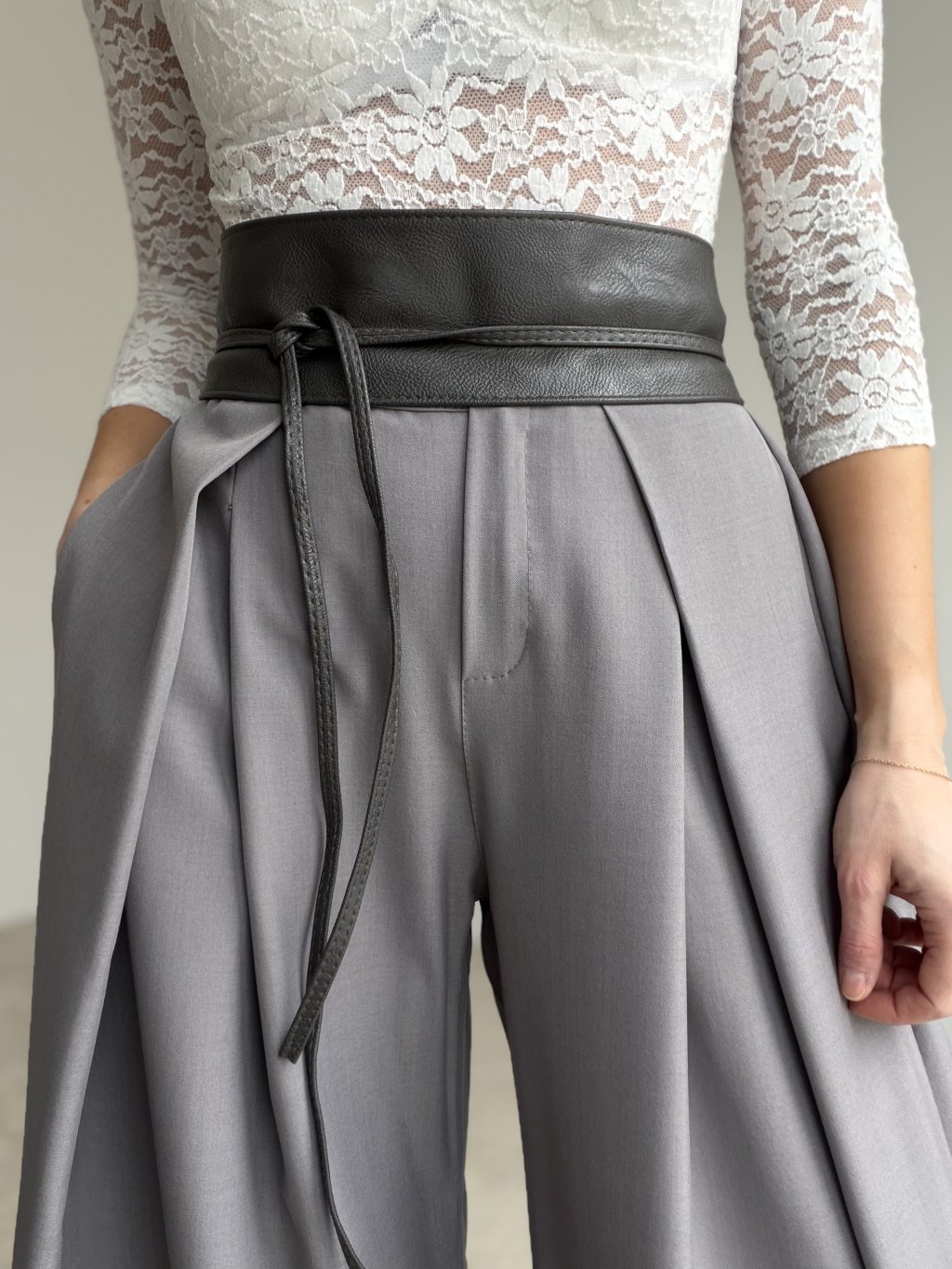 Pasek kopertowy o szerokim kroju z regulowanym wiązaniem podkreślającym talię.
