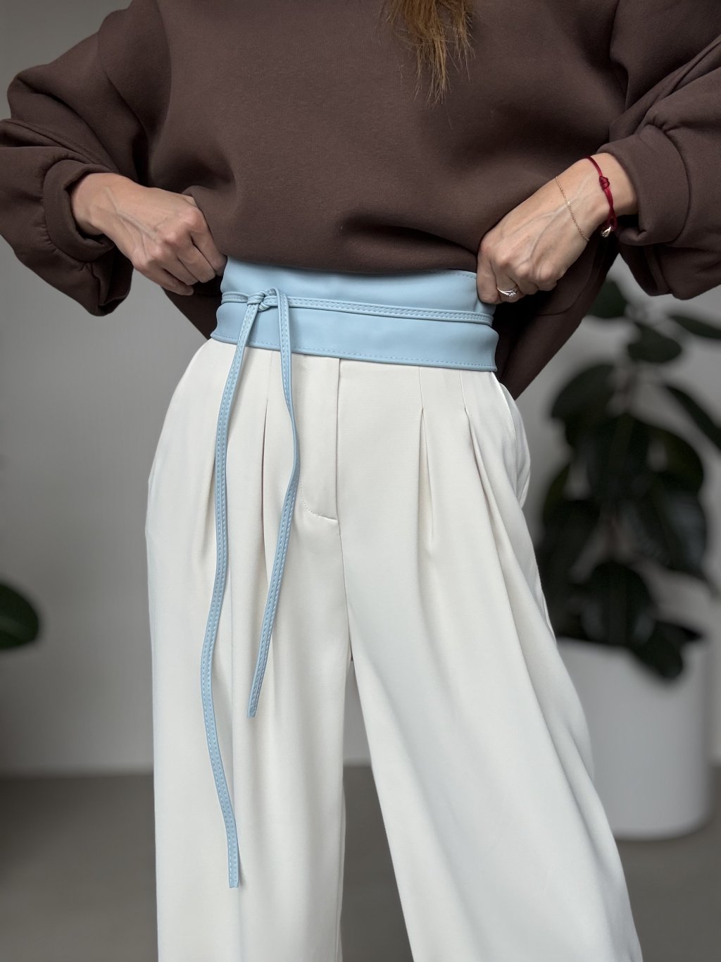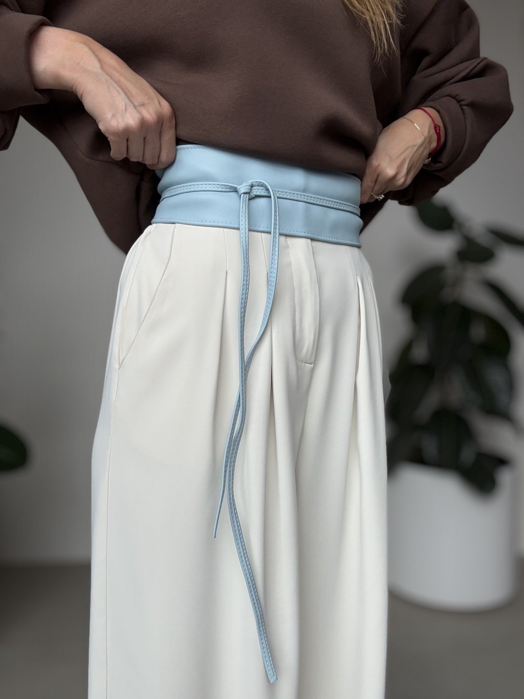 Pasek kopertowy o szerokim kroju z regulowanym wiązaniem podkreślającym talię.
