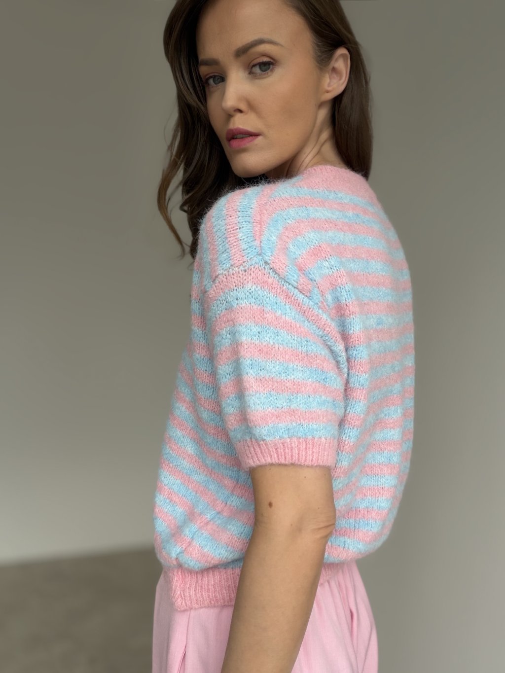 Miękki, puszysty sweter w paski z krótkim rękawem, który ładnie trzyma formę. Idealny do noszenia solo lub w warstwowych stylizacjach.