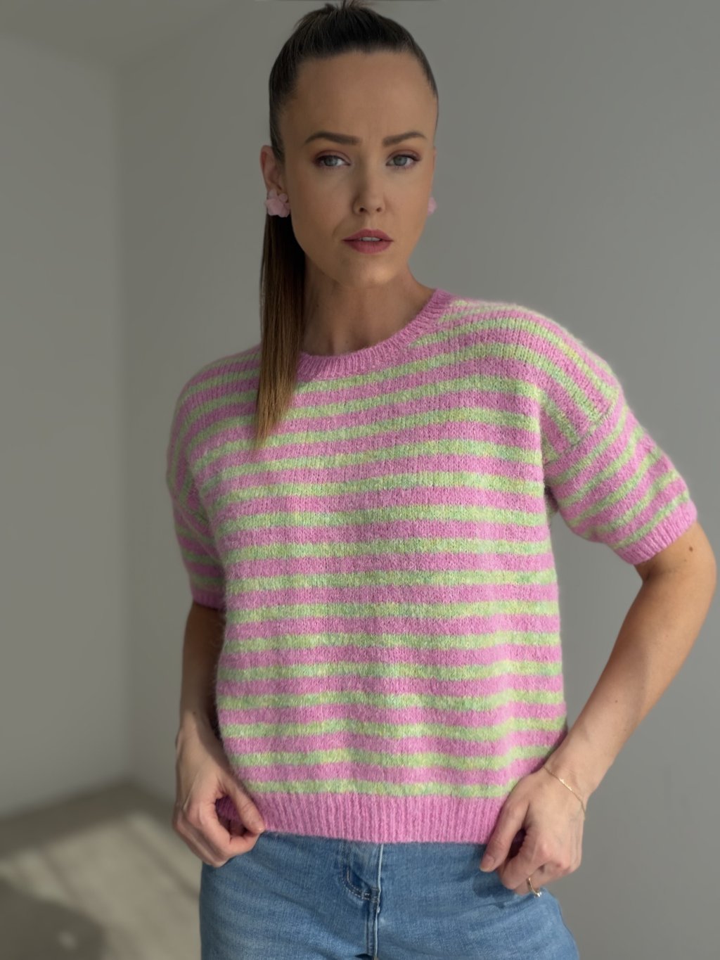 Miękki, puszysty sweter w paski z krótkim rękawem, który ładnie trzyma formę. Idealny do noszenia solo lub w warstwowych stylizacjach.