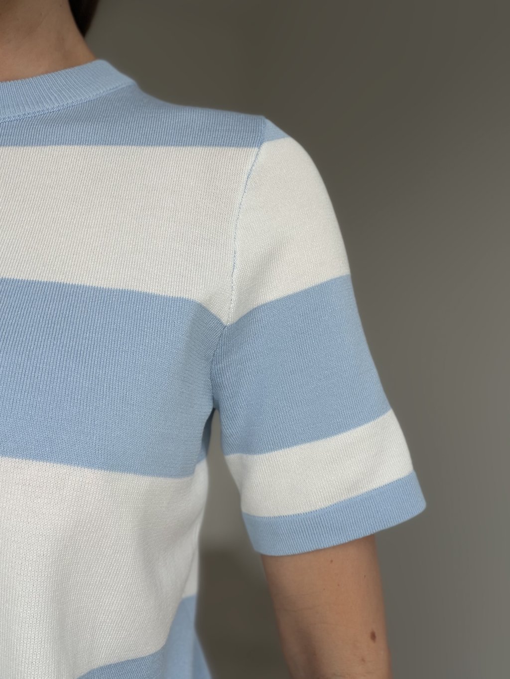 Dzianinowy sweter w paski z krótkim rękawem w ponadczasowym stylu. Ładnie trzyma formę, wygląda elegancko i łatwo go zestawić z codziennymi oraz bardziej klasycznymi stylizacjami.