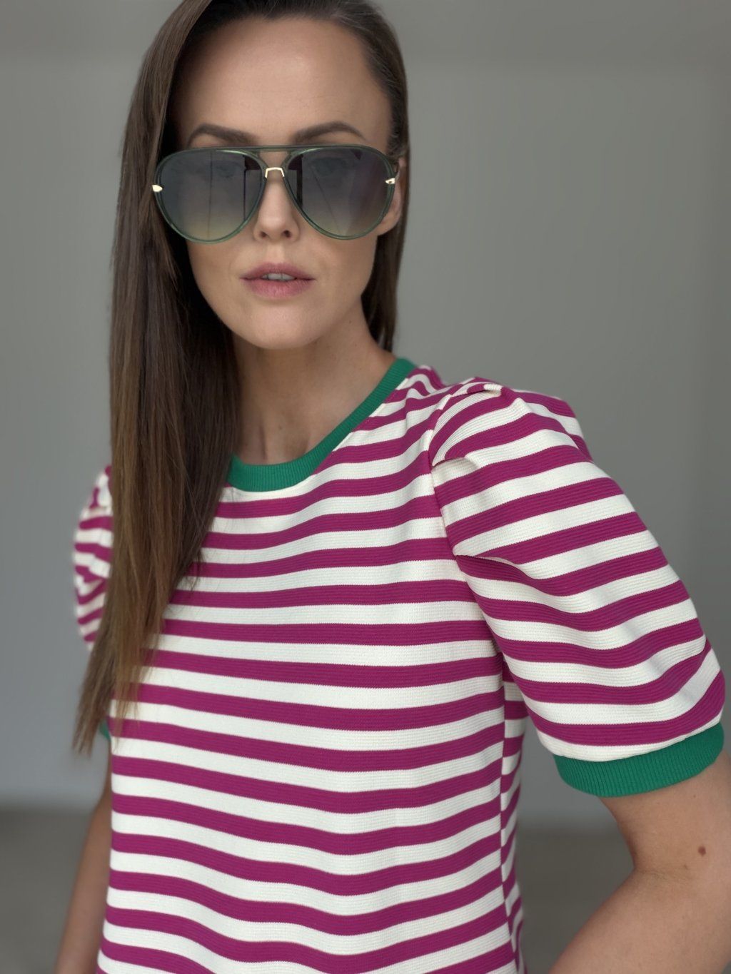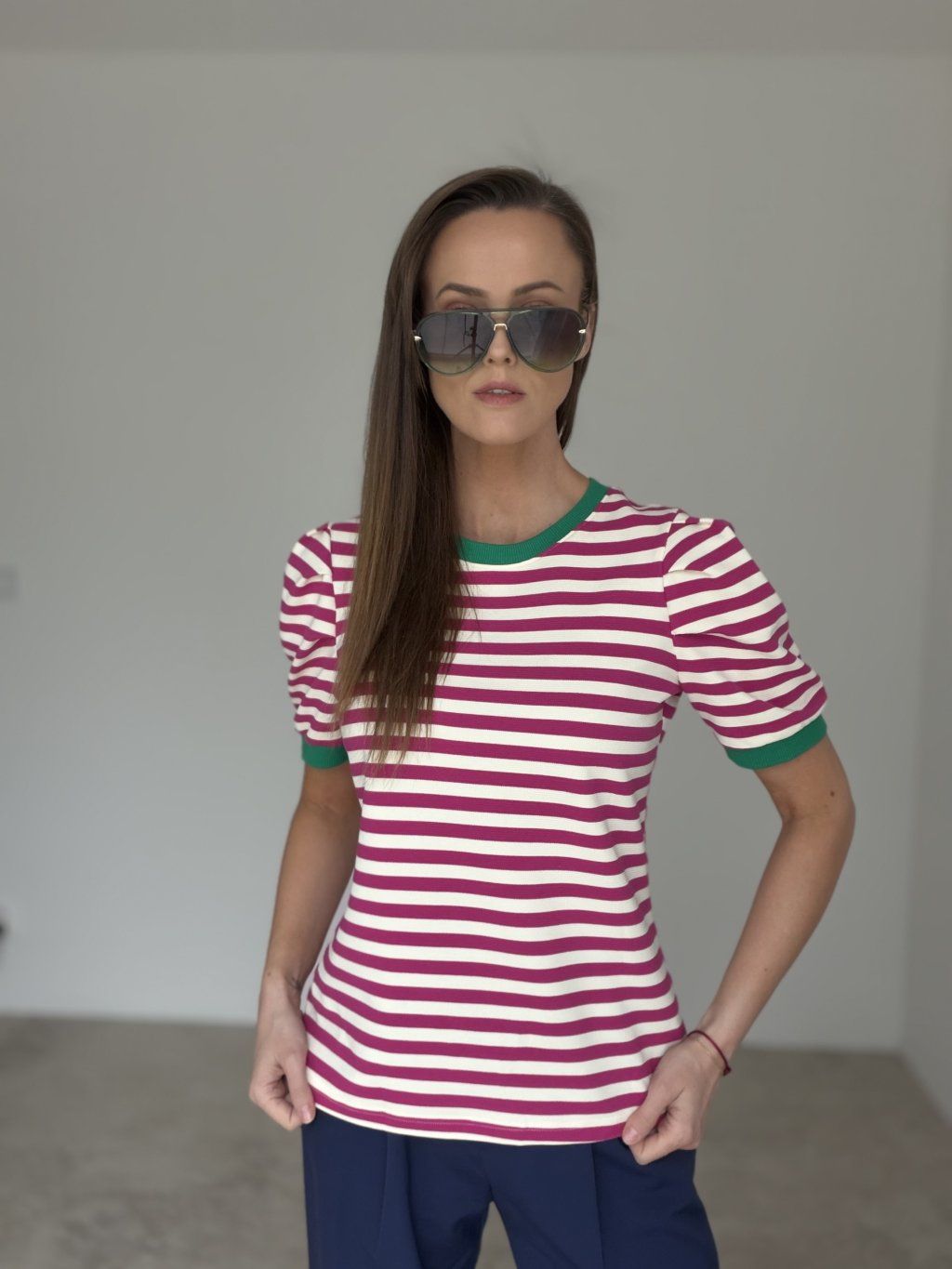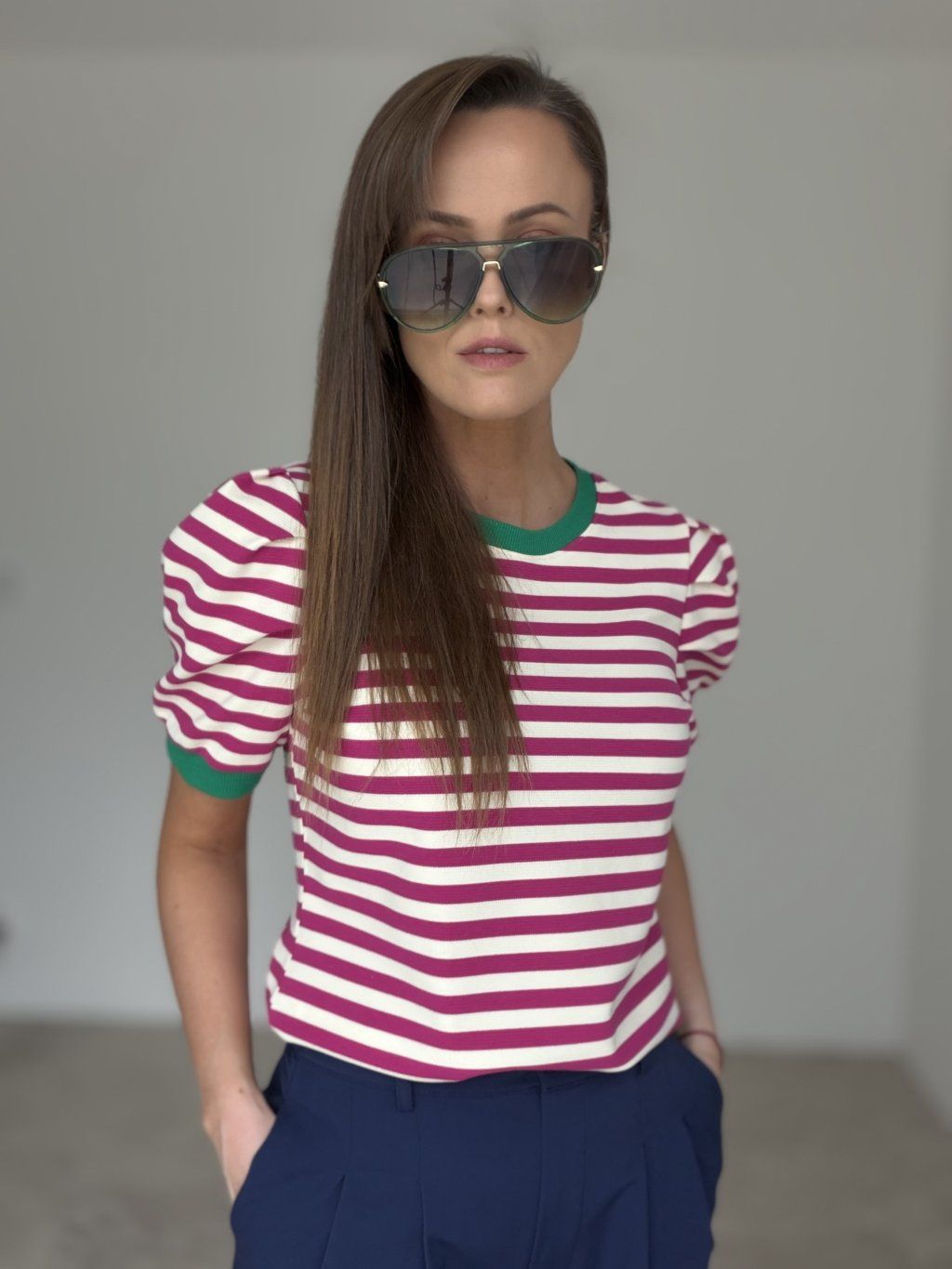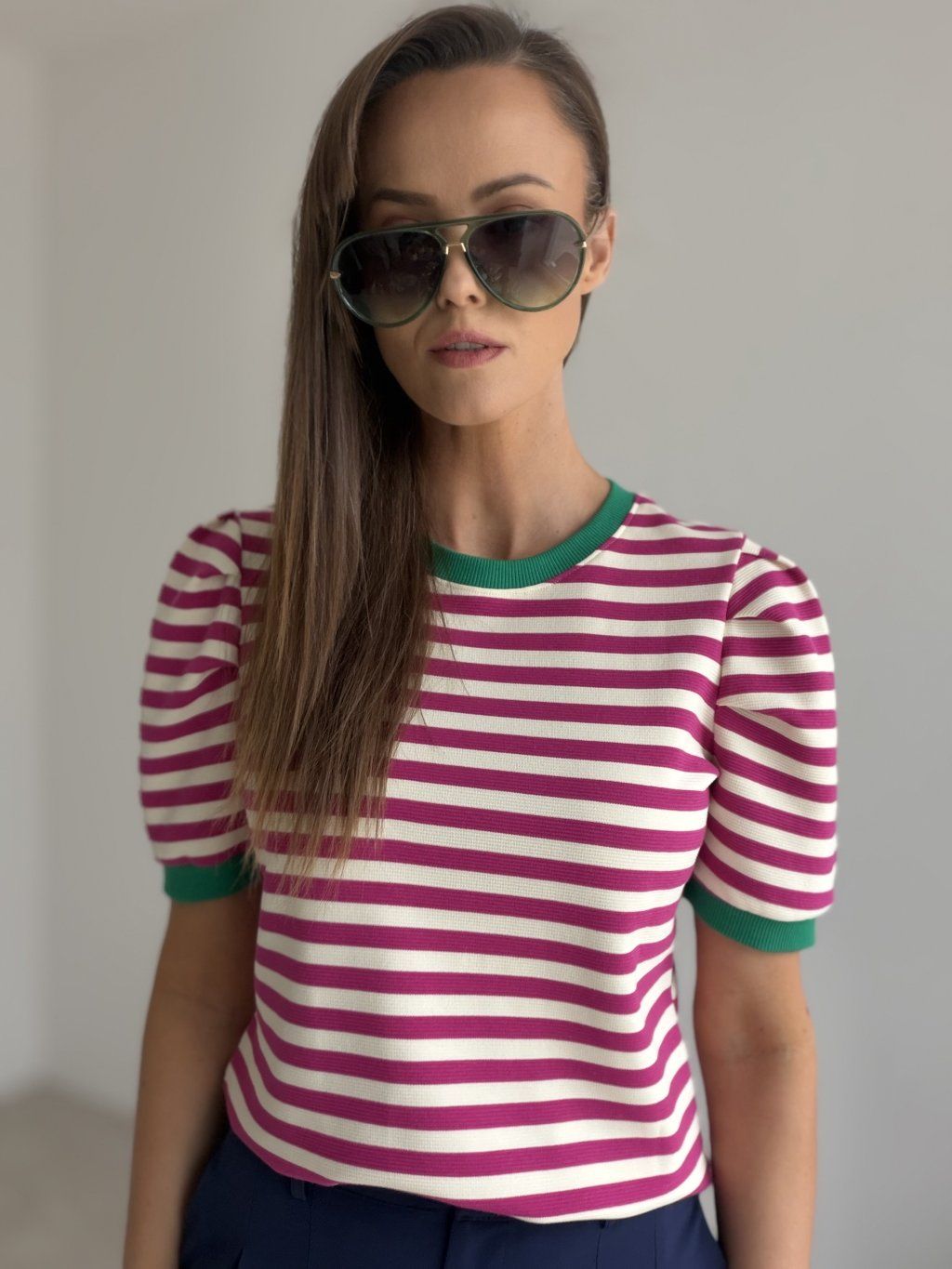 Top w paski o strukturalnej fakturze z okrągłym dekoltem i ściągaczami. Krótkie rękawy z lekkim marszczeniem przy ramionach tworzą kobiecą, nowoczesną formę.