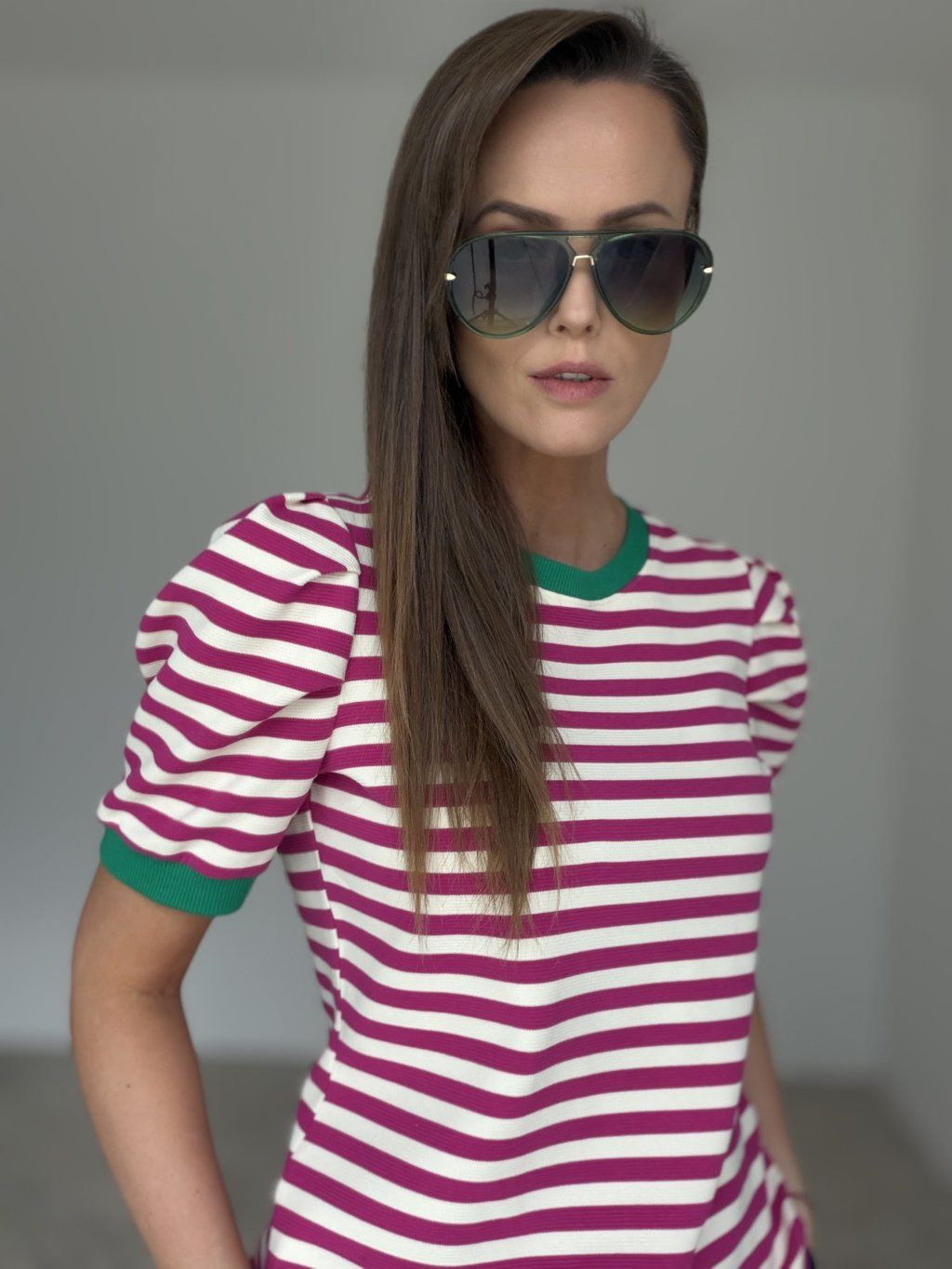 Top w paski o delikatnie strukturalnej fakturze to wygodna baza, która wygląda bardzo dopracowanie. Ma klasyczny, okrągły dekolt wykończony ściągaczem oraz krótkie rękawy z lekkim marszczeniem przy ramionach, dzięki czemu sylwetka prezentuje się kobieco i nowocześnie. Ściągacze utrzymują formę i dodają całości bardziej „premium” charakteru. Krój jest komfortowy i łatwy do stylizacji na co dzień, świetnie pasuje do jeansów, spodni z wysokim stanem i spódnic.