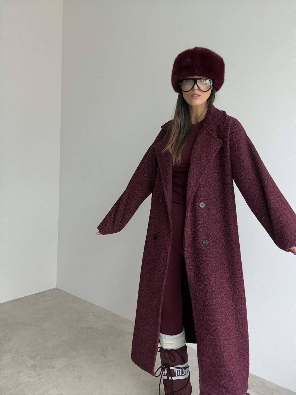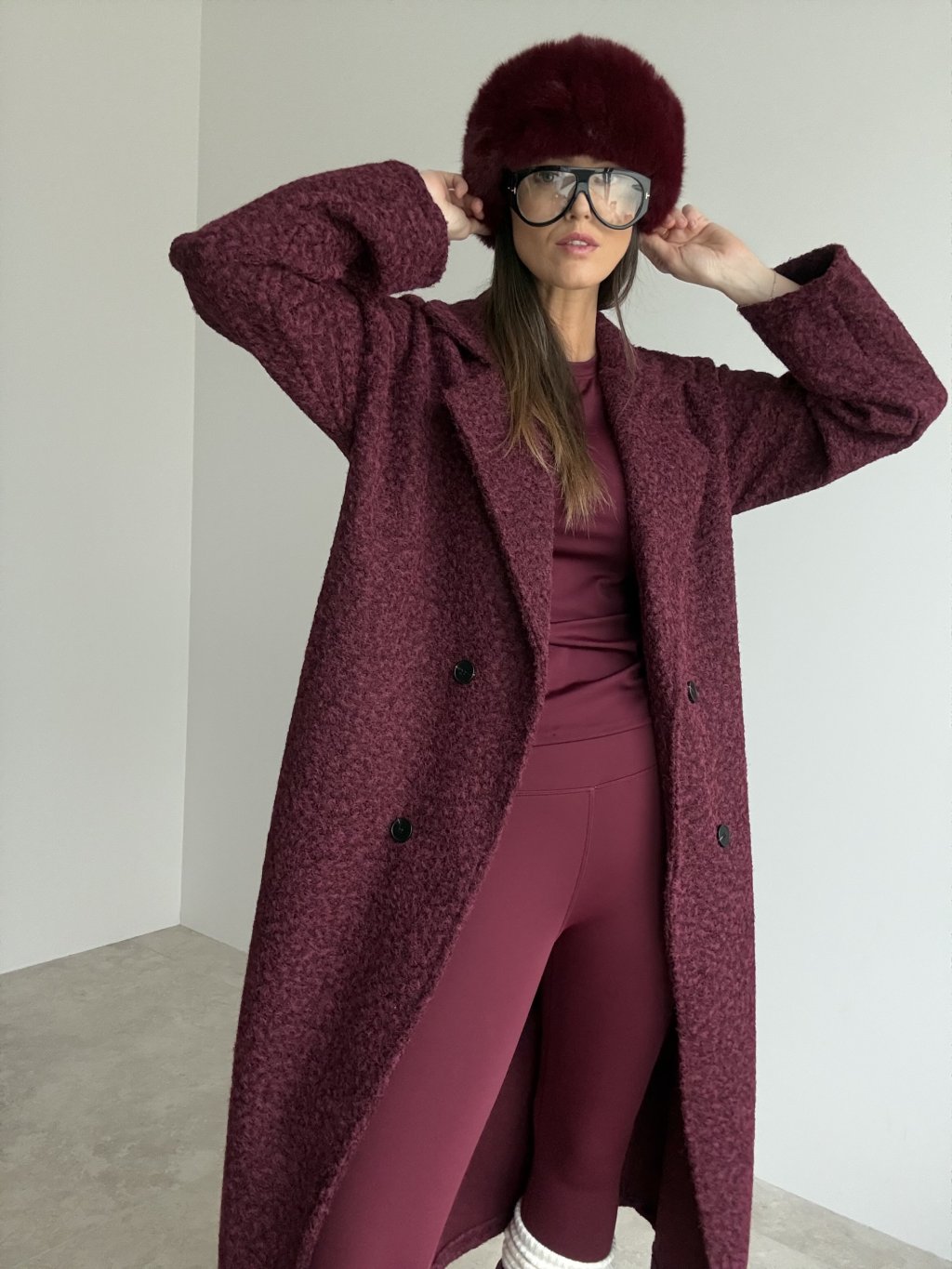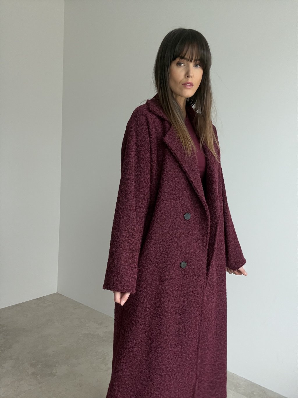 Długi, lekko oversize’owy płaszcz z miękkiej, ciepłej tkaniny o teksturowanej strukturze, z kołnierzem z klapami, zapięciem na guziki i kieszeniami po bokach. Model bez podszewki, idealny do warstwowych stylizacji na co dzień.