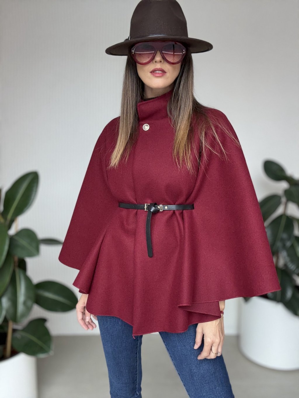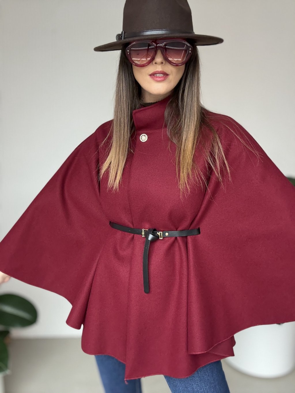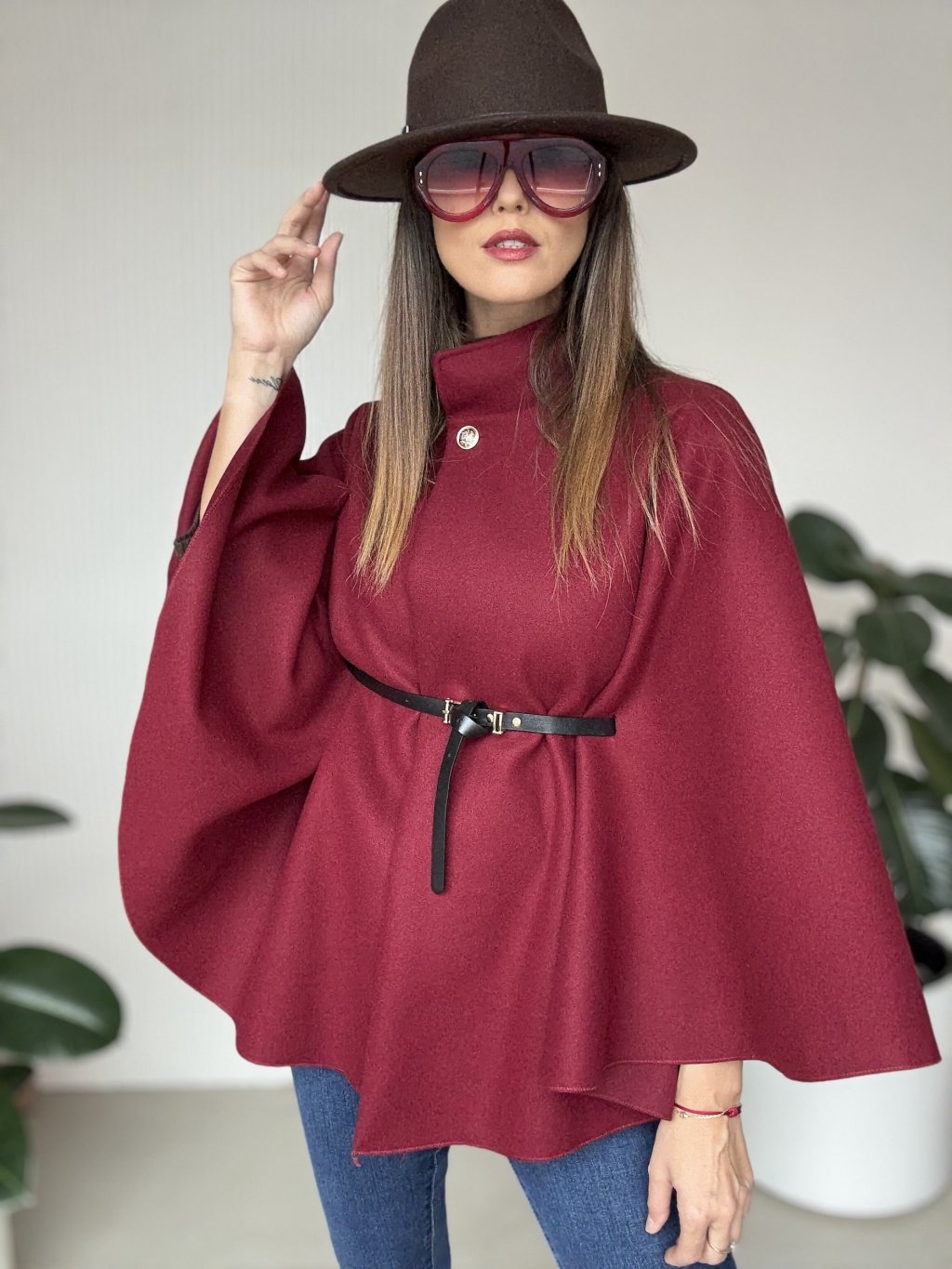 Poncho z paskiem i ozdobnym zapięciem dla oryginalnego i eleganckiego stroju.