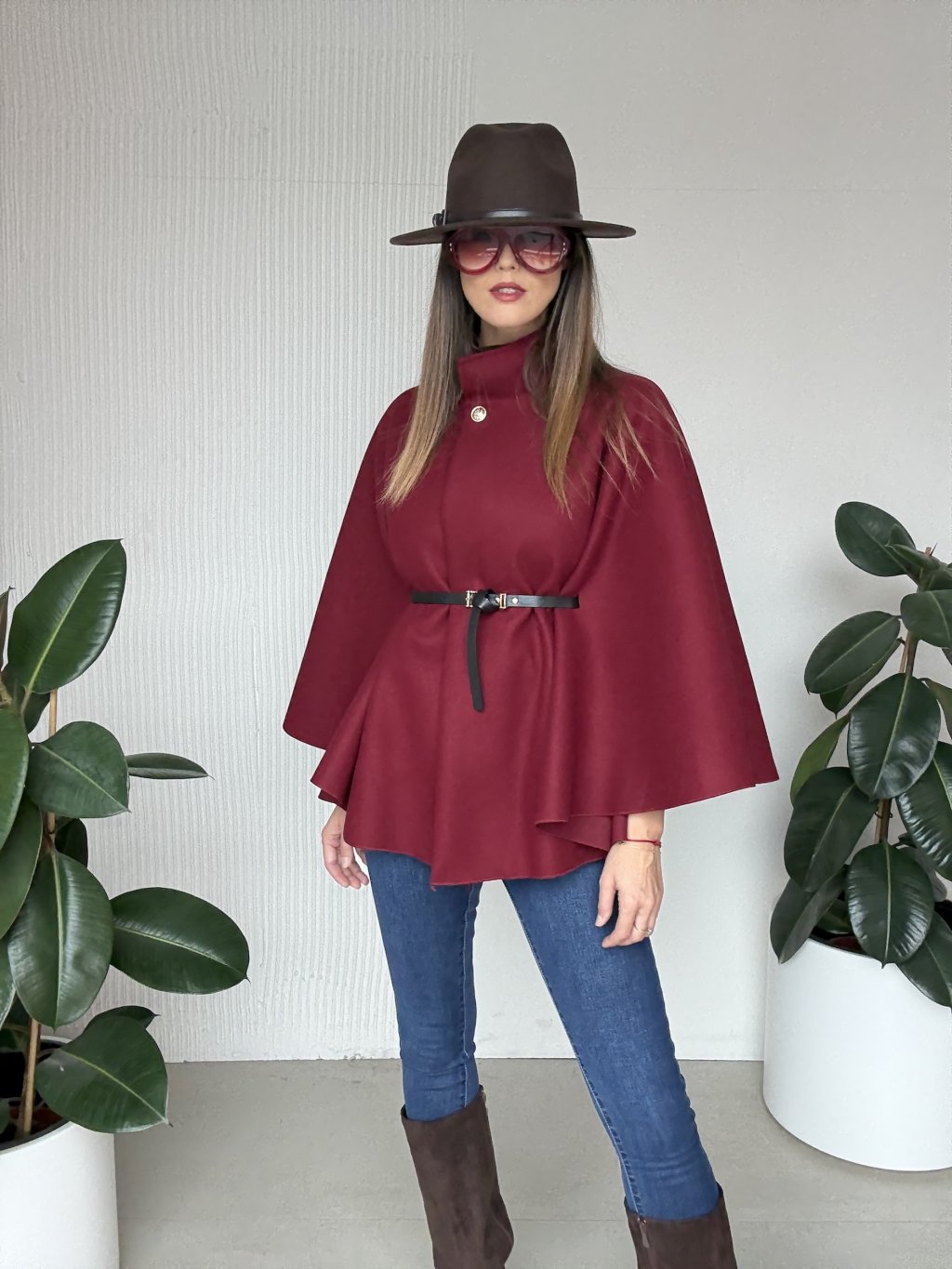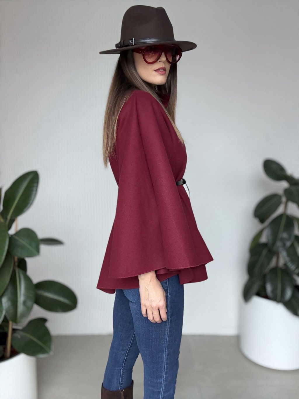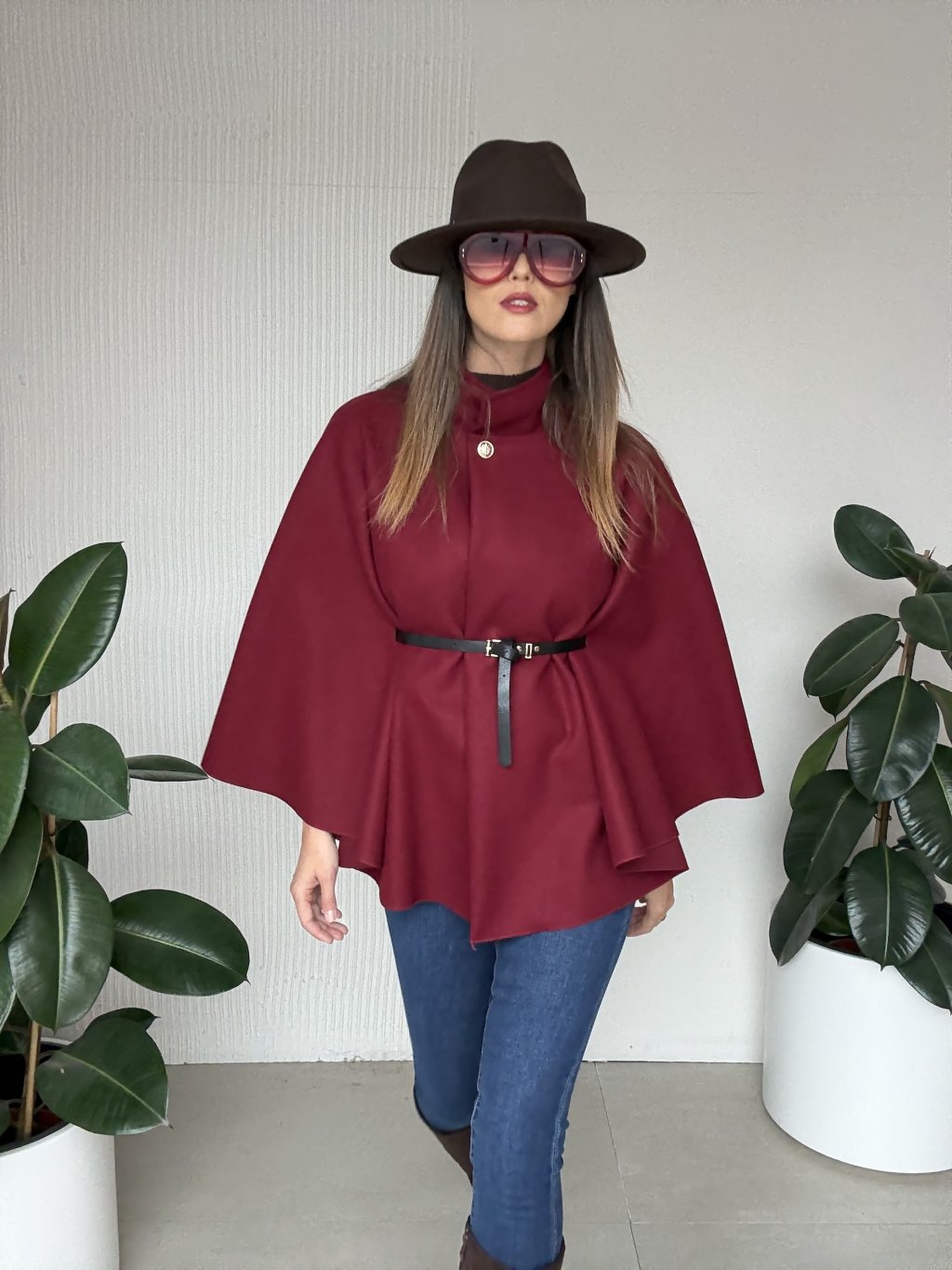 Poncho z paskiem i ozdobnym zapięciem dla oryginalnego i eleganckiego stroju.
