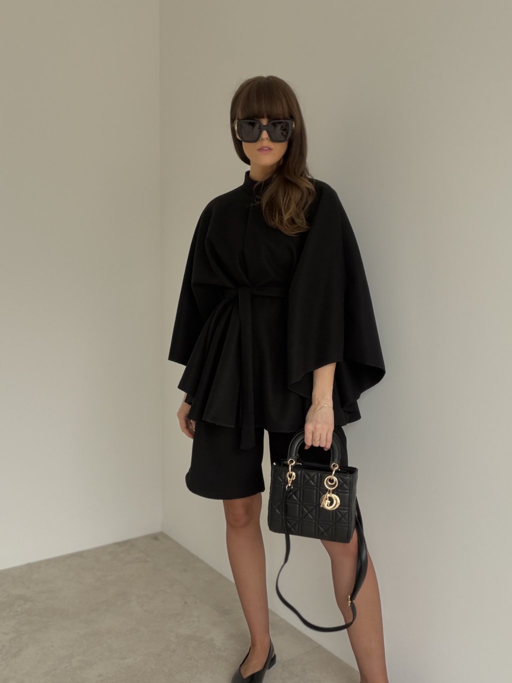 Eleganckie ponczo o czystym, ponadczasowym kroju, które wygląda bardzo stylowo, a jednocześnie jest niezwykle wygodne. Luźniejszy fason typu „cape” pięknie się układa, delikatnie pracuje w ruchu i nadaje stylizacji wyrazisty, ale wciąż minimalistyczny charakter. Model ma stójkę oraz zapięcie pod szyją, dzięki czemu prezentuje się schludnie nawet bez dodatkowych warstw. W talii znajduje się wiązanie, które pozwala dopasować sylwetkę – możesz nosić je swobodnie dla bardziej casualowego efektu albo zawiązać w talii, aby podkreślić figurę. To idealny wybór na okres przejściowy, do miasta, na spotkania i na wieczór, gdy chcesz wyglądać szykownie bez wysiłku.