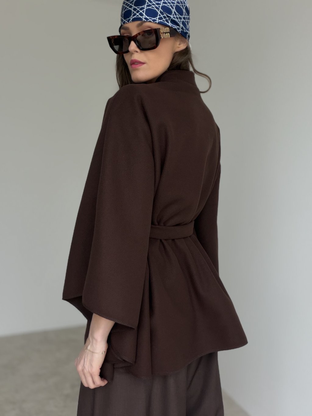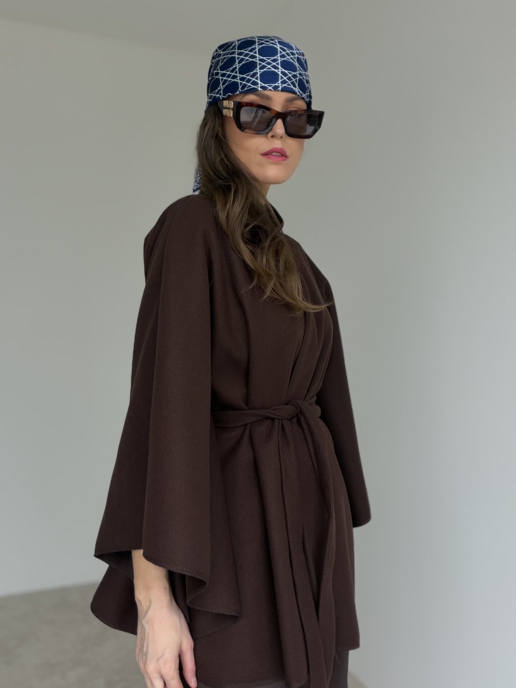 Ponadczasowe ponczo ze stójką i wiązaniem w talii, które nadaje stylizacji elegancki i wyrazisty charakter.