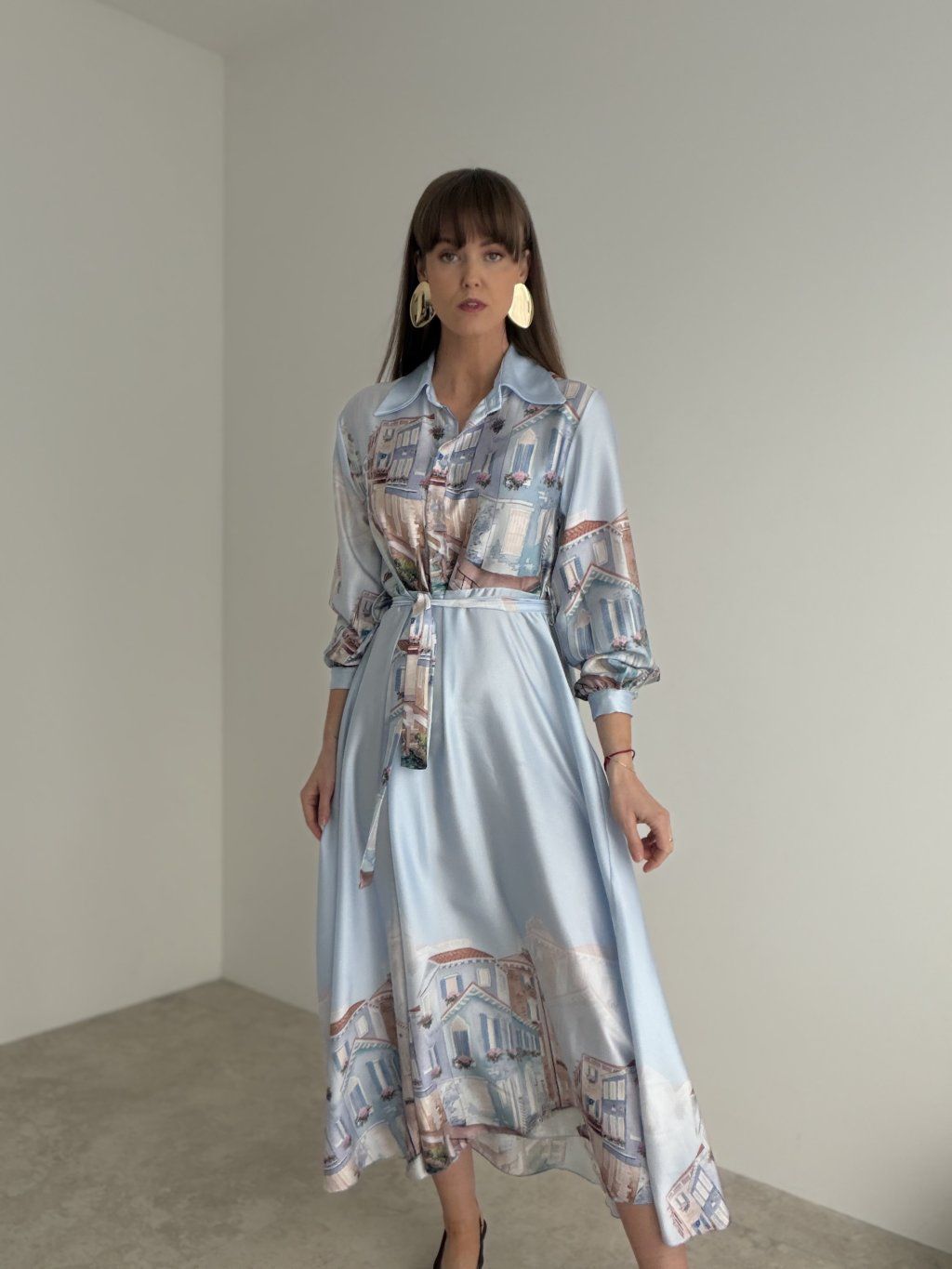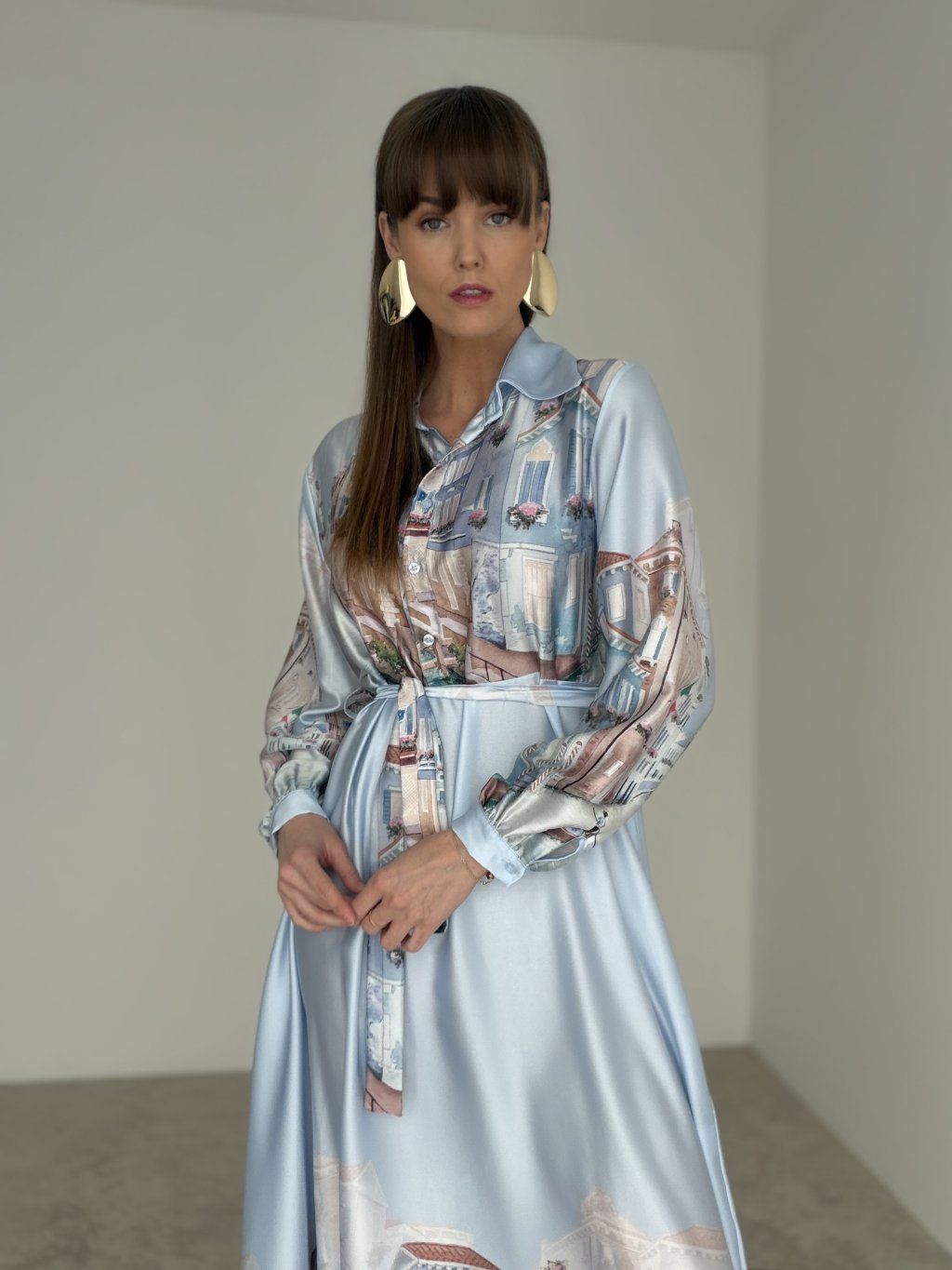 Satynowa sukienka prezentuje się elegancko, delikatnie i bardzo kobieco. Lejący materiał nadaje jej lekkości i wyrafinowanego charakteru, a wiązanie w talii pięknie podkreśla sylwetkę. Kołnierzyk oraz długie rękawy dodają całości uporządkowanego i ponadczasowego wyglądu, dzięki czemu model sprawdzi się zarówno na bardziej wyjątkowe okazje, jak i wtedy, gdy chcesz wyglądać szczególnie stylowo. Delikatny wzór nadaje sukience oryginalnego akcentu i sprawia, że wyróżnia się w subtelny, elegancki sposób. Materiał lekko prześwituje, dlatego zalecamy dobranie cielistej lub dyskretnej bielizny.