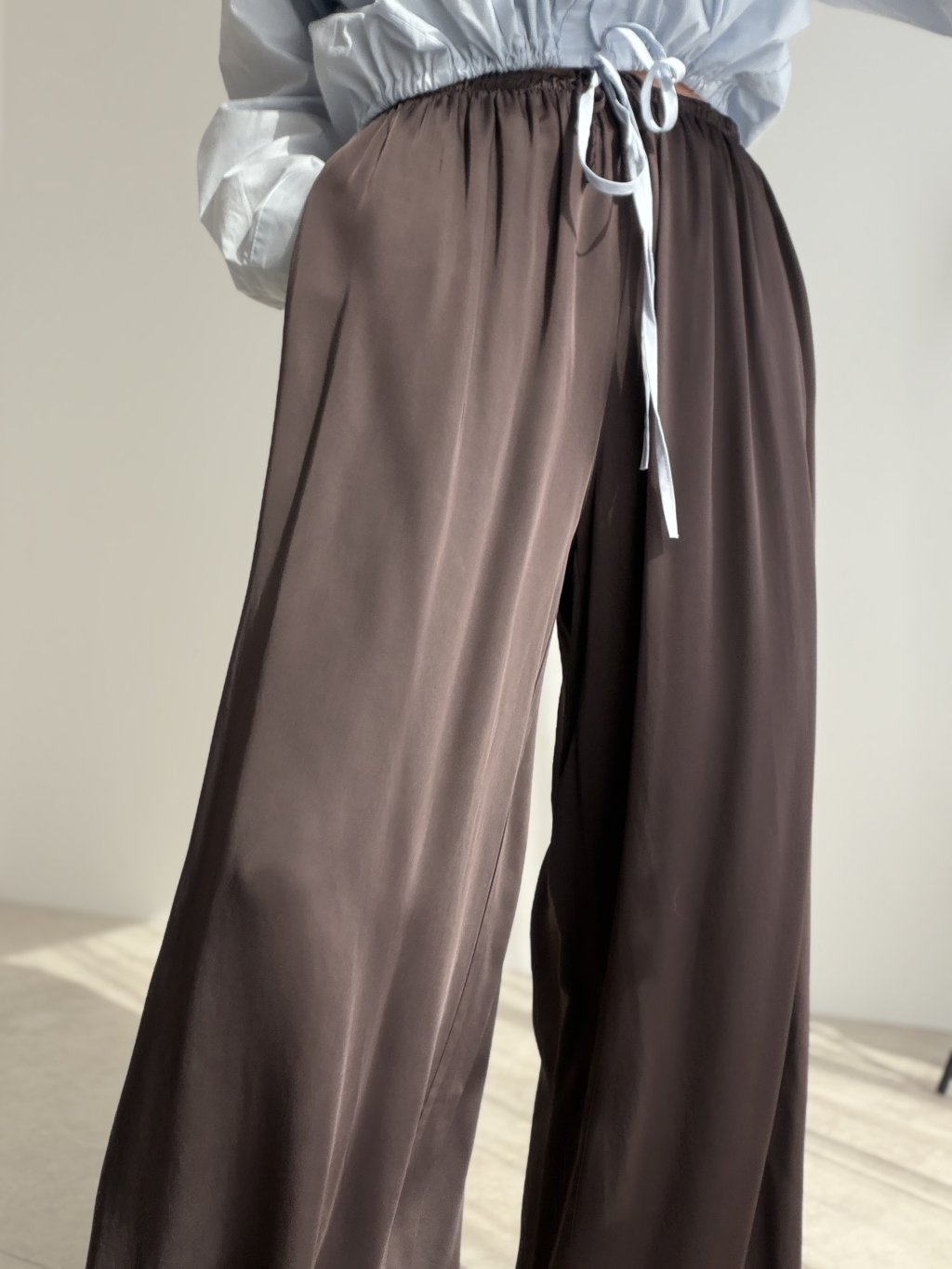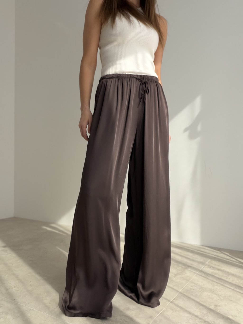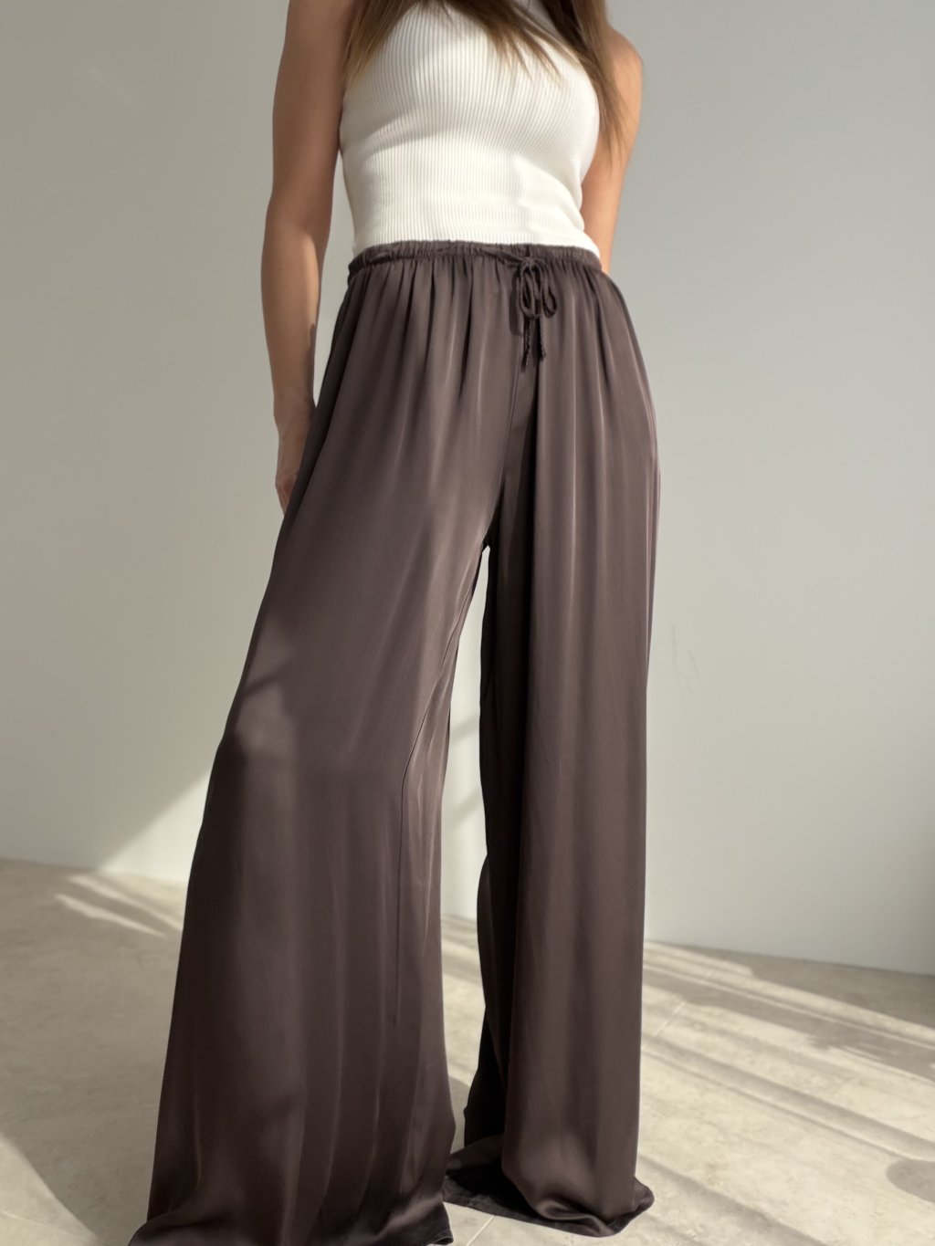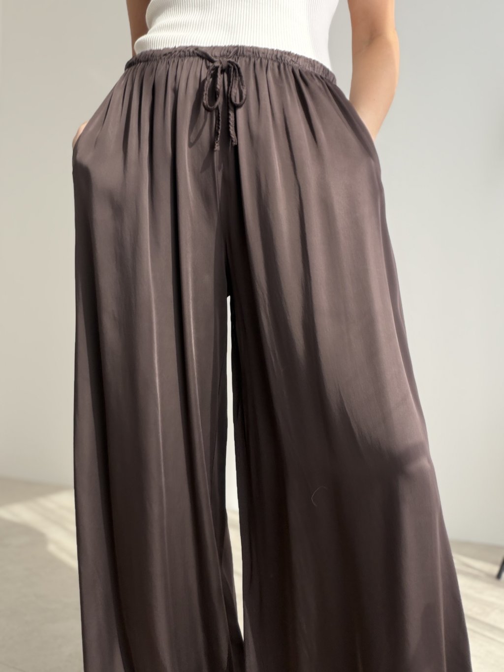 Lejące satynowe spodnie z szeroką nogawką, elastycznym pasem ze sznurkiem i kieszeniami. Eleganckie, wygodne i łatwe do stylizacji.