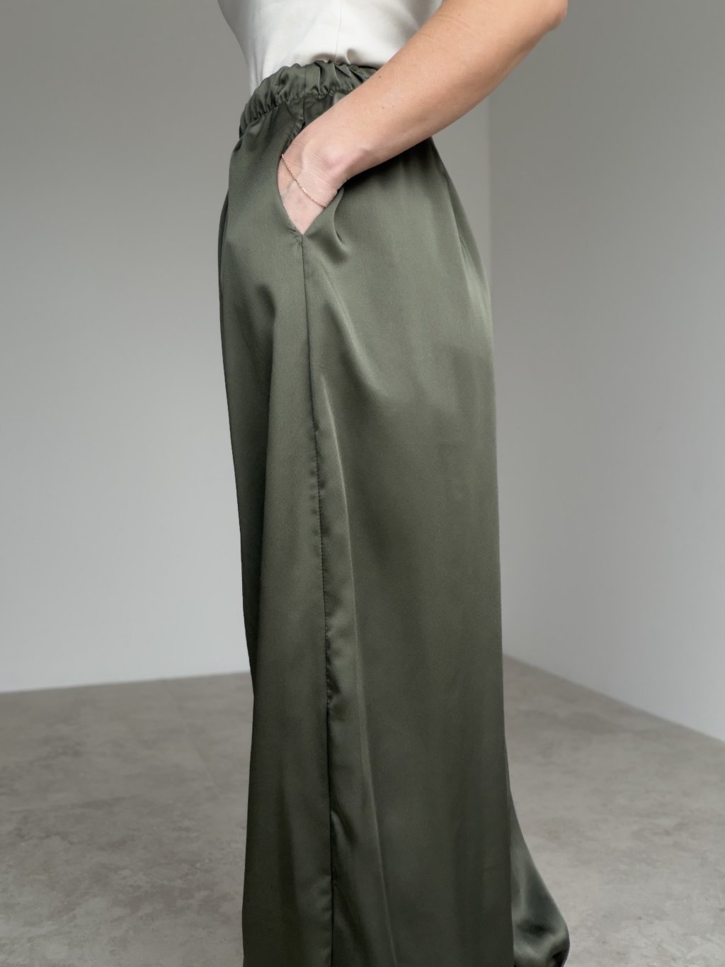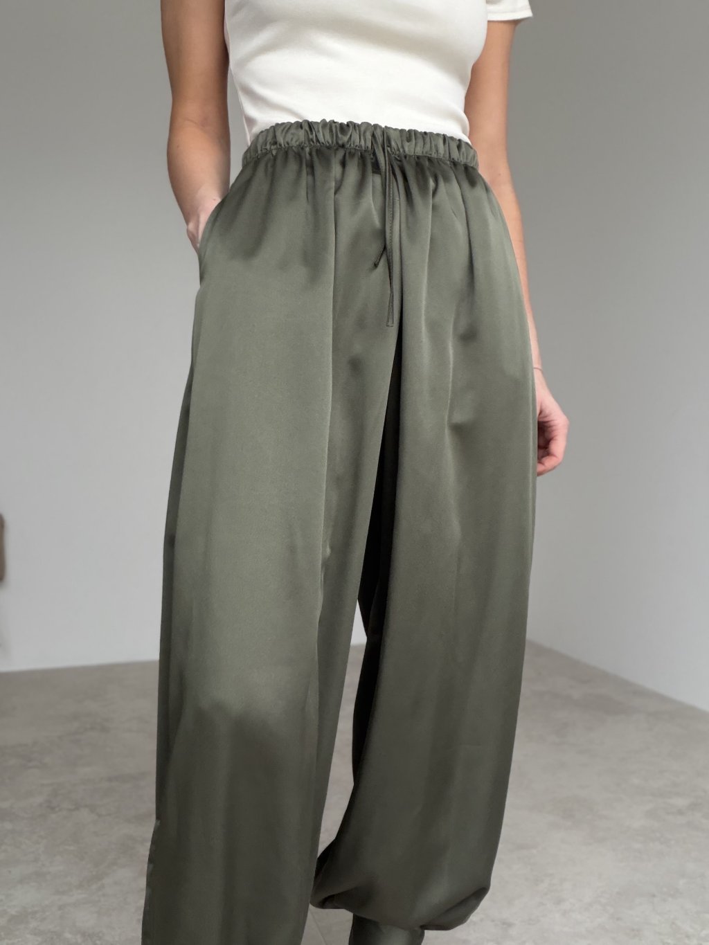 Satynowe spodnie z wyższym, elastycznym stanem i troczkiem. Luźniejszy fason z mankietami przy kostkach wygląda nowocześnie i elegancko.