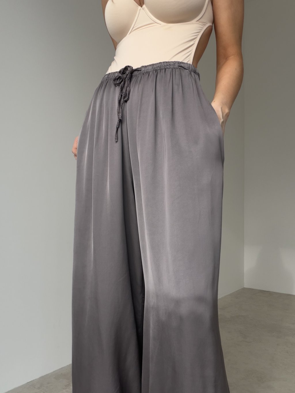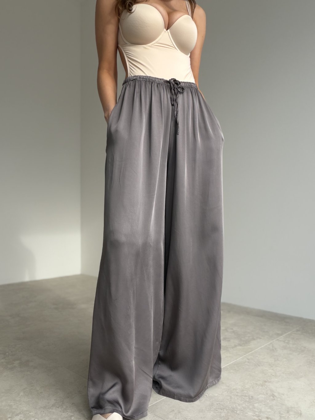 Lejące satynowe spodnie z szeroką nogawką, elastycznym pasem ze sznurkiem i kieszeniami. Eleganckie, wygodne i łatwe do stylizacji.