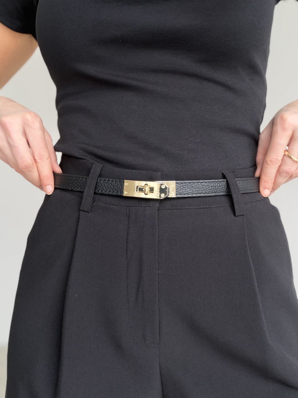 Wąski skórzany pasek z wyrazistą metalową klamrą. Uniwersalny dodatek do spodni, spódnic i sukienek.