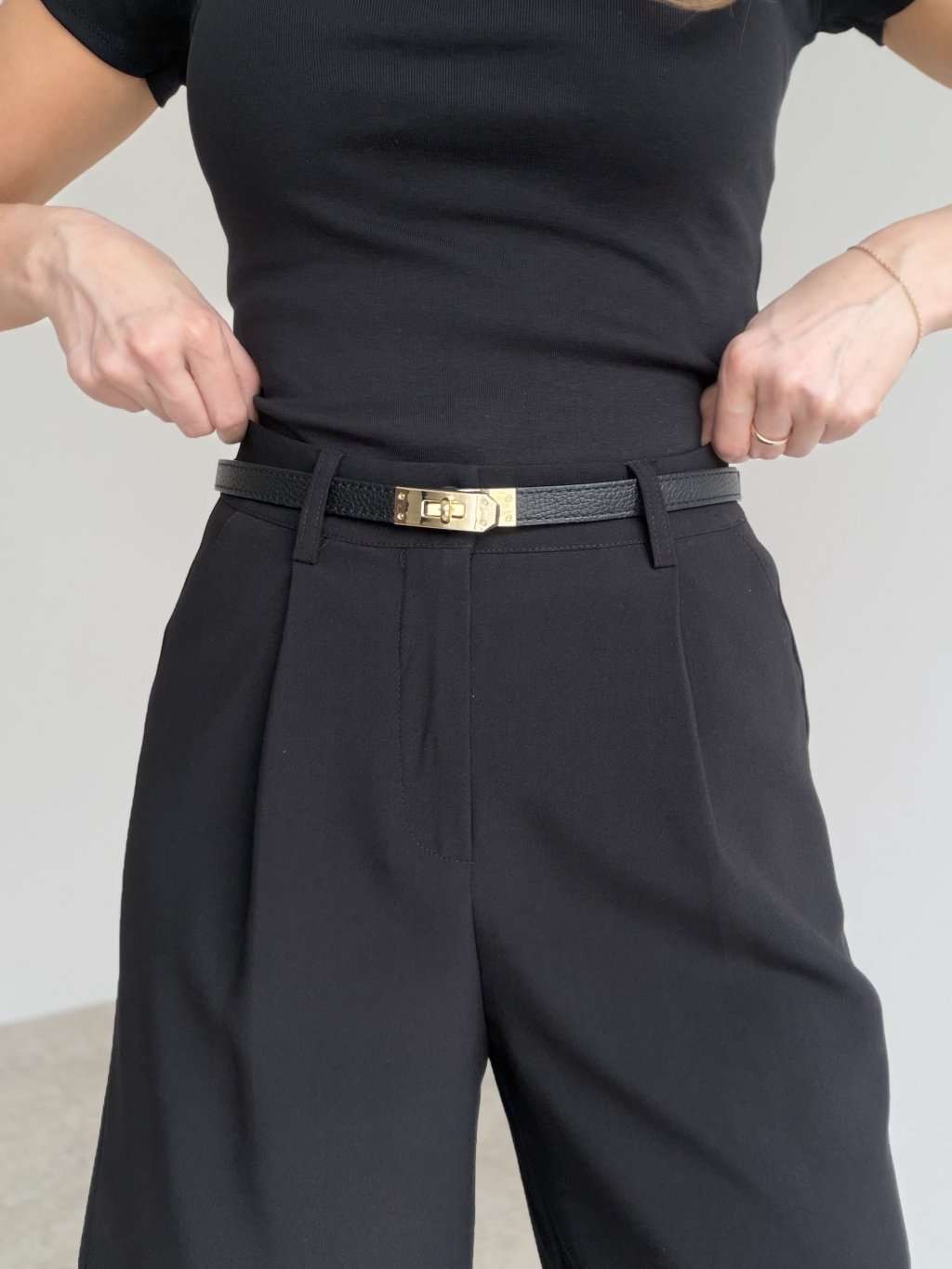 Przy prostych stylizacjach pozwól wybrzmieć klamrze i dobierz delikatną biżuterię.