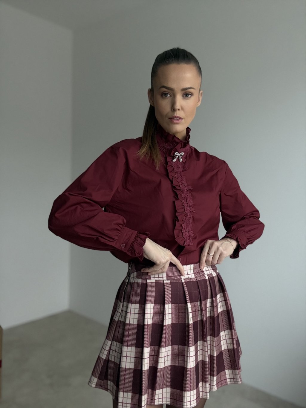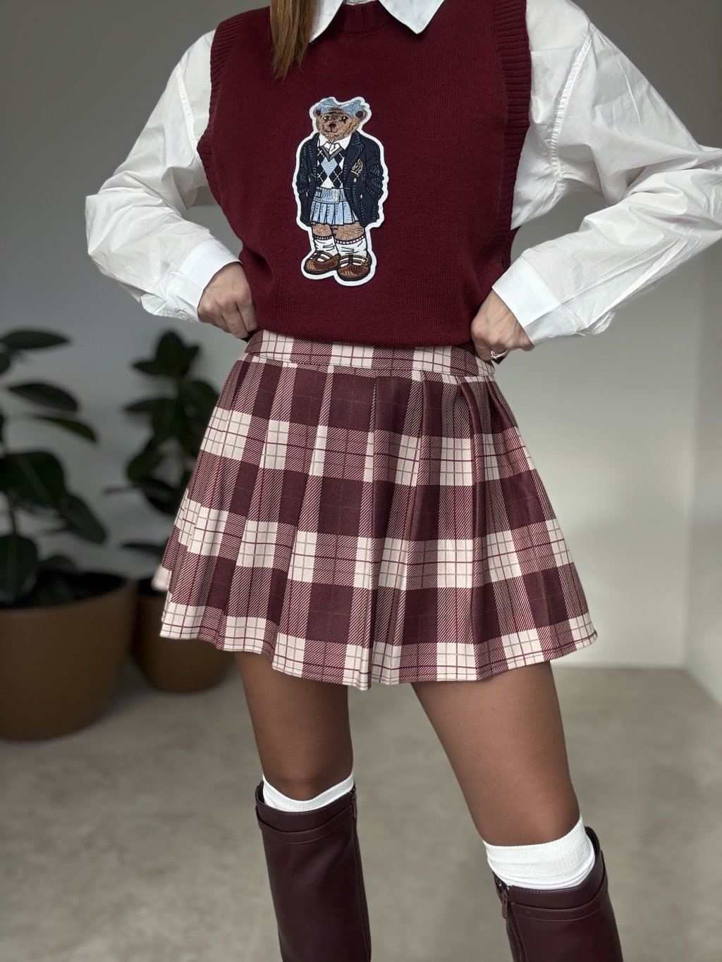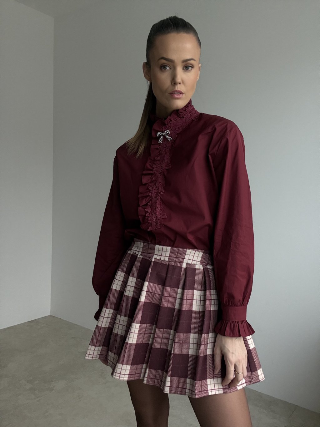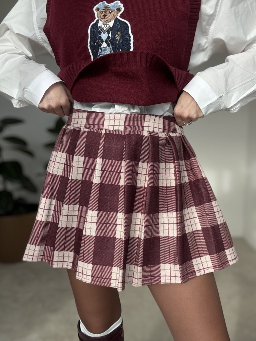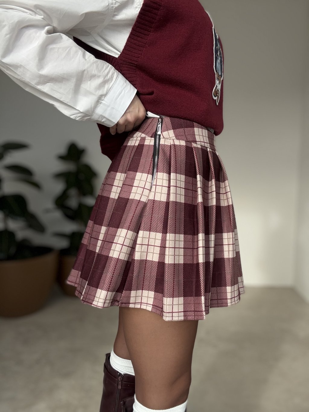 Plisowana spódnica w kratę o czystej, uporządkowanej linii, która świetnie trzyma kształt. Osadzona w pasie, zapinana na suwak z boku, z podszewką i wszytymi krótkimi spodenkami dla swobodnego ruchu. Strukturalny materiał nadaje objętość i elegancki ruch przy chodzeniu. Doskonale komponuje się z prostym swetrem, koszulą lub marynarką.