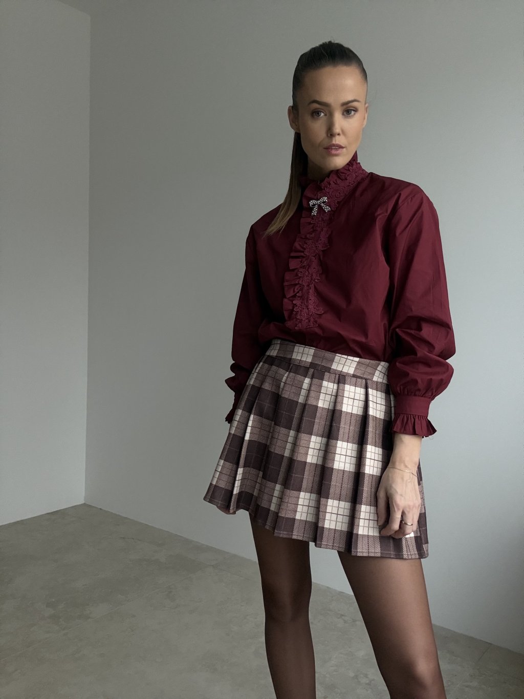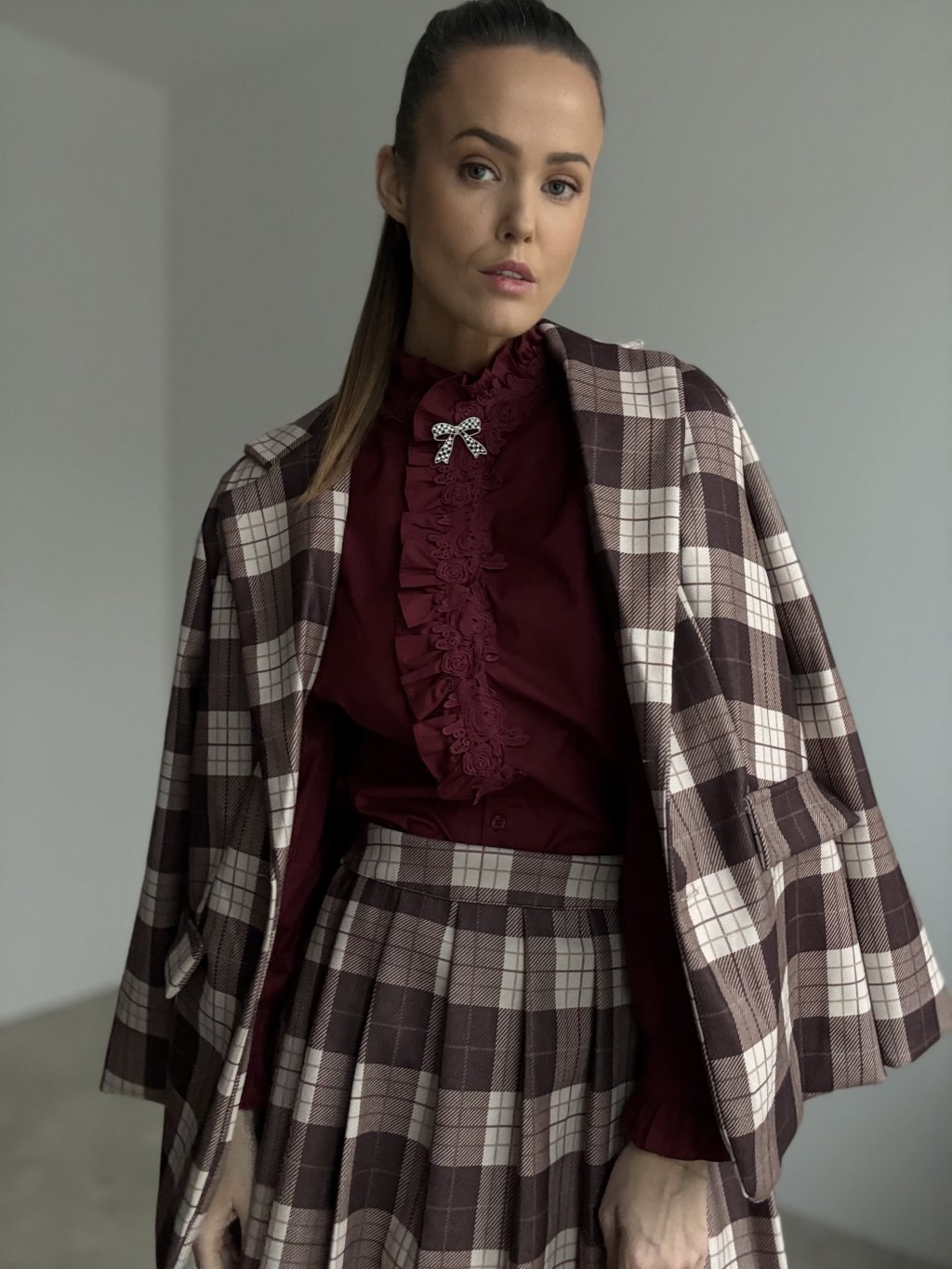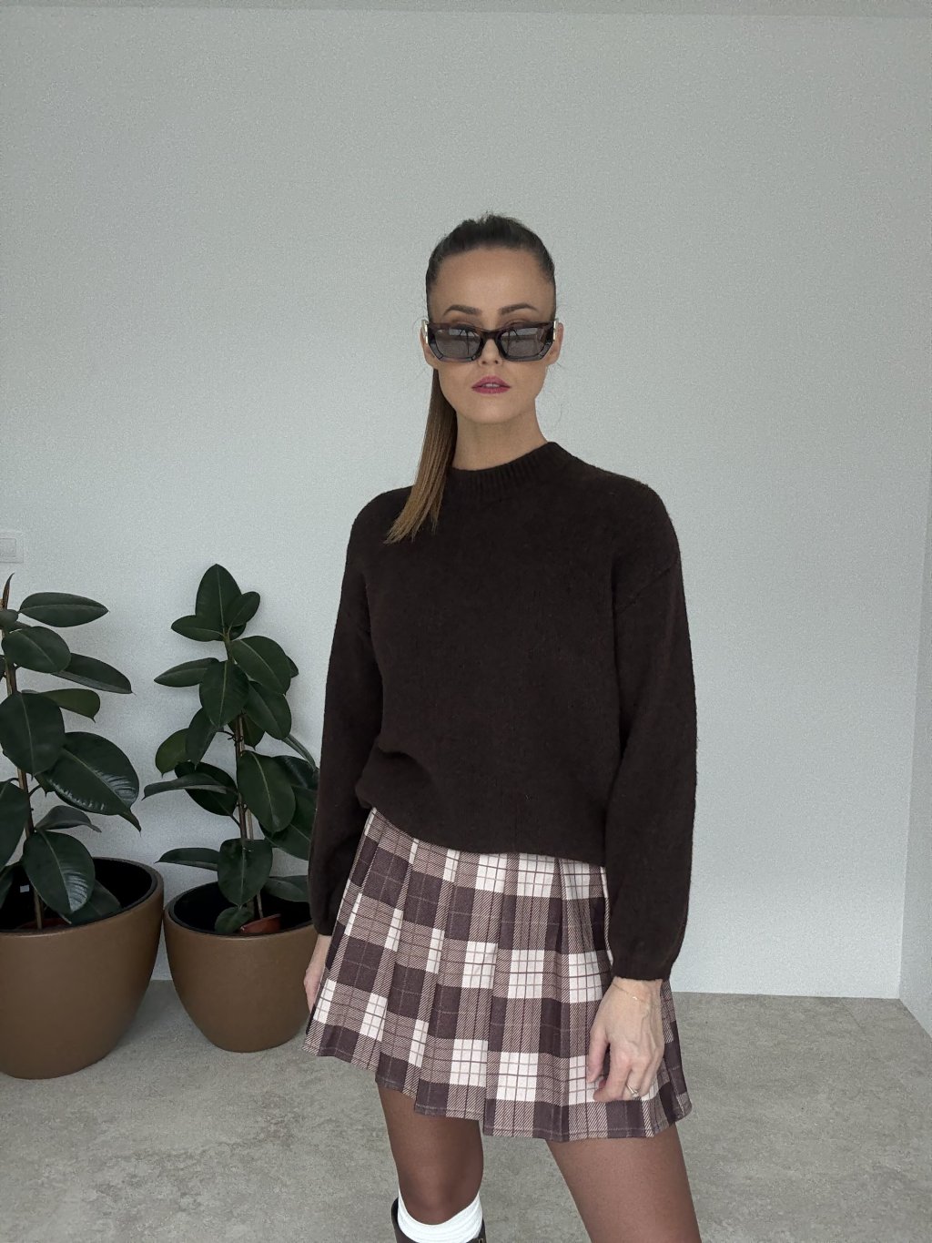 Plisowana spódnica w kratę o czystej, uporządkowanej linii, która świetnie trzyma kształt. Osadzona w pasie, zapinana na suwak z boku, z podszewką i wszytymi krótkimi spodenkami dla swobodnego ruchu. Strukturalny materiał nadaje objętość i elegancki ruch przy chodzeniu. Doskonale komponuje się z prostym swetrem, koszulą lub marynarką.