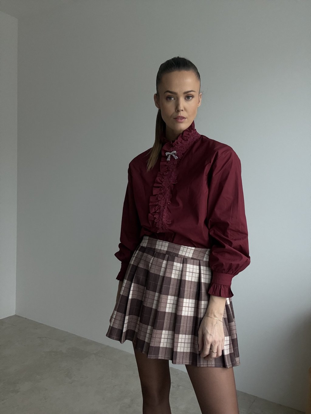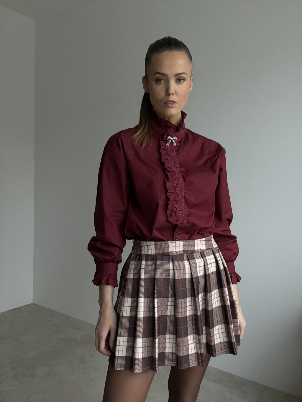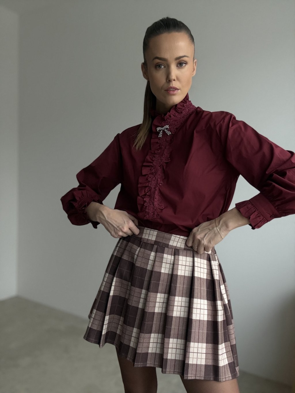 Plisowana spódnica w kratę o czystej, uporządkowanej linii, która świetnie trzyma kształt. Osadzona w pasie, zapinana na suwak z boku, z podszewką i wszytymi krótkimi spodenkami dla swobodnego ruchu. Strukturalny materiał nadaje objętość i elegancki ruch przy chodzeniu. Doskonale komponuje się z prostym swetrem, koszulą lub marynarką.
