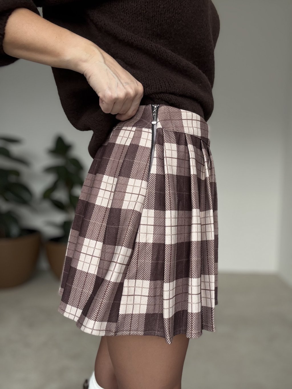 Plisowana spódnica w kratę z bocznym suwakiem i wszytymi spodenkami dla wygody i pewności.