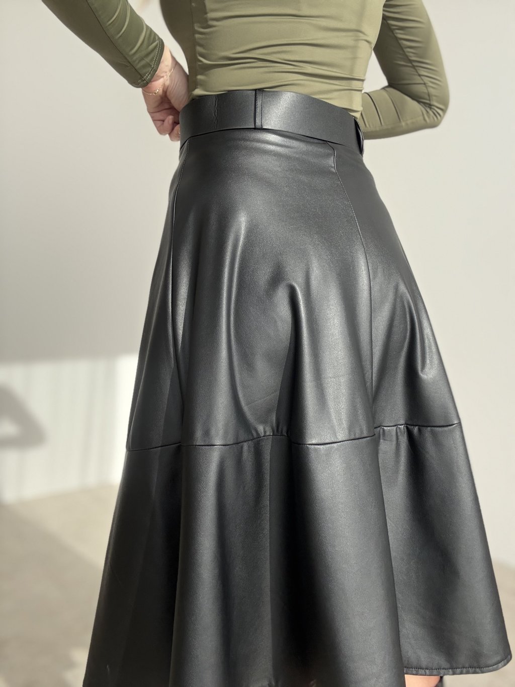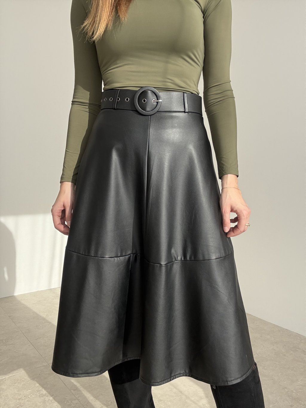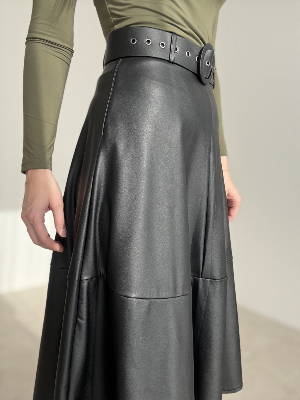 Spódnica midi z miękkiej ekoskóry z wysokim stanem i kobiecą, rozszerzaną linią A. Gładkie wykończenie nadaje elegancki wygląd, a przeszycia przy dole pomagają utrzymać kształt. W zestawie szeroki pasek z wyrazistą, okrągłą klamrą podkreślający talię. Materiał jest wygodny, łatwy w pielęgnacji i dobrze trzyma formę przez cały dzień. Doskonale łączy się z dopasowanymi topami, swetrami i kozakami.