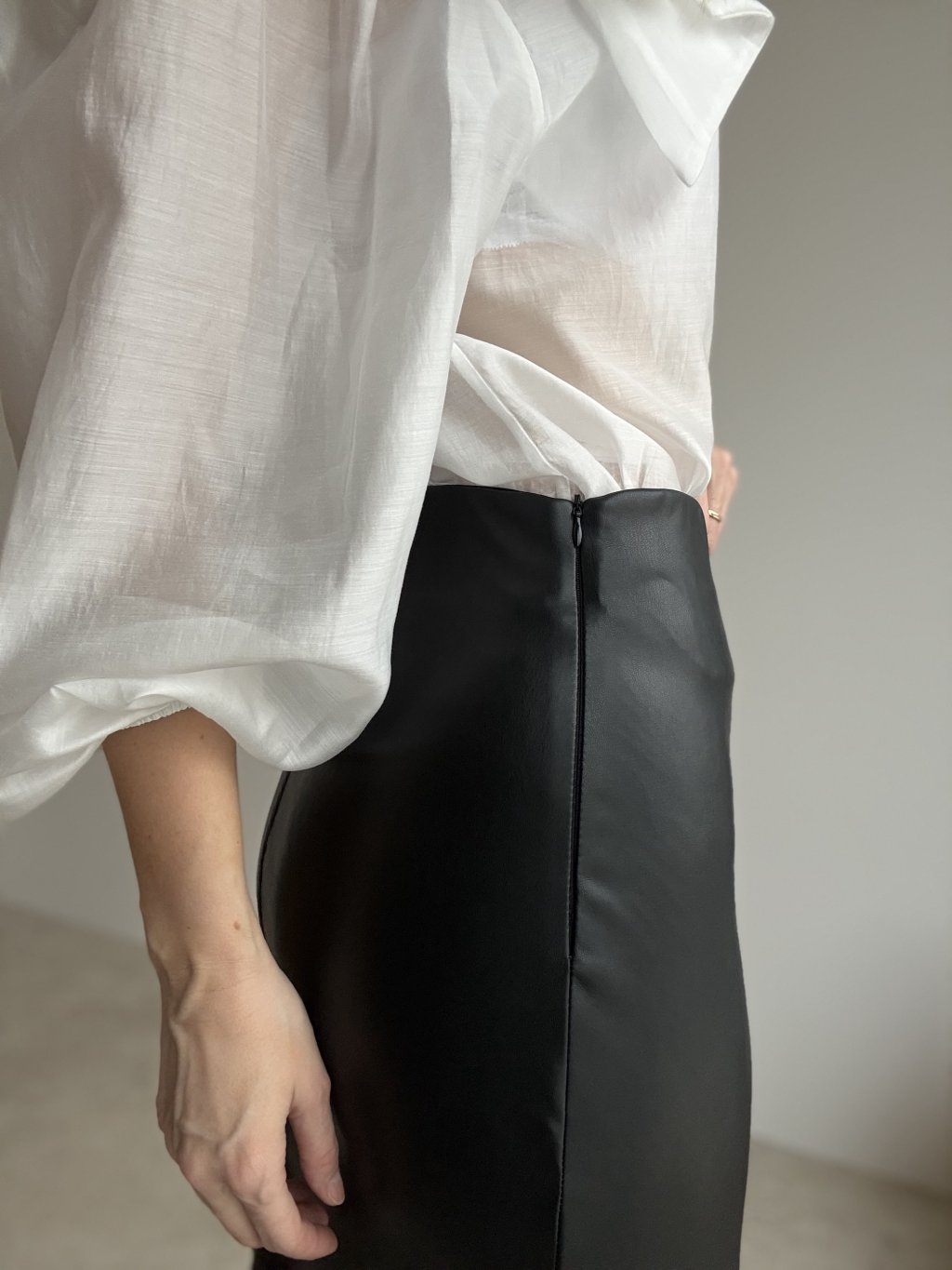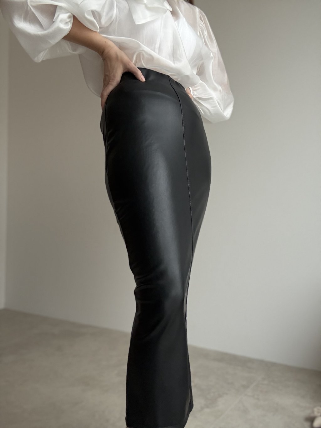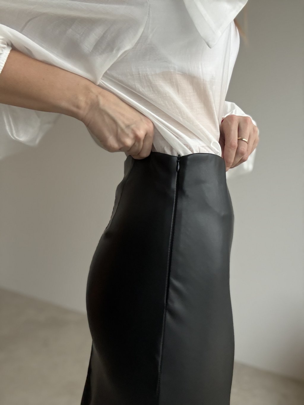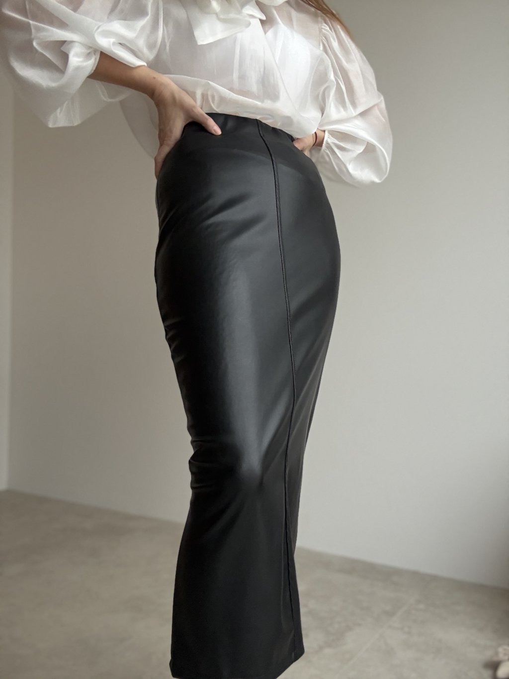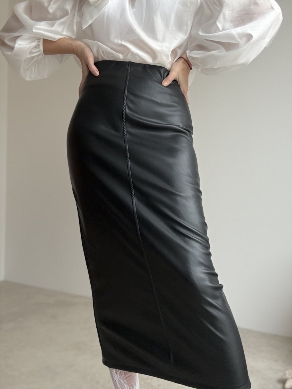 Midi spódnica z ekoskóry z wysokim stanem i rozcięciem z tyłu dla wygodnego noszenia.