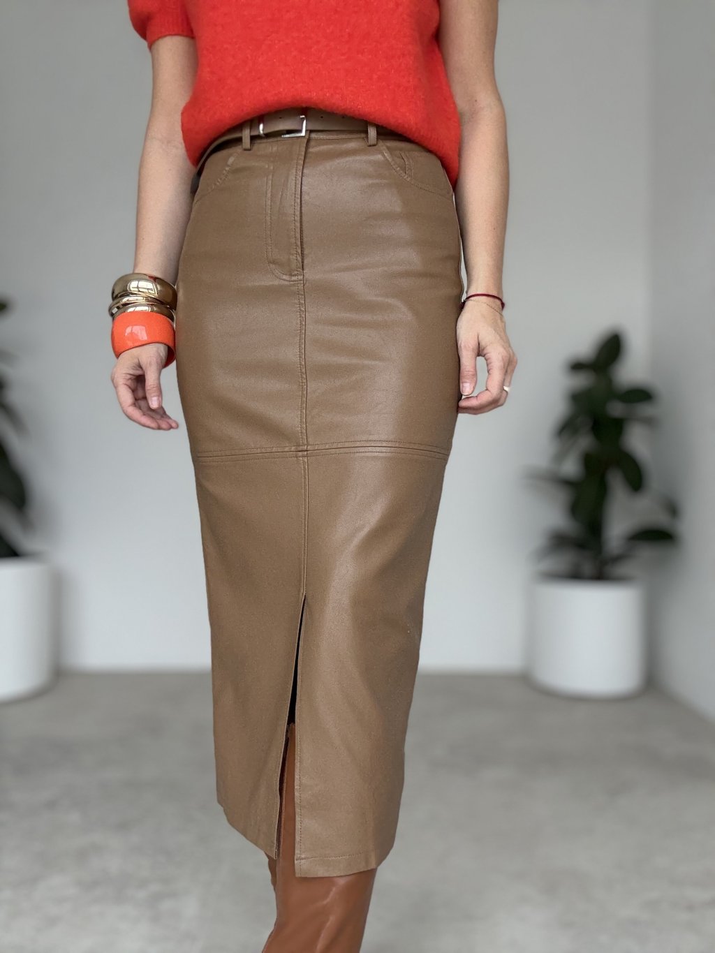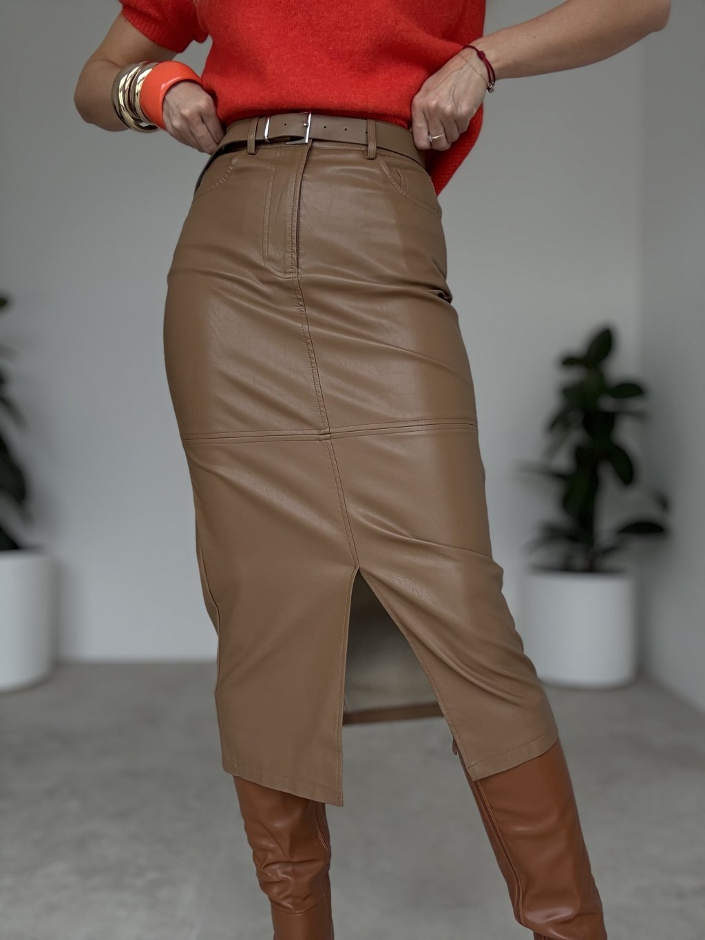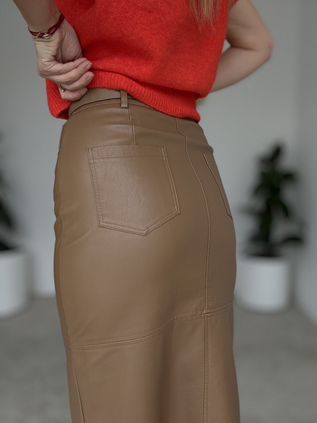 Stylowa spódnica z ekoskóry z kieszeniami i rozcięciem z tyłu.