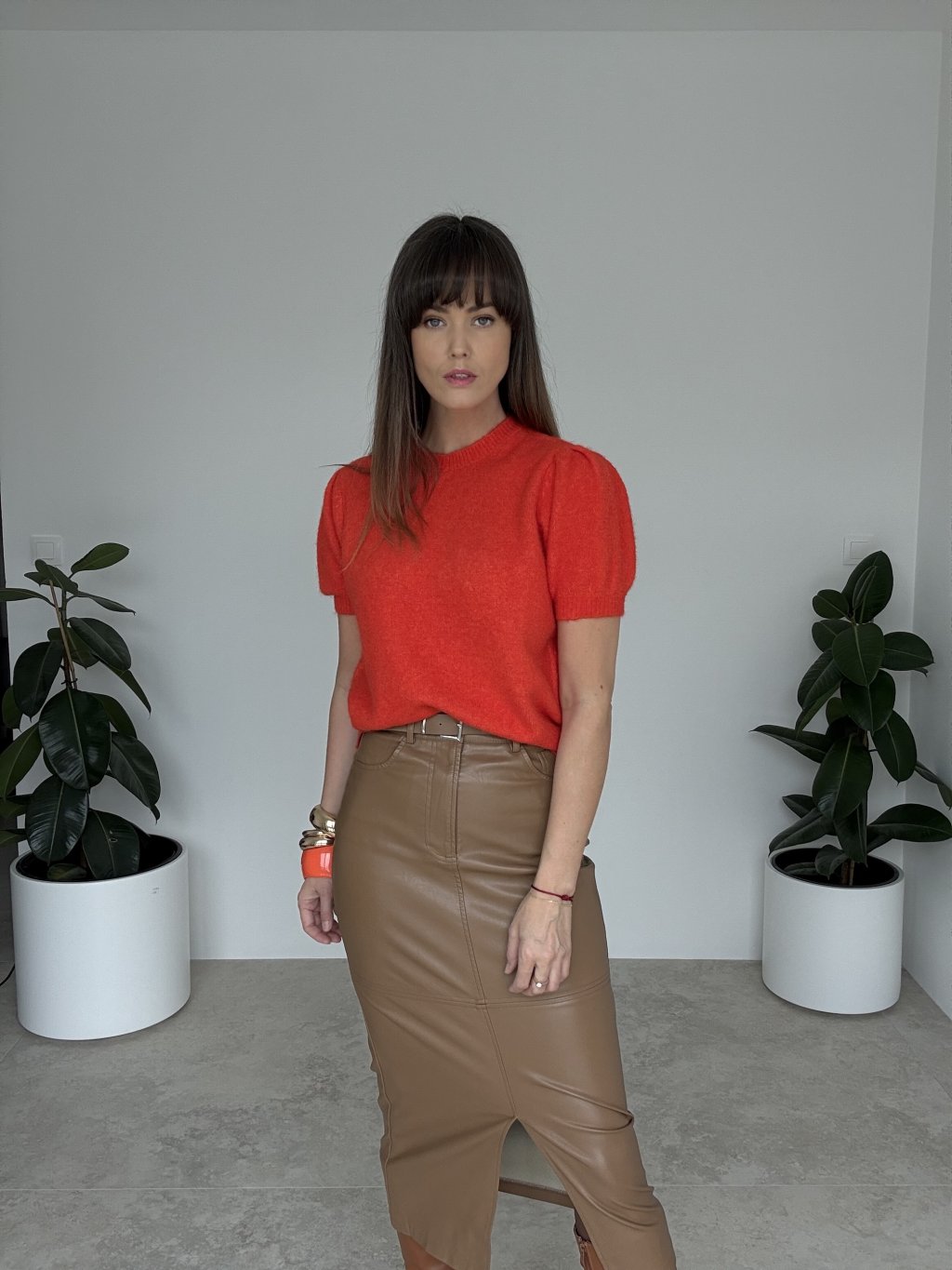 Spódnica z ekoskóry o dopasowanym kroju, która łączy nowoczesny i elegancki styl. Wykonana z wysokiej jakości imitacji skóry, dodaje stylizacji szykownego charakteru. Spódnica posiada praktyczne kieszenie, szlufki na pasek oraz rozcięcie z tyłu dla większej wygody. Uniwersalny model, który świetnie komponuje się ze swetrem, koszulą czy bluzką – idealny do pracy i na co dzień.