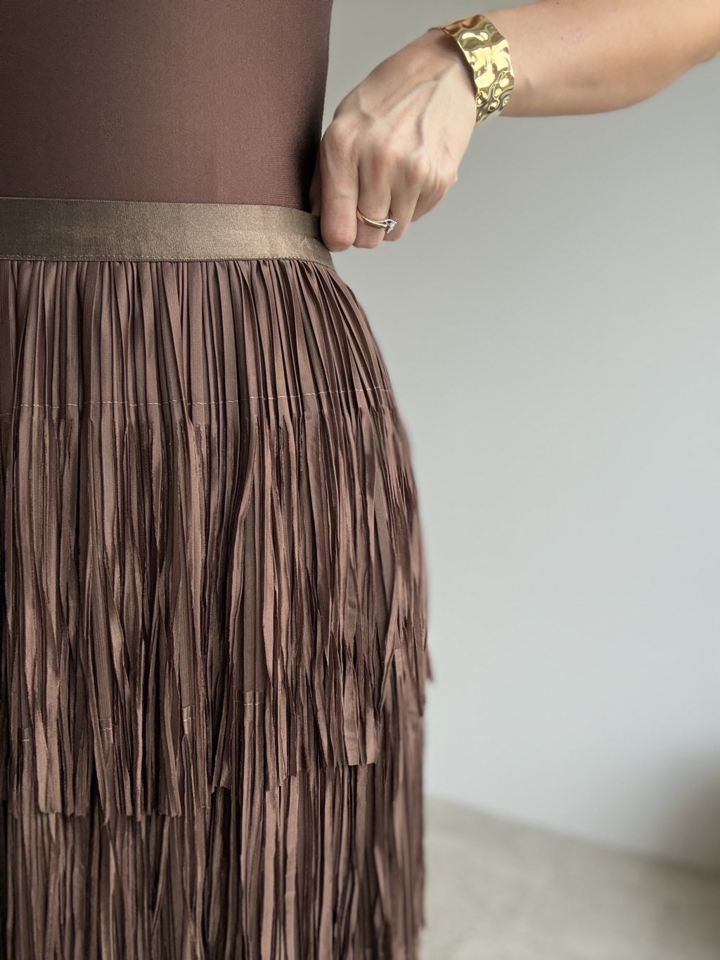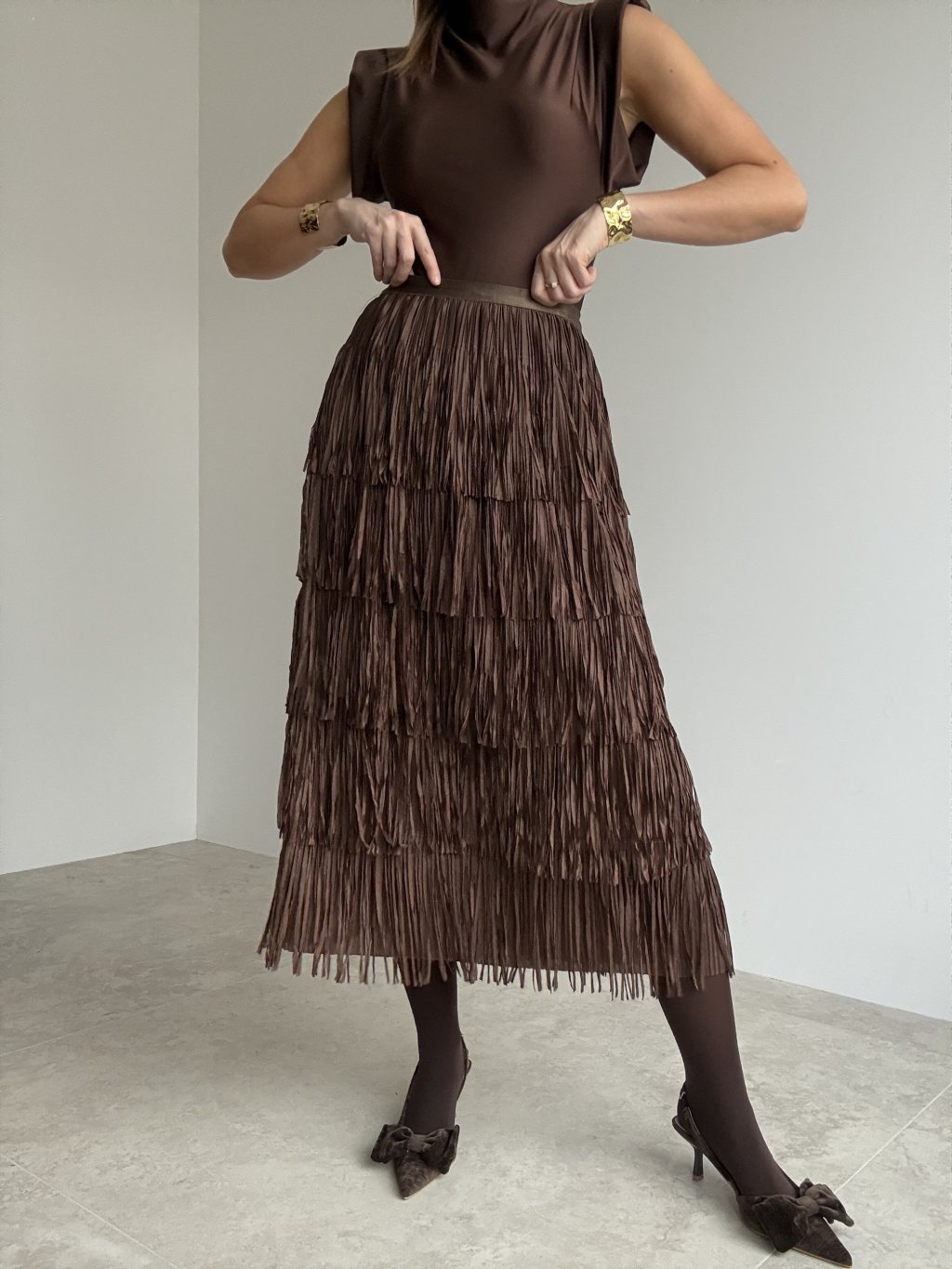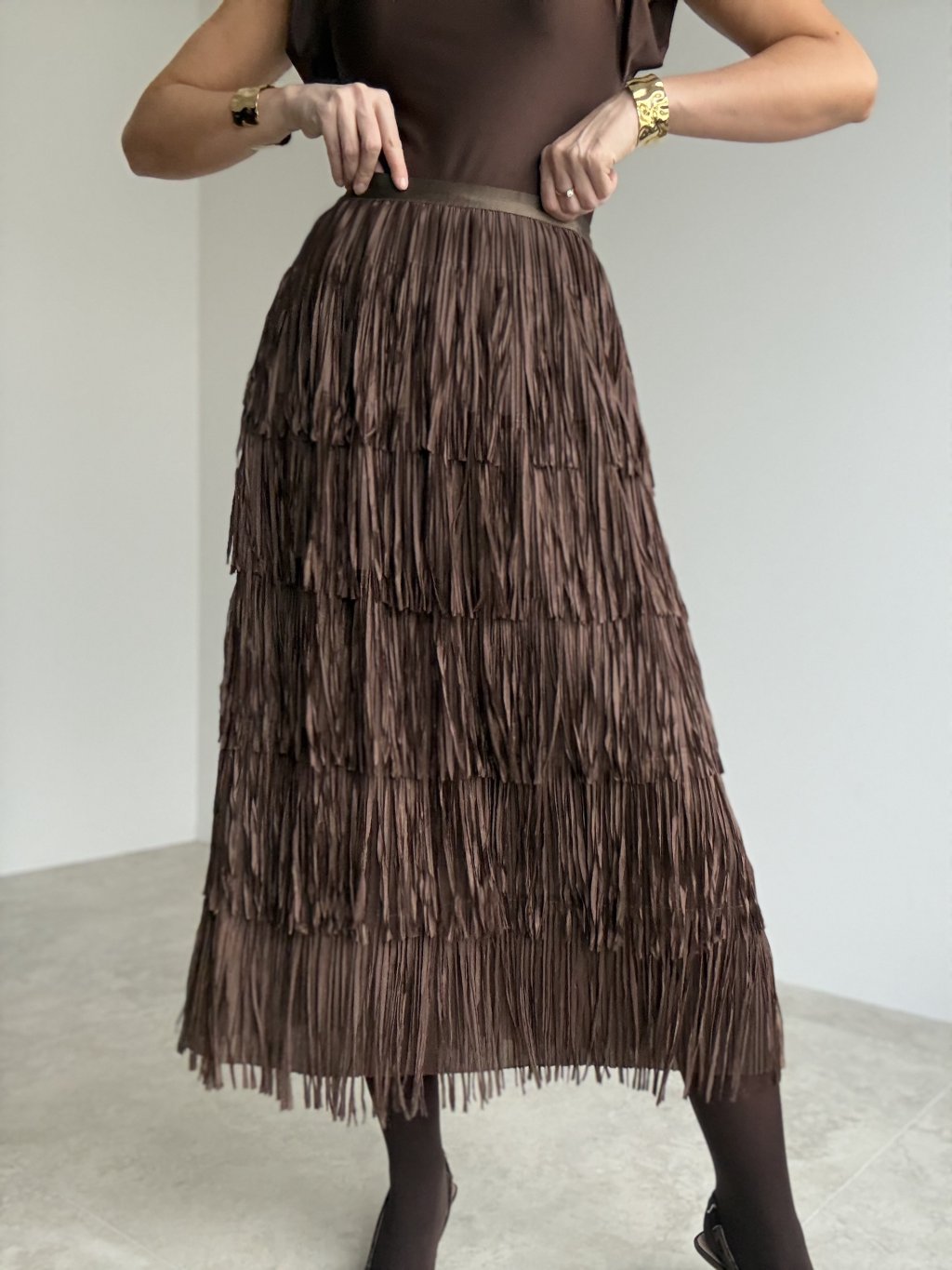 Stylowa spódnica z wieloma warstwami frędzli, które pięknie poruszają się przy każdym kroku.