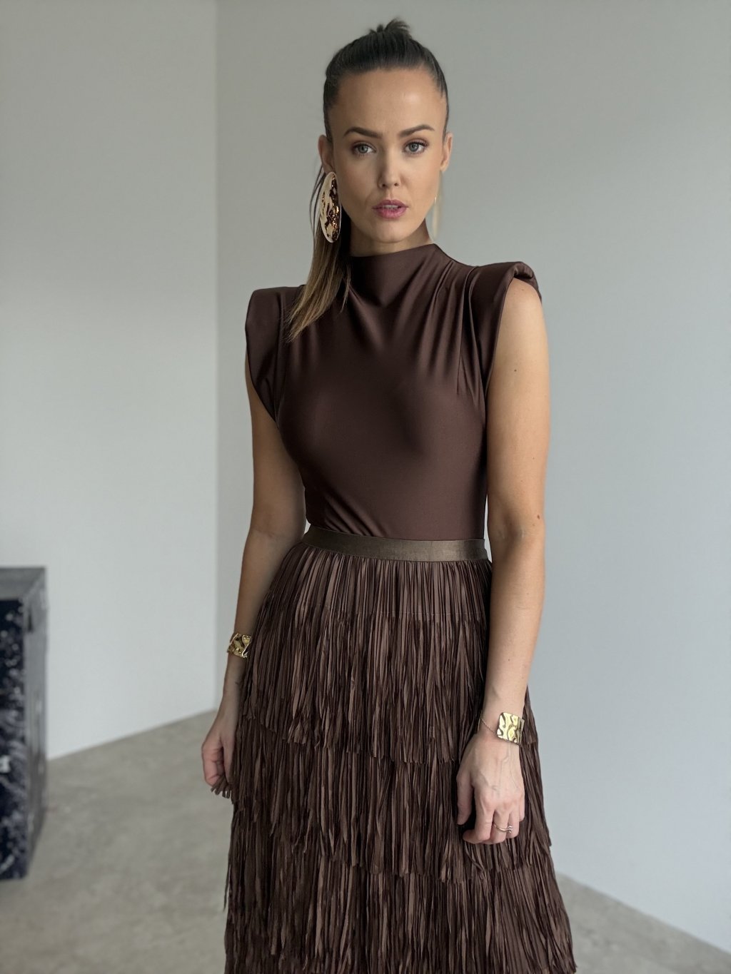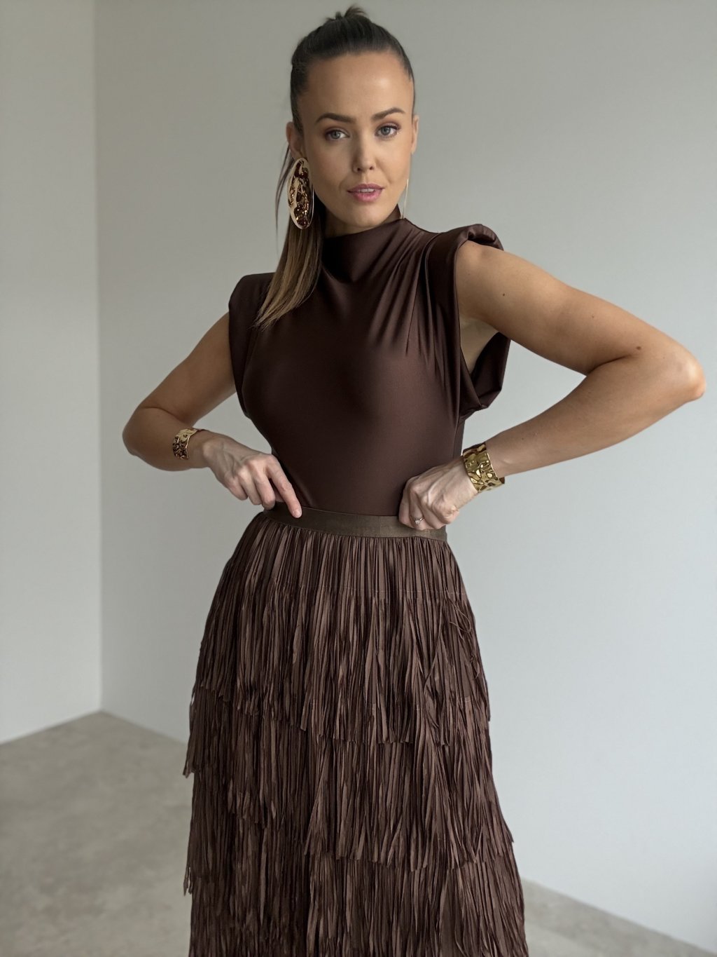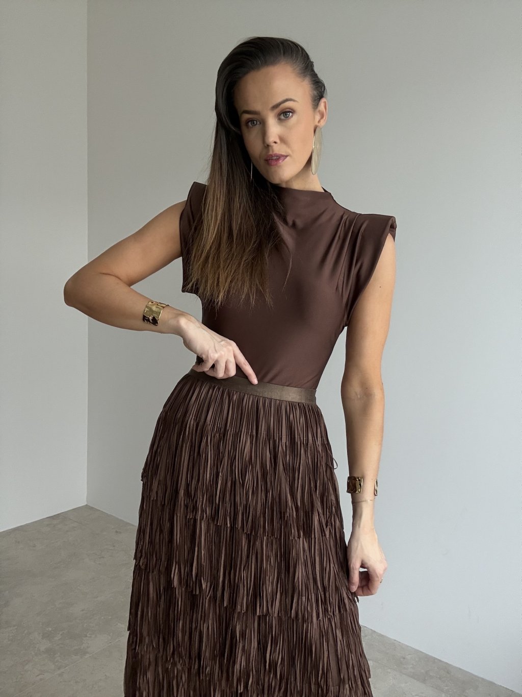 Stylowa spódnica z wieloma warstwami frędzli, które pięknie poruszają się przy każdym kroku.