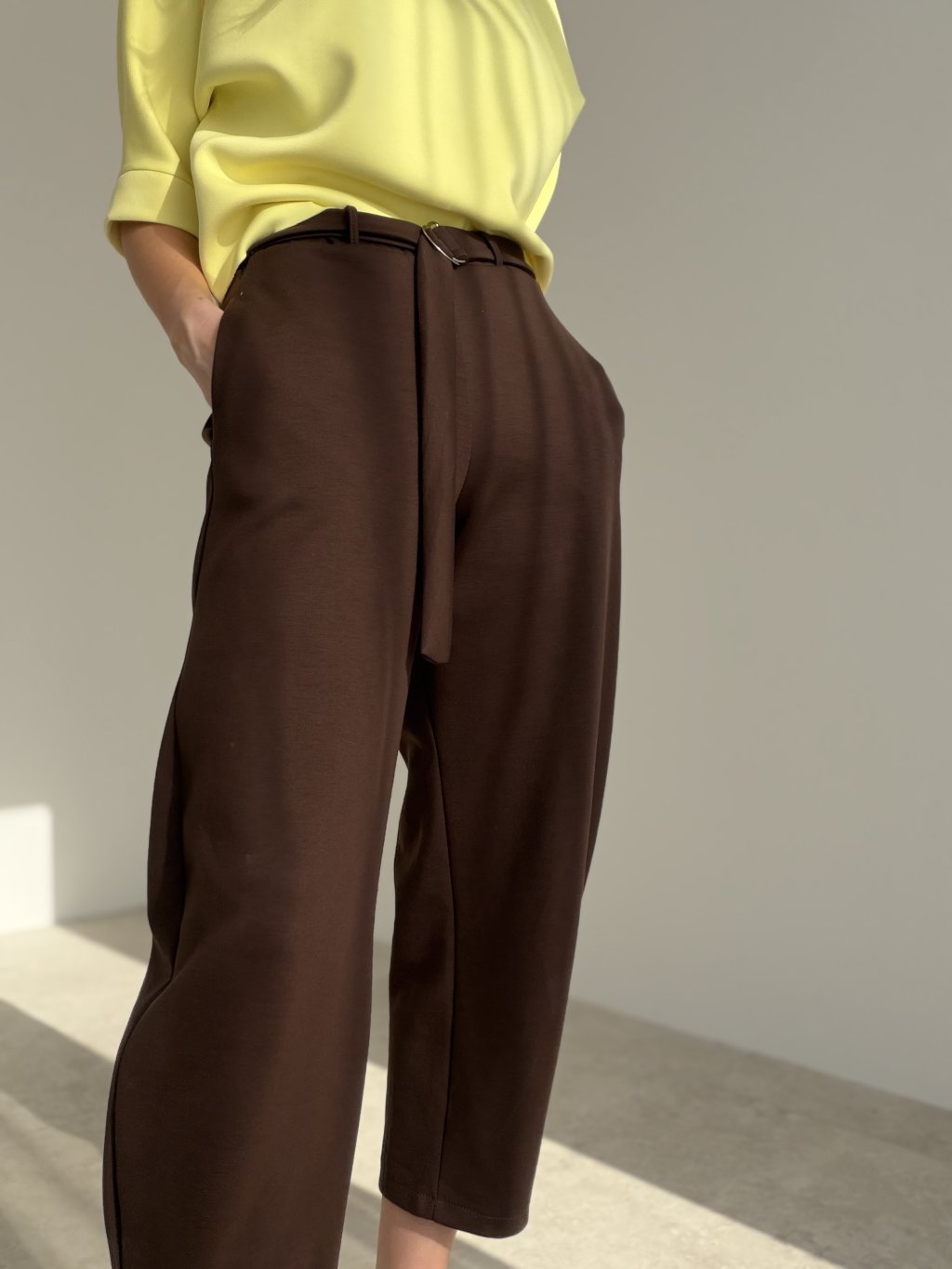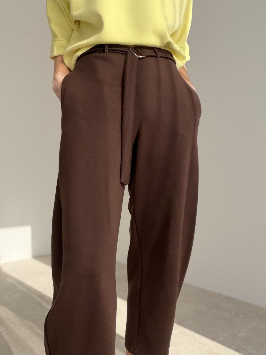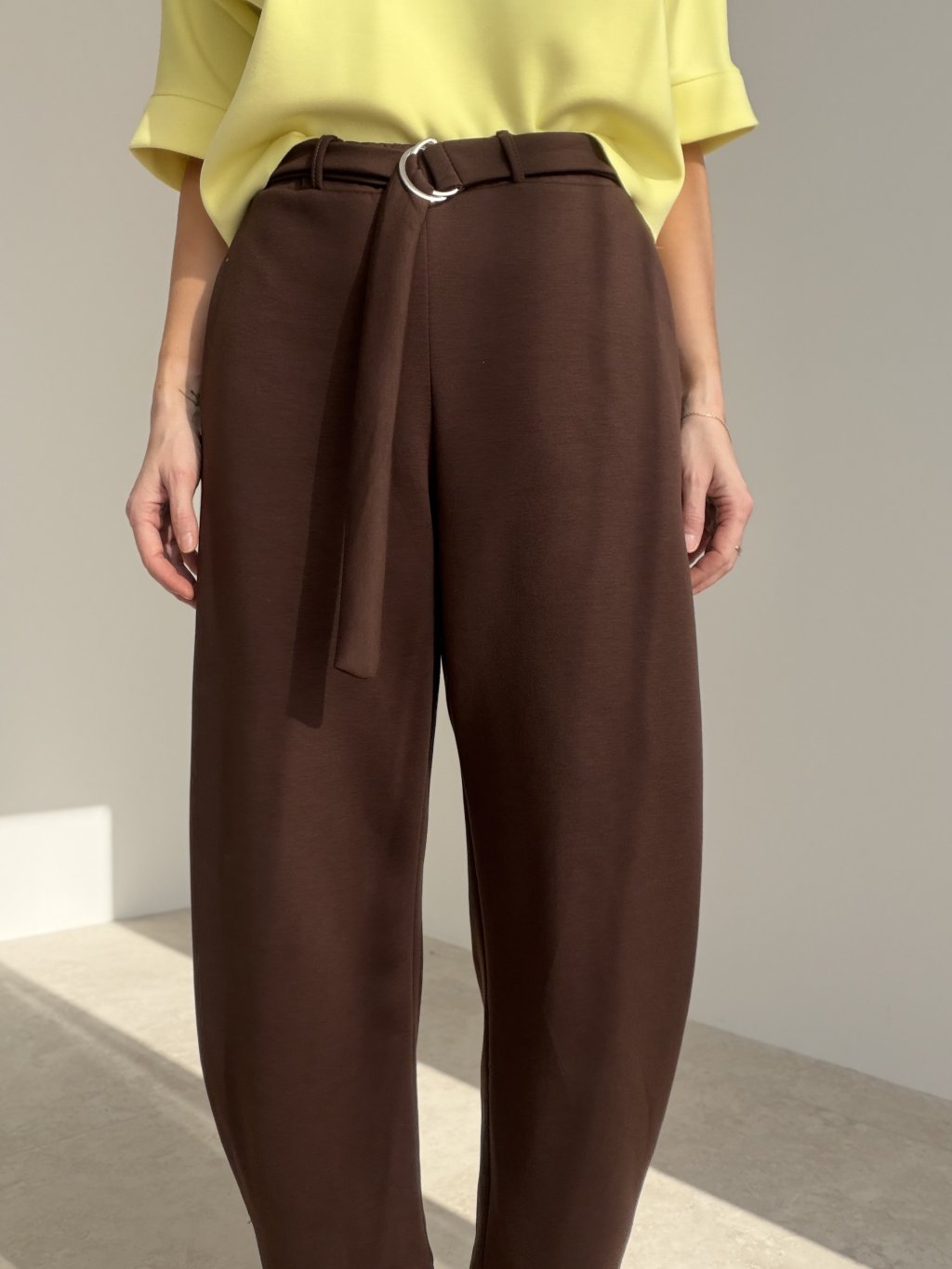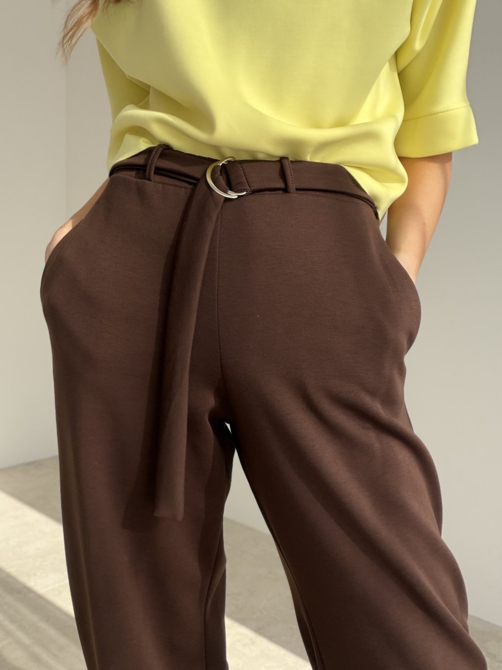 Wygodne spodnie dresowe z wyższym stanem, luźniejszym prostym krojem i paskiem z metalową klamrą. Kieszenie boczne i minimalistyczne linie sprawdzą się na co dzień.