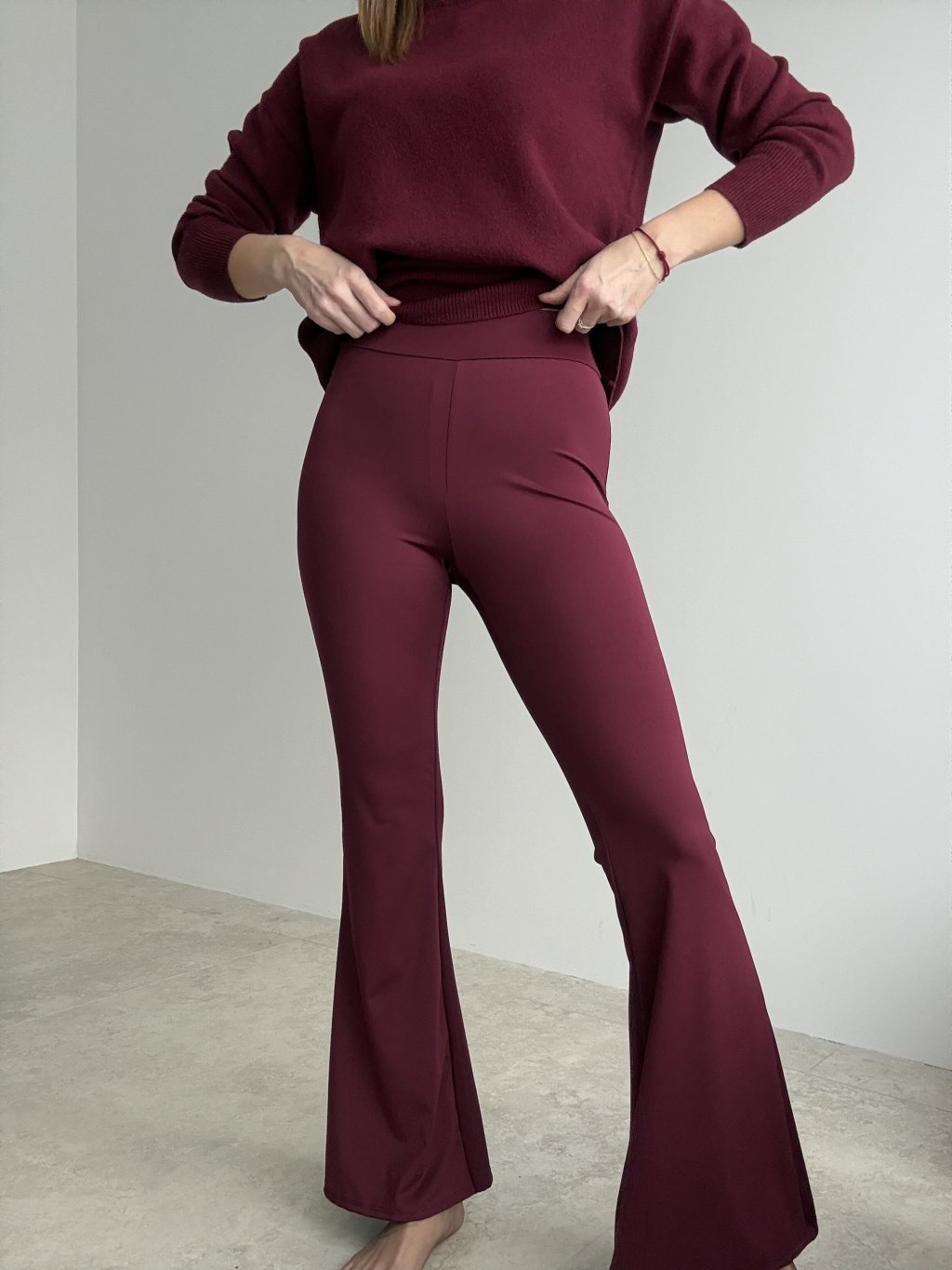 Wygodne, elastyczne spodnie z wysokim stanem, które pięknie opinają sylwetkę i podkreślają kobiece kształty. Gładki przód bez zapięcia tworzy czystą linię, a szeroki pas delikatnie modeluje brzuch i utrzymuje spodnie na swoim miejscu przez cały dzień. Krój jest dopasowany na udach i lekko rozszerzany u dołu, co optycznie wydłuża nogi. Z tyłu znajduje się subtelne marszczenie, które podkreśla i wizualnie unosi pośladki. Miękki, przyjemny w dotyku i rozciągliwy materiał dopasowuje się do ciała, dzięki czemu spodnie są idealne na co dzień – do miasta, biura i na czas wolny. Świetnie wyglądają w zestawie z dopasowanym topem, golfem lub oversize’owym swetrem oraz z trampkami i botkami.