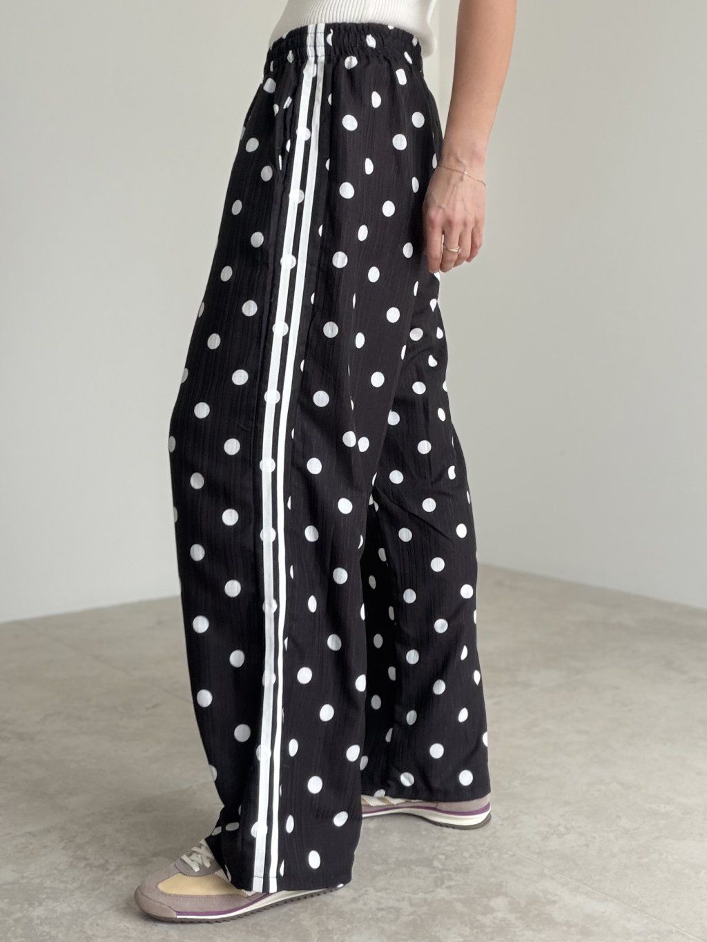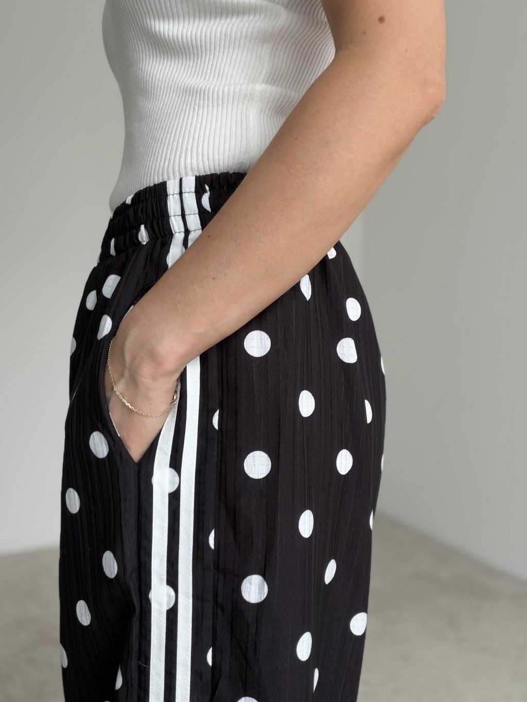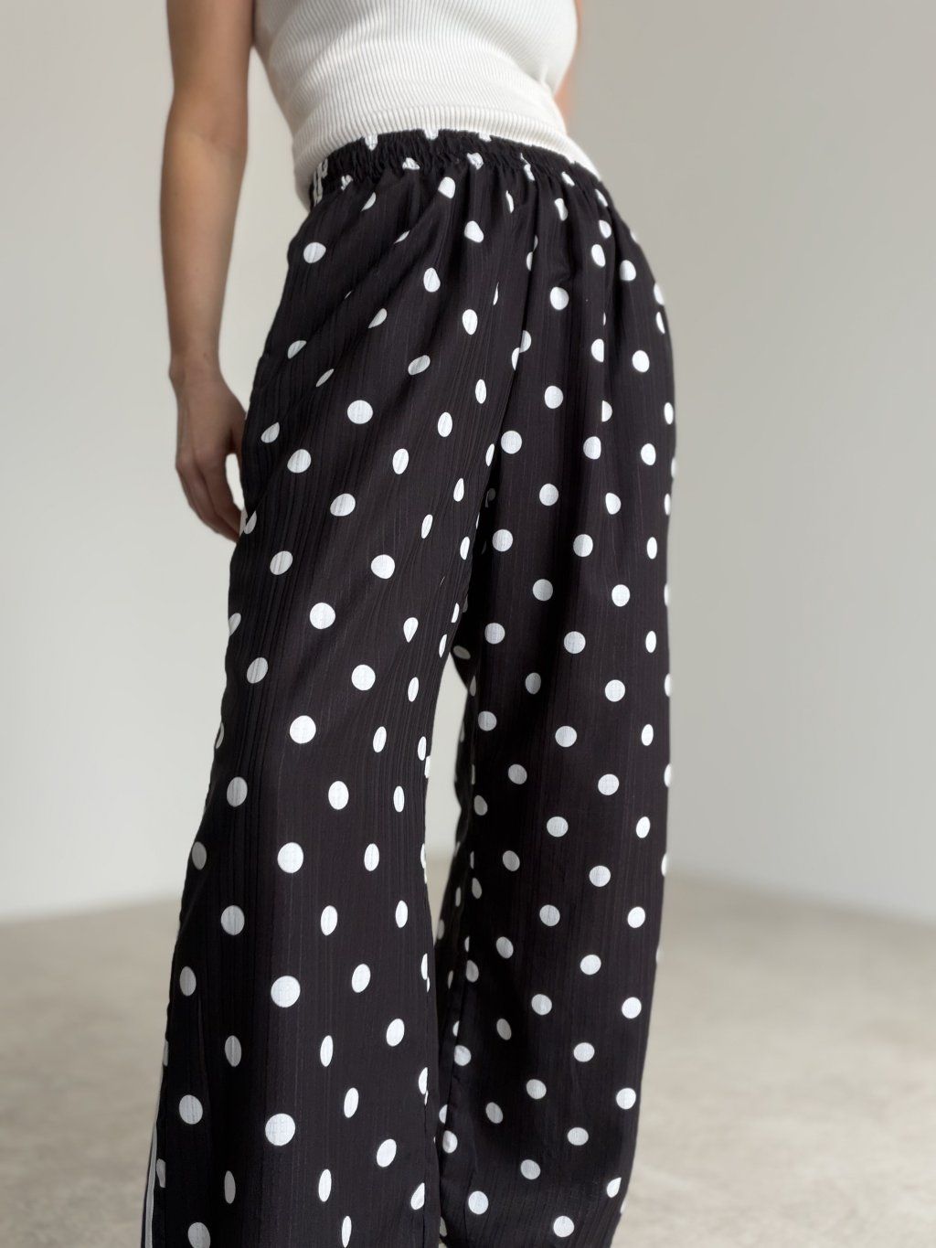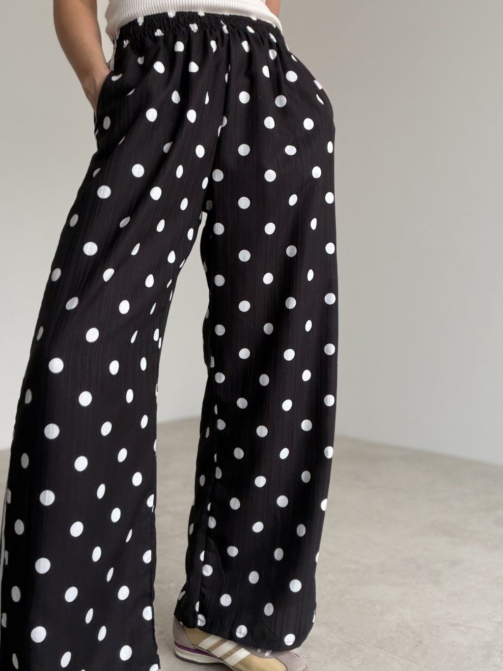 Spodnie w kropki to stylowy, a jednocześnie bardzo wygodny element garderoby, który nadaje stylizacji lekkości, kobiecego charakteru i nowoczesnego wyglądu. Mają luźny, zwiewny fason oraz elastyczną talię, dzięki czemu są komfortowe w noszeniu przez cały dzień i pięknie dopasowują się do sylwetki. Lekki materiał prezentuje się elegancko, delikatnie układa się w ruchu i sprawia, że te spodnie są idealnym wyborem na co dzień, na wakacje oraz na luźniejsze dni, kiedy chcesz wyglądać stylowo i czuć się swobodnie.