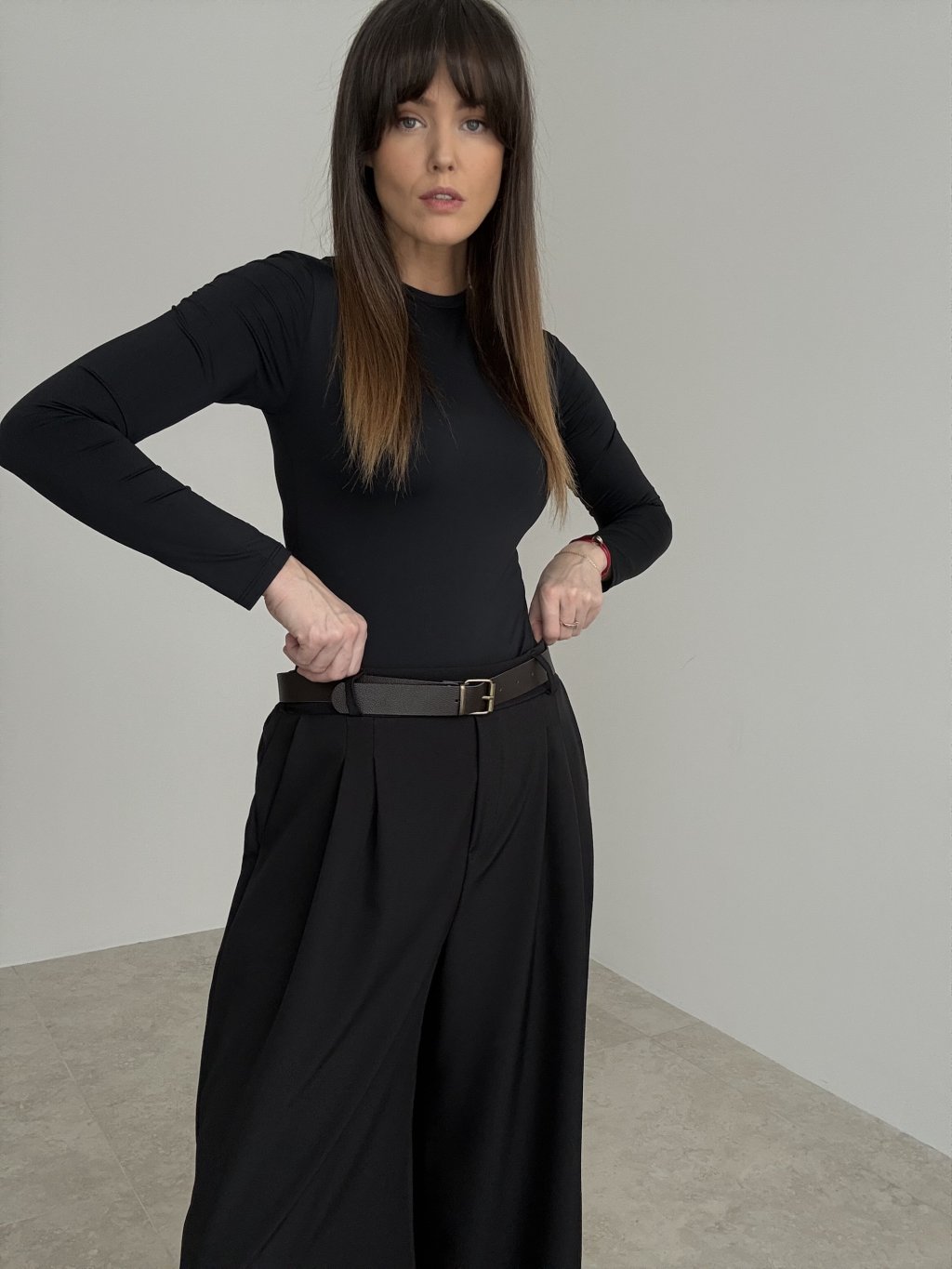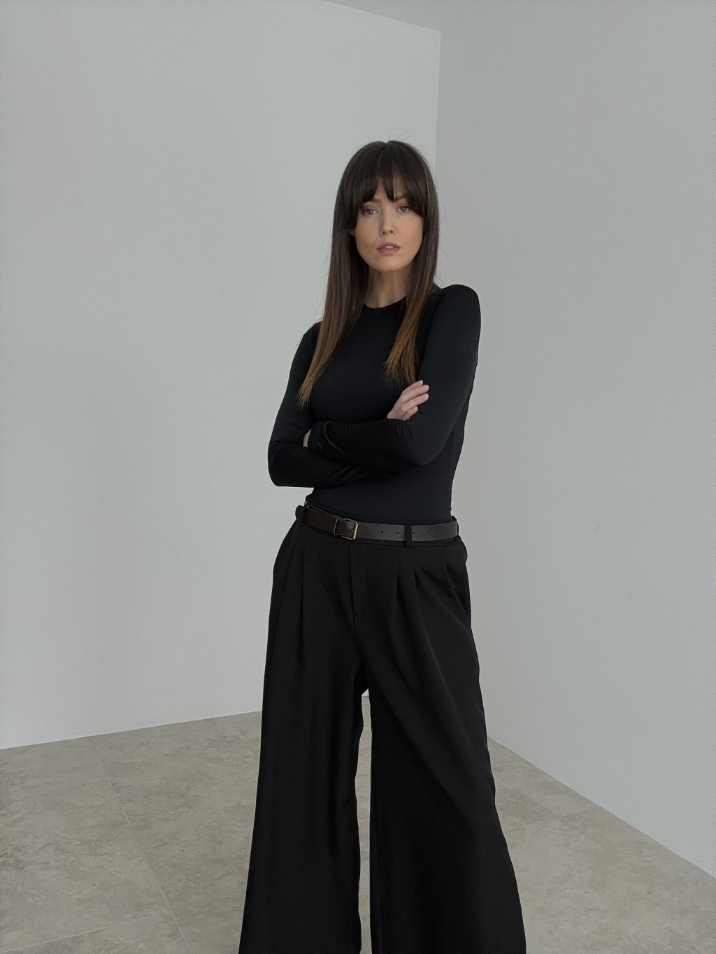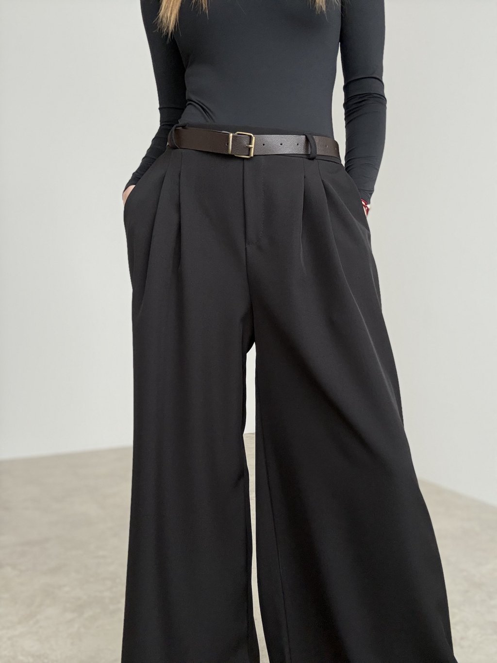 Eleganckie spodnie z szerokimi nogawkami wyróżniają się swobodnym krojem i ponadczasowym wyglądem. Wykonane z wysokiej jakości materiału, który zachowuje kształt i zapewnia komfort przez cały dzień. Wysoki stan optycznie wydłuża sylwetkę, a zakładki z przodu dodają spodniom objętości i elegancji. Idealne do pracy, na spotkania czy na co dzień w połączeniu z dopasowanym topem lub body.