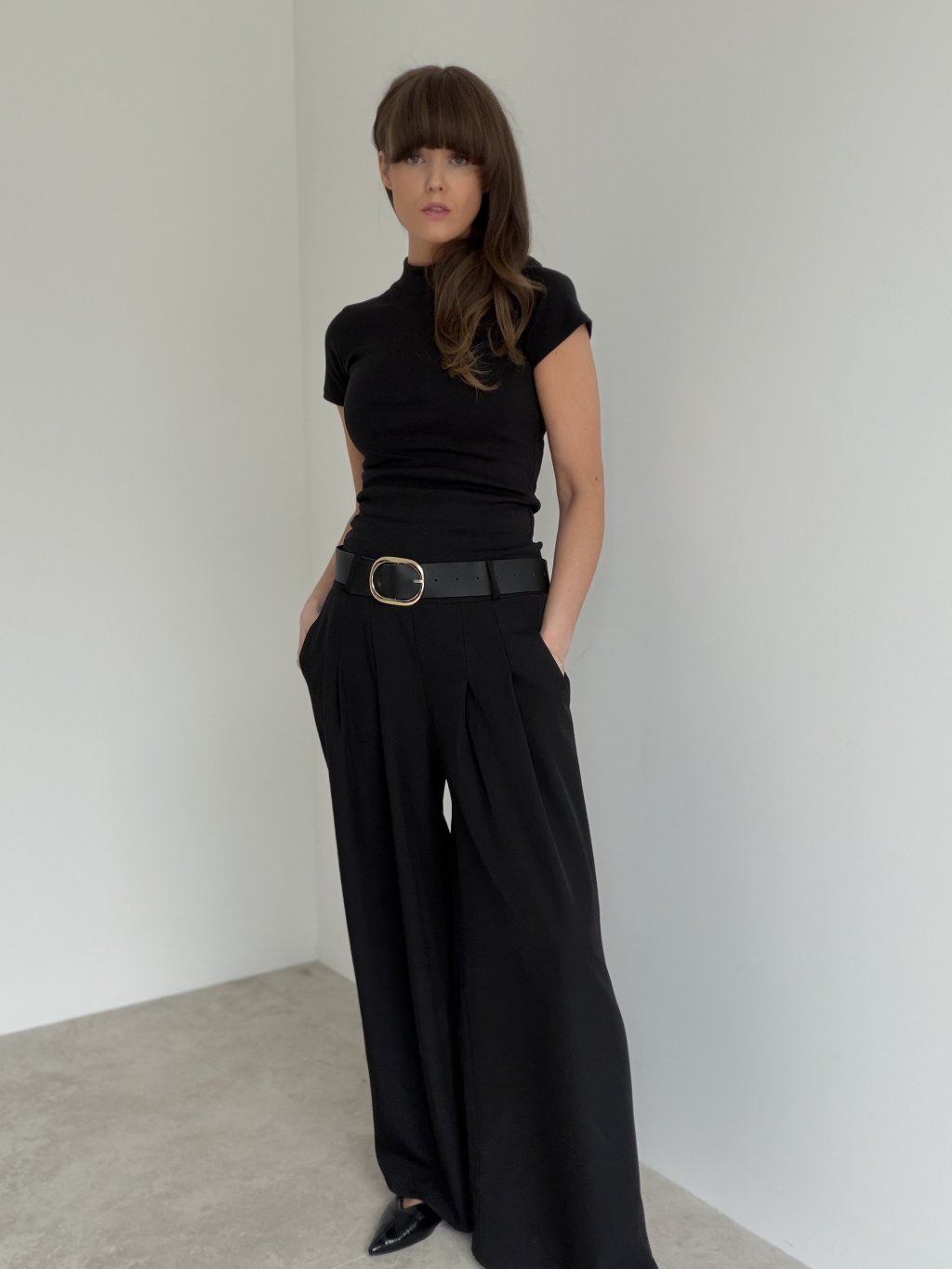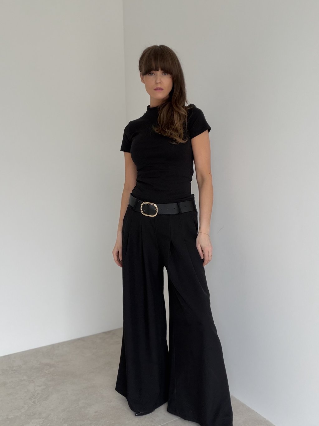 Eleganckie spodnie z szerokimi nogawkami, które pięknie wydłużają sylwetkę i nadają stylizacji dopracowany charakter. Krój podkreśla talię, a jednocześnie zapewnia wygodę w ciągu dnia. Delikatne zakładki z przodu dodają klasy i sprawiają, że spodnie ładnie układają się w ruchu. Praktyczne kieszenie i uniwersalny fason czynią je świetnym wyborem do pracy, na spotkania oraz na wieczór – wystarczy zmienić górę i dodatki.