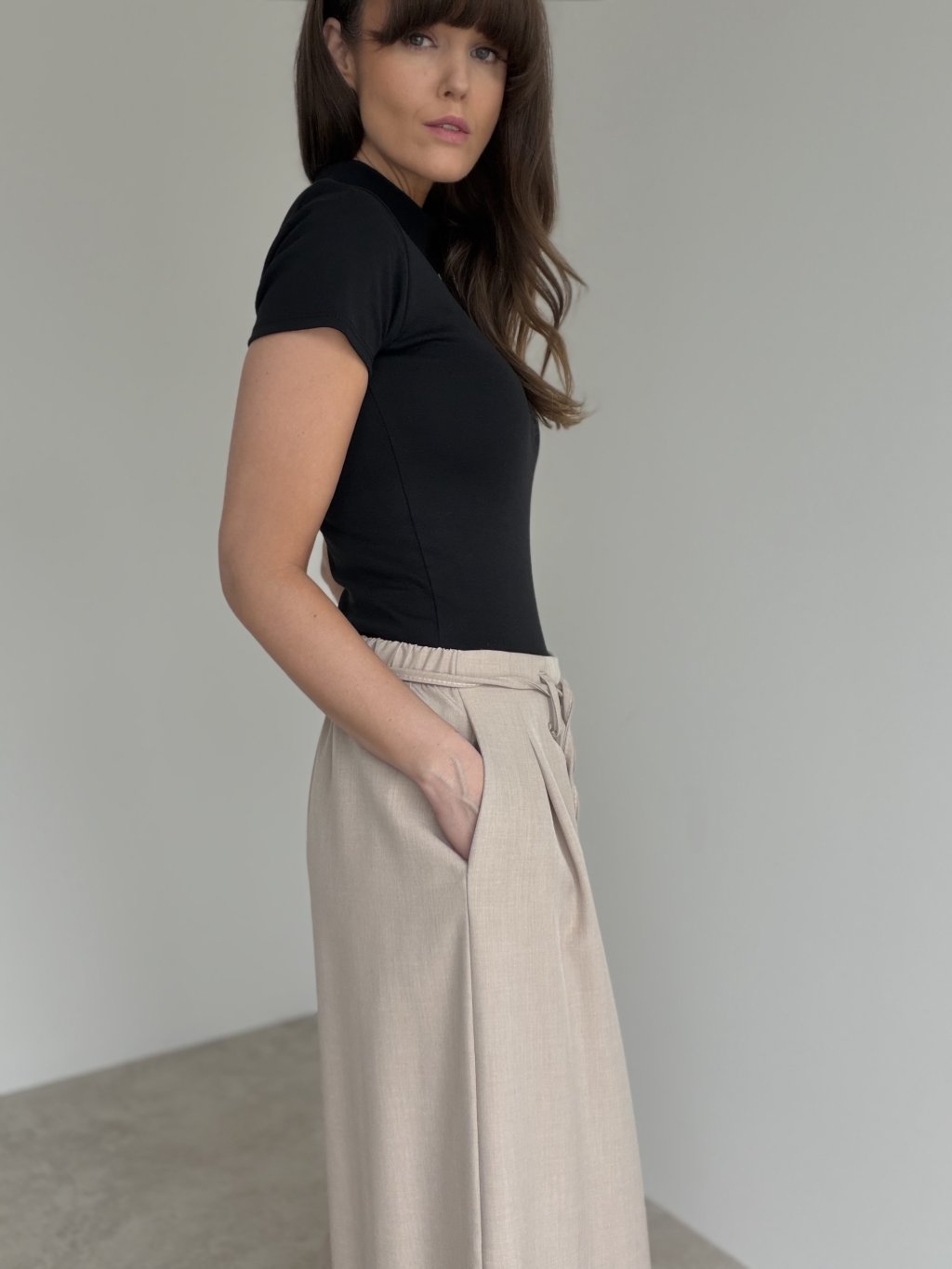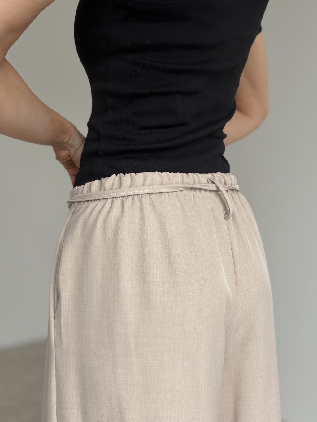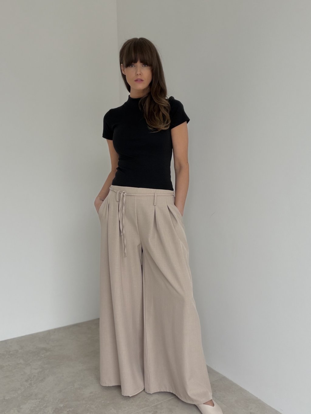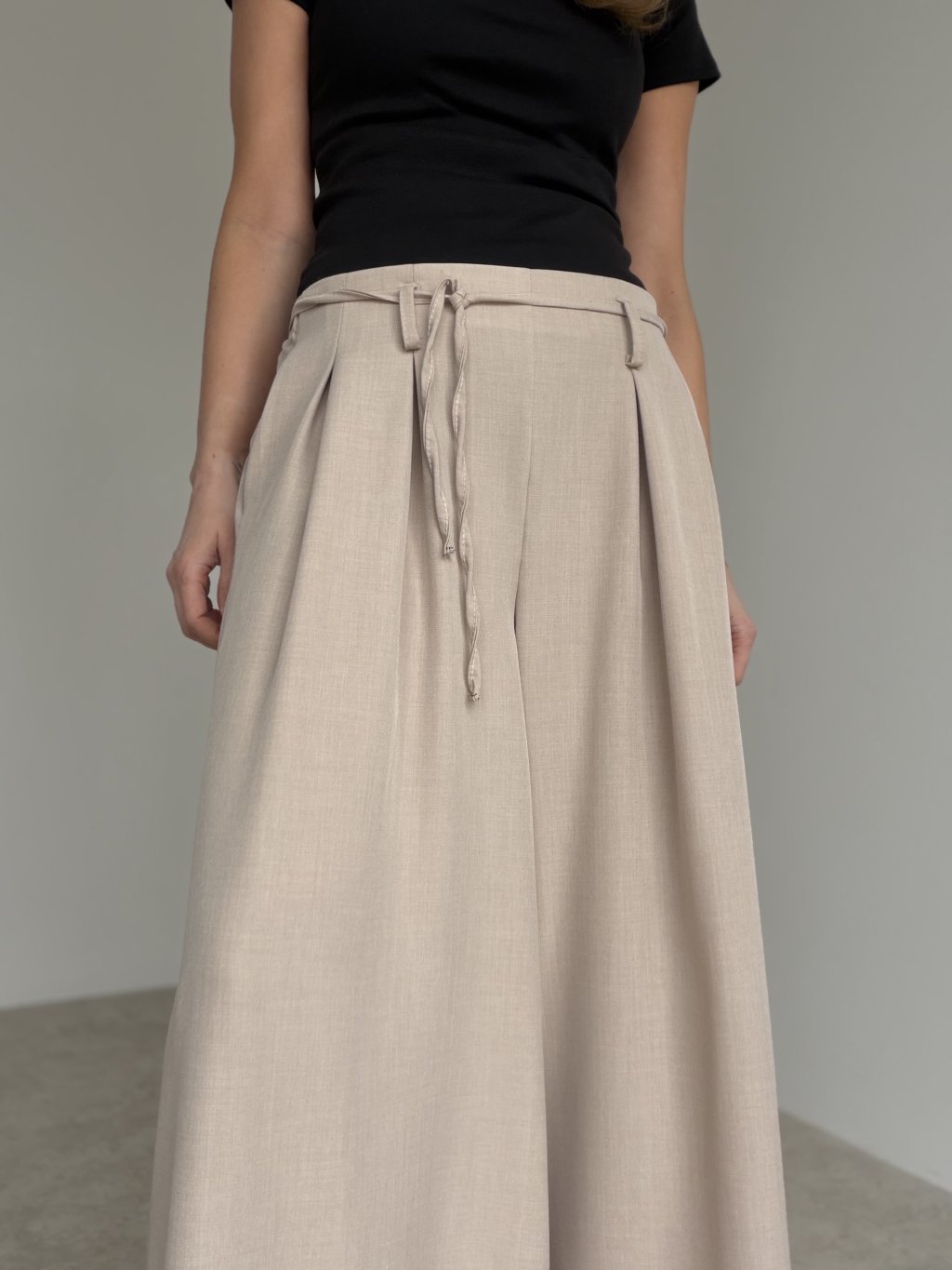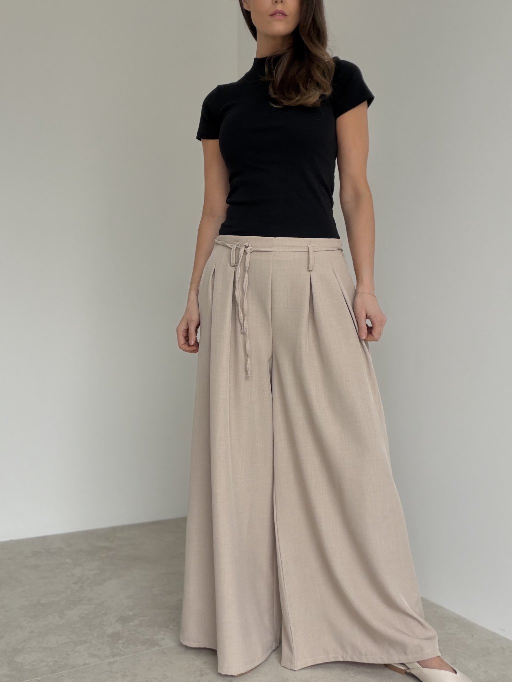 Spodnie z szerokimi nogawkami, wyższym stanem, zakładkami i wiązaniem w pasie. Lejący krój wygląda elegancko i zapewnia komfort na co dzień.